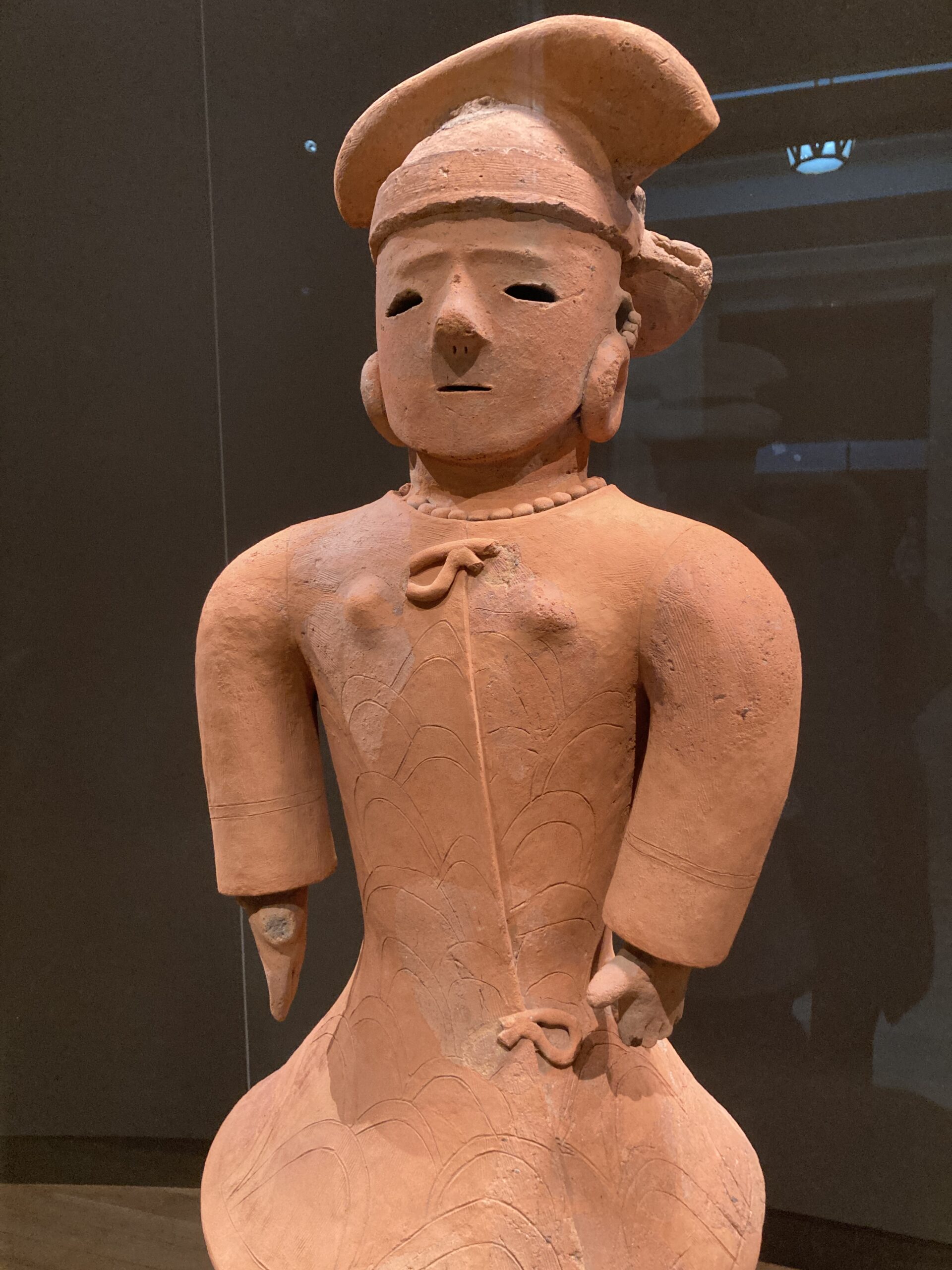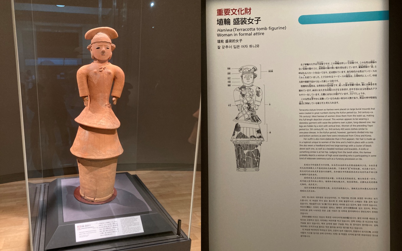 考古展示室に入ると、まずは重要文化財の盛装女子の埴輪がお出迎え、女性の埴輪は半身像が大半らしいんだけど、この埴輪は珍しい全身像。