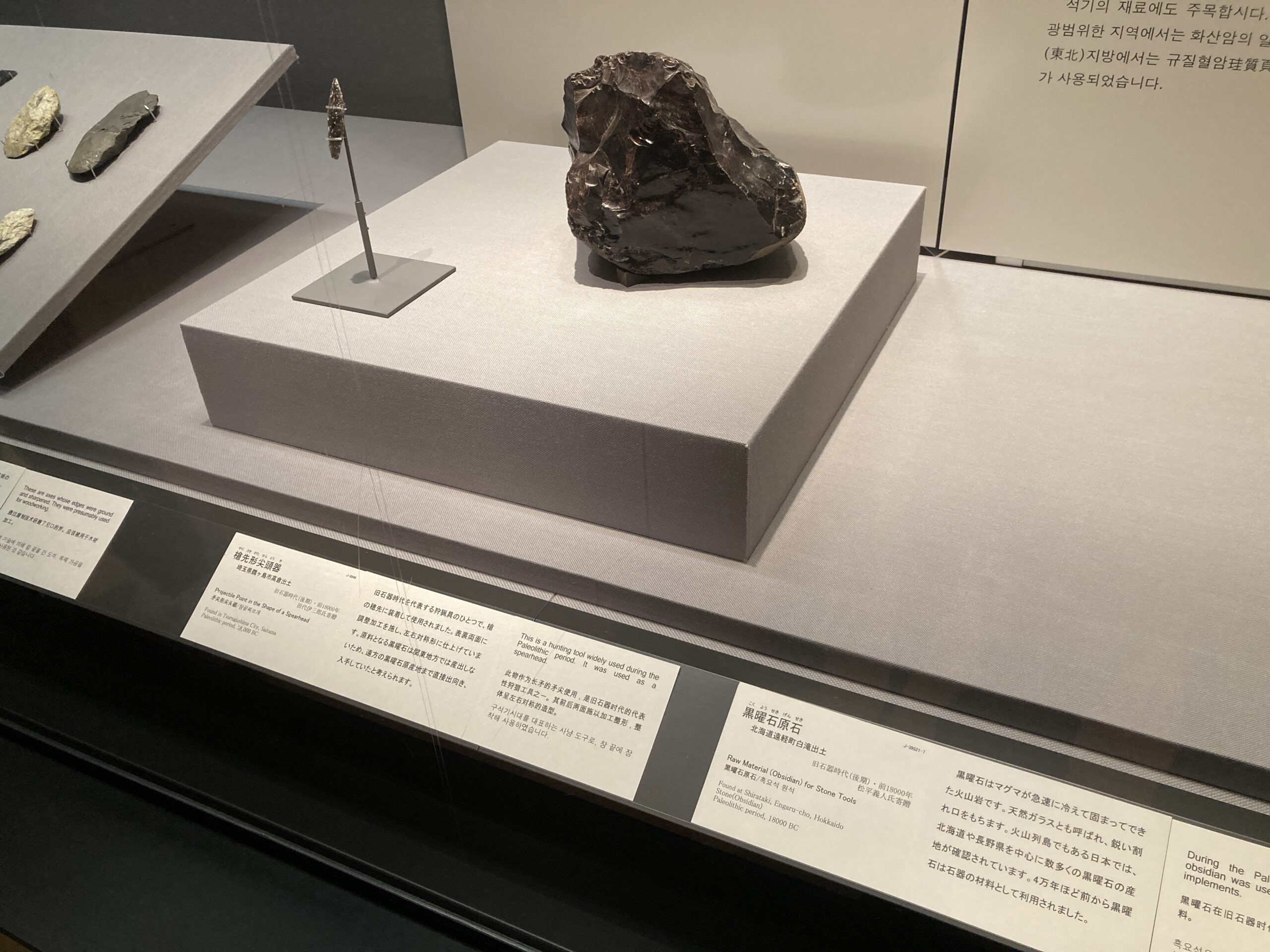 で、そんな石器の石材として使われていたのが、学校の歴史の授業でも教わる我らが黒曜石。北海道から九州地方にかけて広い地域で使われていた石。尚、黒曜石が少ない東北地方では珪質頁岩、近畿や瀬戸内地方ではサヌカイトが使われていたらしい。