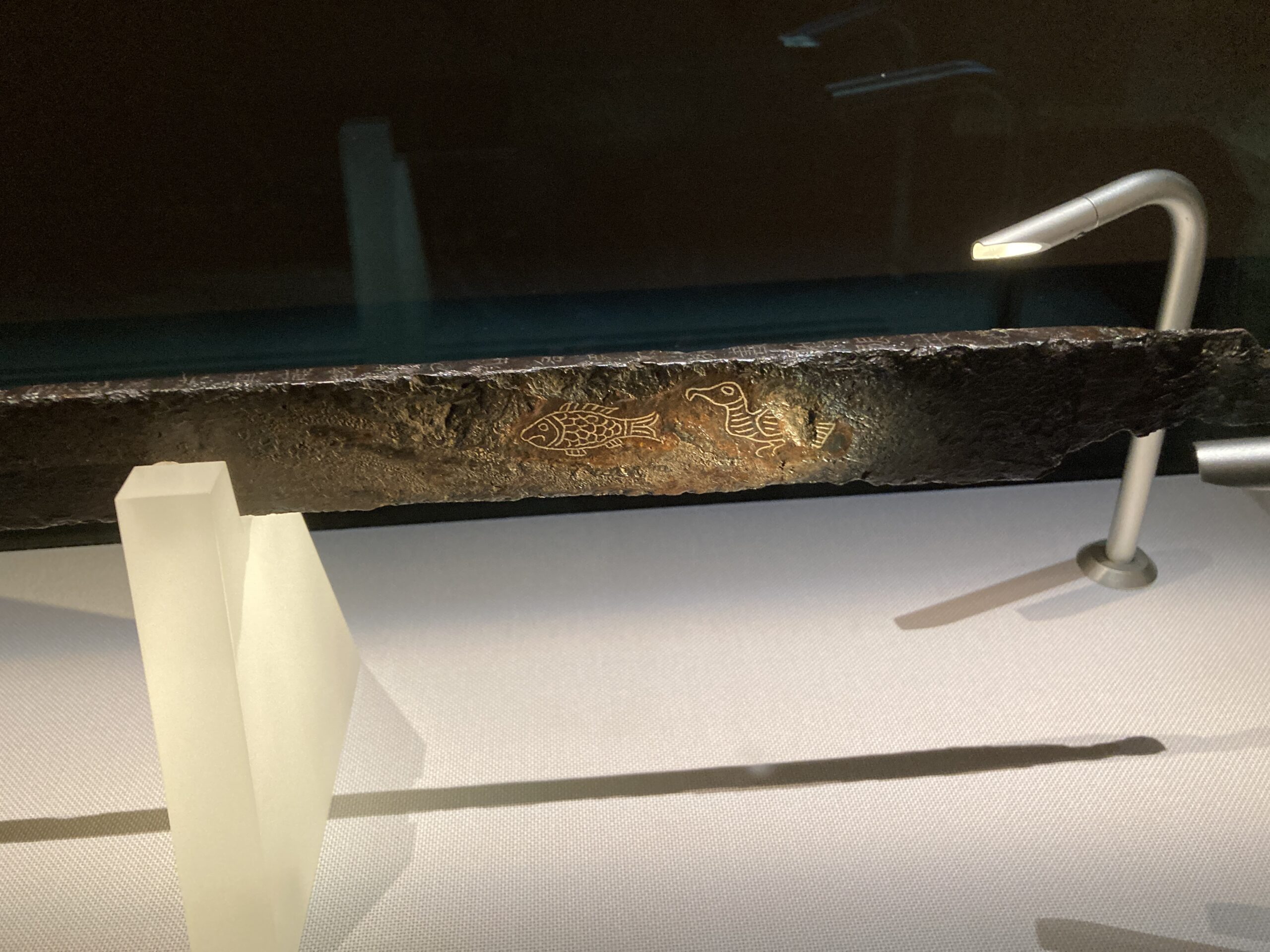 刻まれている魚と鳥の模様がかっこいい。なんか古い伝説の剣って感じがするわ。というか、実際に古いんだけど。