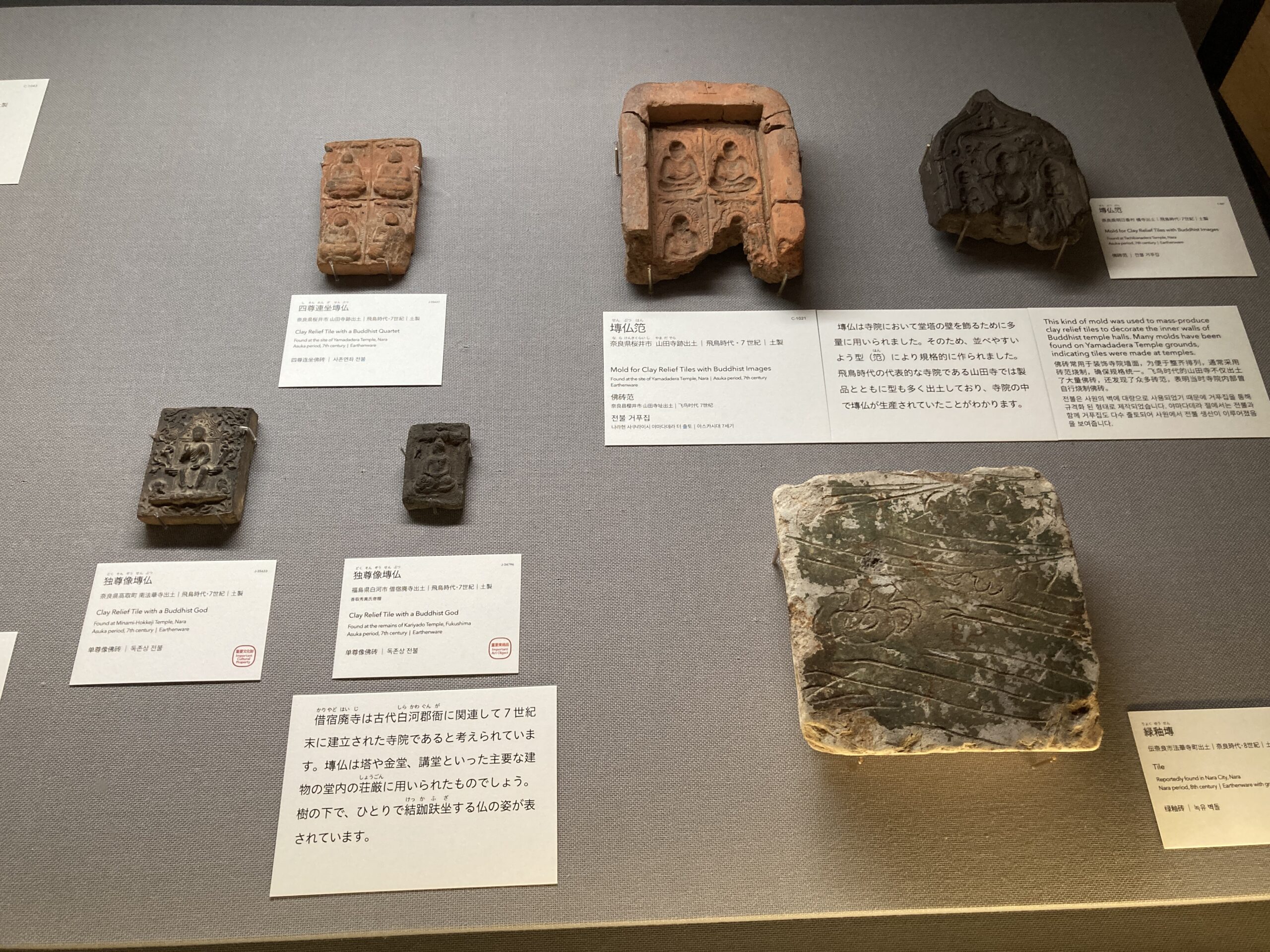 塼仏は粘土板に、仏や菩薩像などを浮彫状に表現したものです。木の型(笵型)に粘土を押し当てたものを乾燥されて焼いた後に、絵の具や漆で塗ったり、金箔(金泥)などで飾ったりした、きらびかやかなものです。寺院の内壁の装飾に使われたと考えています。日本では7世紀後半から8世紀前半の寺院跡から出土することが多く、とくに畿内の寺院での出土が多いといえます。