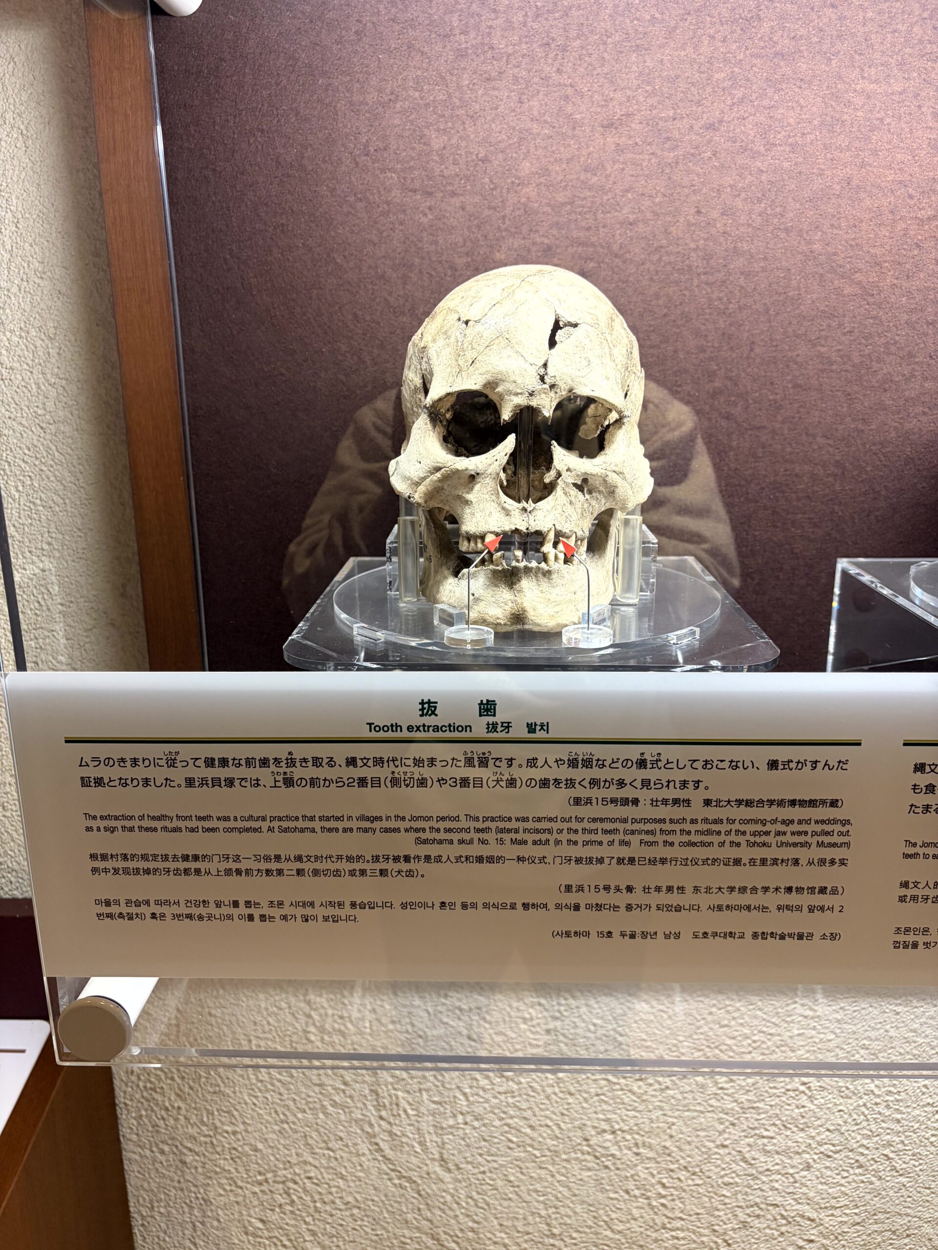 ムラの決まりに従って健康な前歯を抜き取る縄文時代に始まった風習。成人や婚姻などの儀式として行い、儀式が済んだ証拠となった。里浜貝塚では、上顎の前から2番目(側切り歯)や3番目(犬歯)を抜く例が多くみられるのだそう。