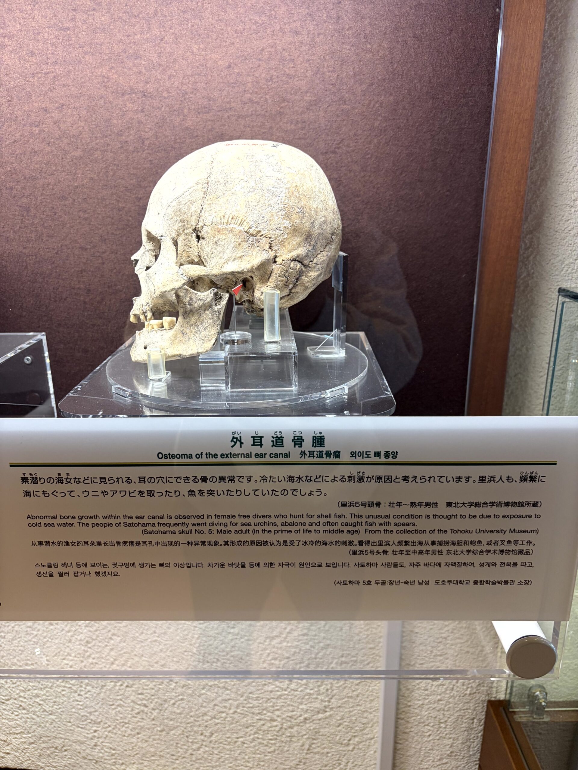 外耳道骨腫。海女などに見られる耳の穴にできる骨の異常。冷たい海水などによる刺激が原因と考えられている病気。このことから、里浜人も頻繁に海に潜って、ウニやアワビを取ったり、魚を突いたりしていたと考えられる。