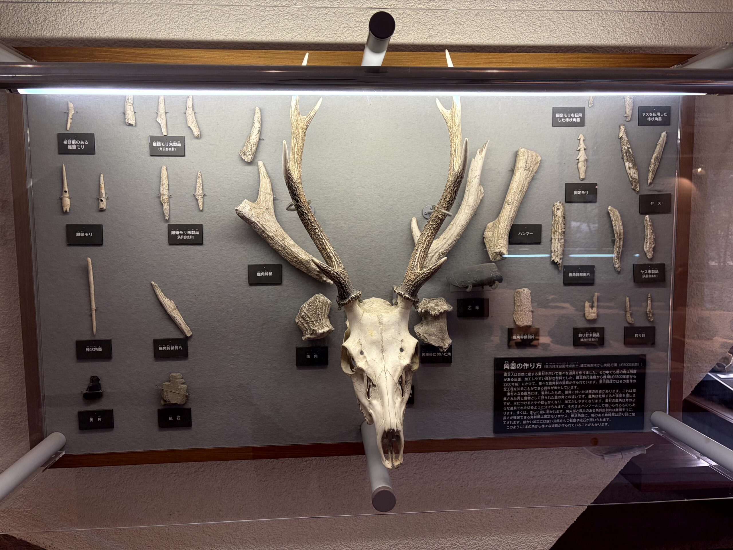 縄文時代の展示物といえば、土器や土偶が多いんだけど、この博物館は、土製品ではなくて、人骨や獣骨や骨角器の展示の方が多いのが面白かった。