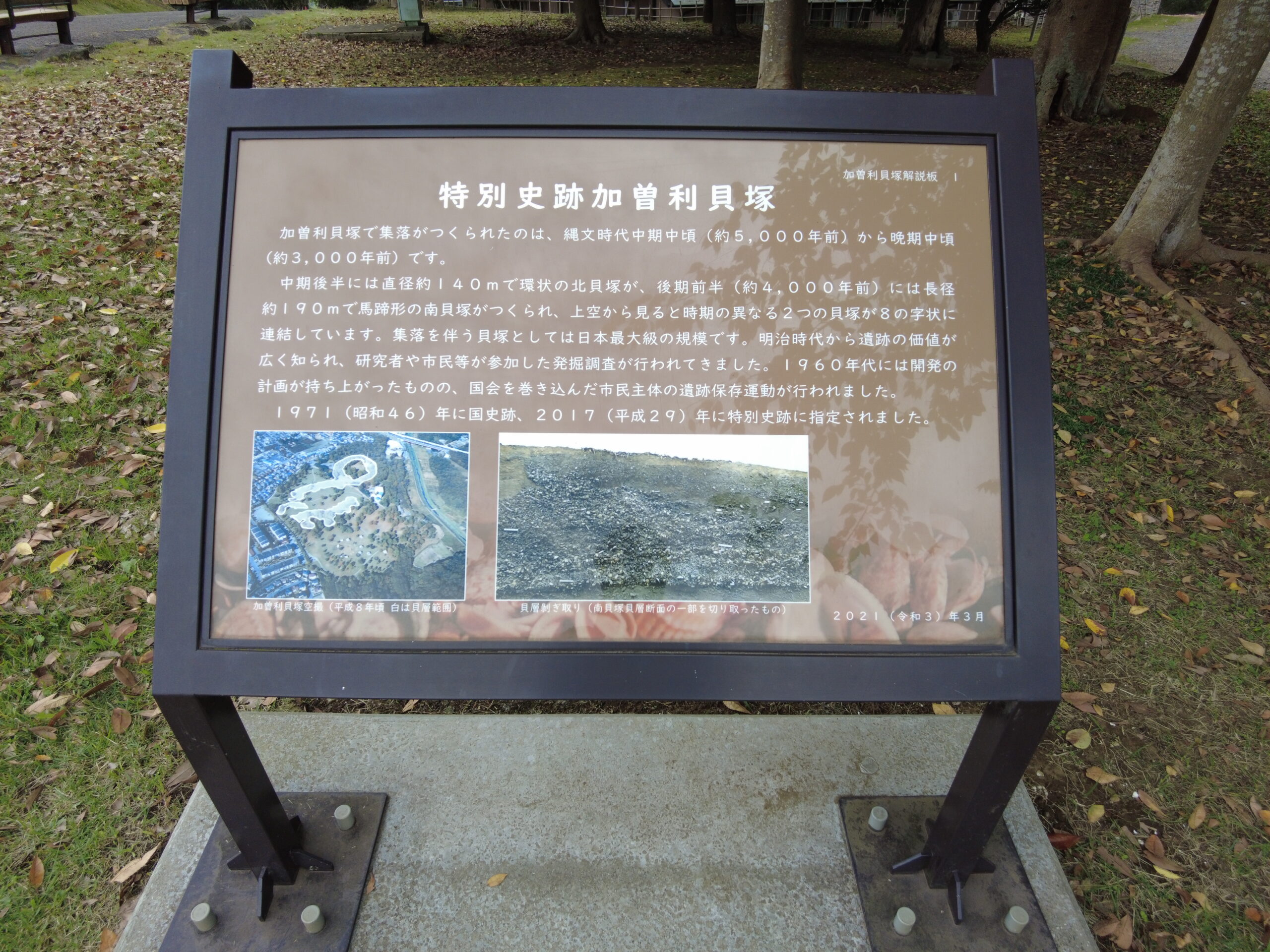 縄文時代の遺跡で「特別史跡」に指定されている遺跡は、全国で4カ所、「三内丸山遺跡(青森県)」「大湯環状列石(秋田県)」「尖石石器時代遺跡(長野県)」、そして「加曽利貝塚(千葉県)」、とても学術的に価値が高い遺跡ということで、大切に守られています。