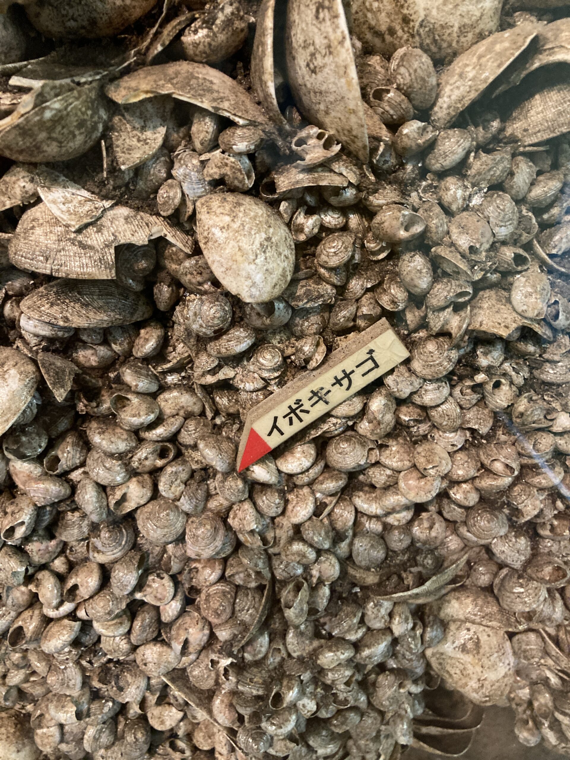 貝塚に含まれている貝の種類は約60種類、ポピュラーなところだと、ハマグリ・アサリ・シオフキガイ・カキなど、だけど全体の約85%くらいはイボキサゴという小さな貝で構成されています。(イボキサゴは小さすぎて食用には向いていないので、出汁とかに使われていたのではないかとのこと)。あと、南加塚の特徴としては、イノシシ・シカなどの獣の骨が多く混じってくるんだとか。