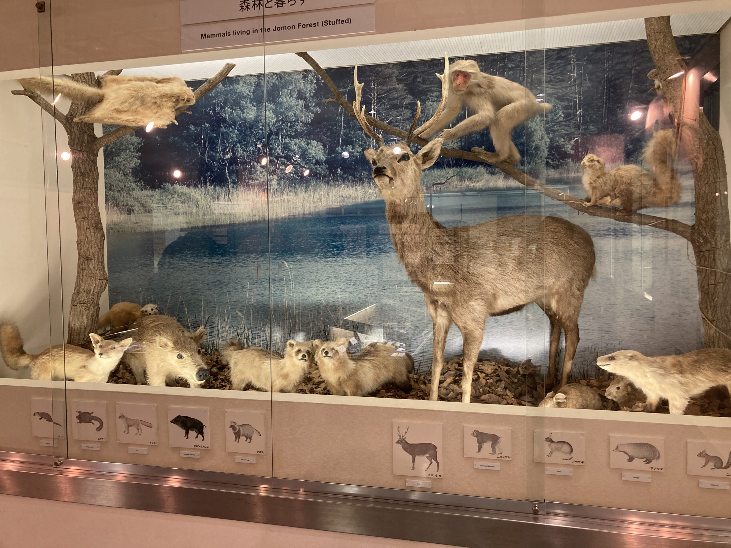 約1万6千年前~1万5千年前に温暖化が始まり、1万年くらい前には植生が針葉樹から広葉樹へ変化。そして、約6千年前にはさらに海水面が内陸へと進んだ。これがいわゆる「縄文海進」というやつ。でもって、温暖化してくるとナウマンゾウやヘラジカなどの大型動物がいなくなり、シカやイノシシなどの中型動物が主流になったそうな。