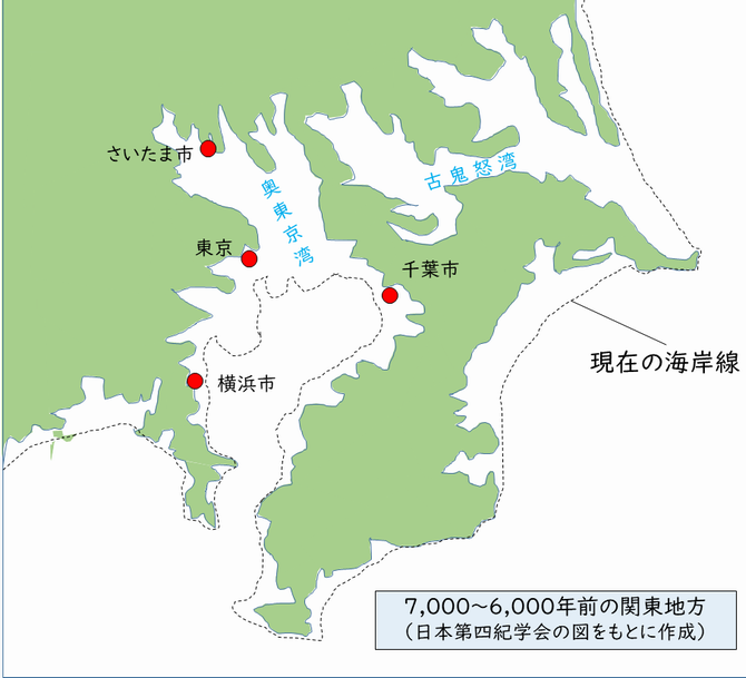 その後、今度は寒冷化が進み、縄文時代後期(約4千年くらい前)に現在と同じくらいの位置まで海岸線が下がってきて落ち着いたんだそうな。
