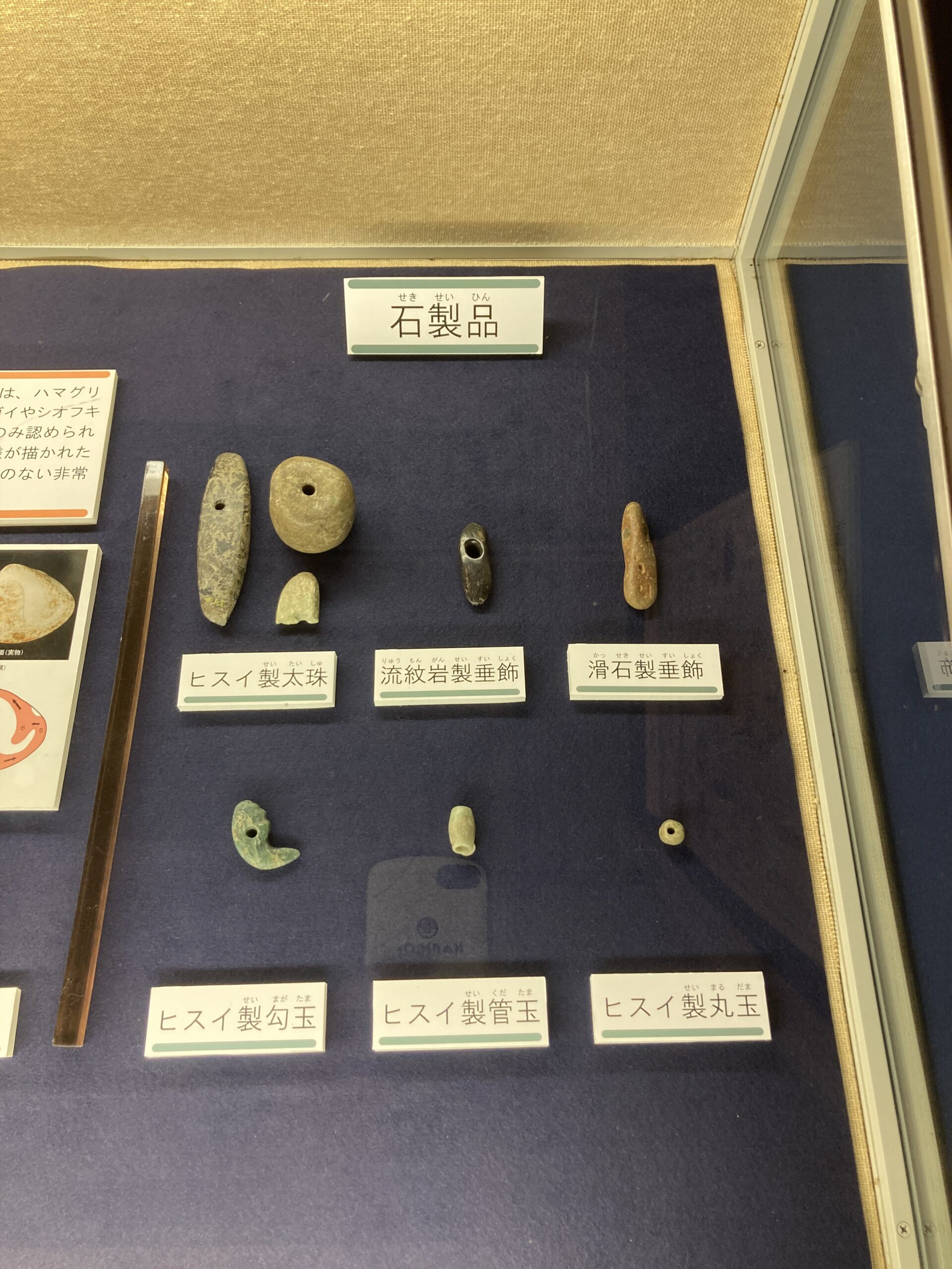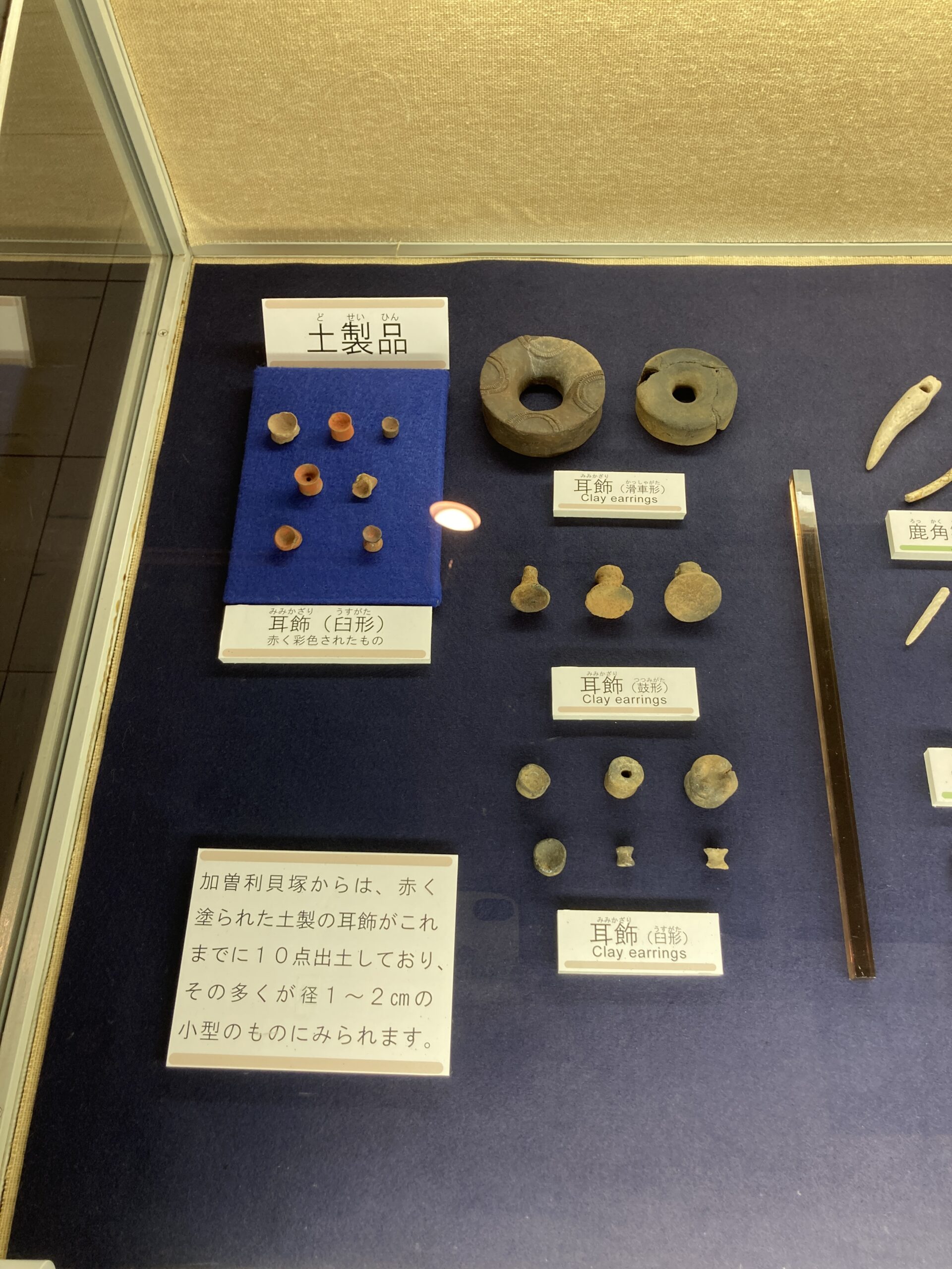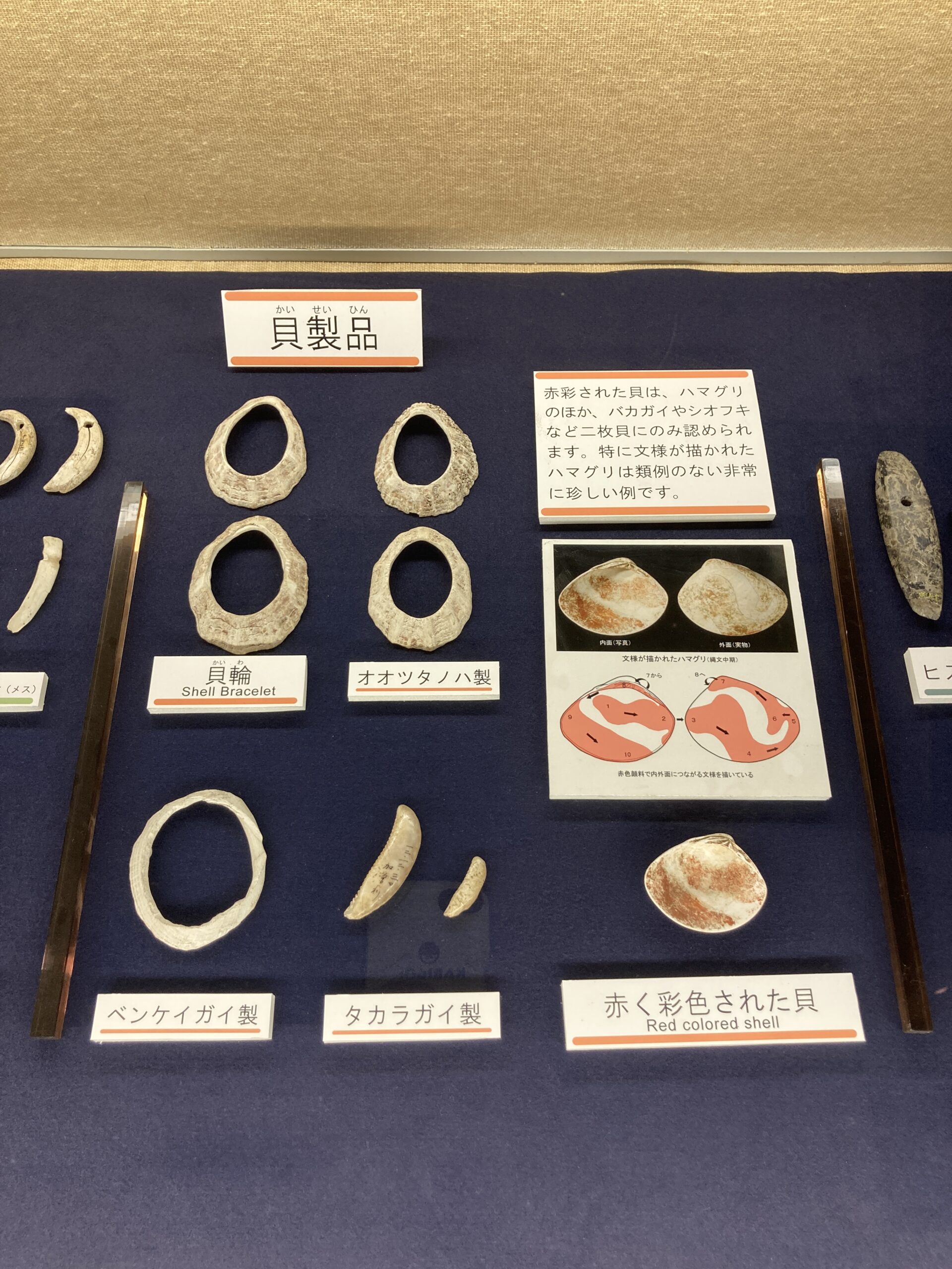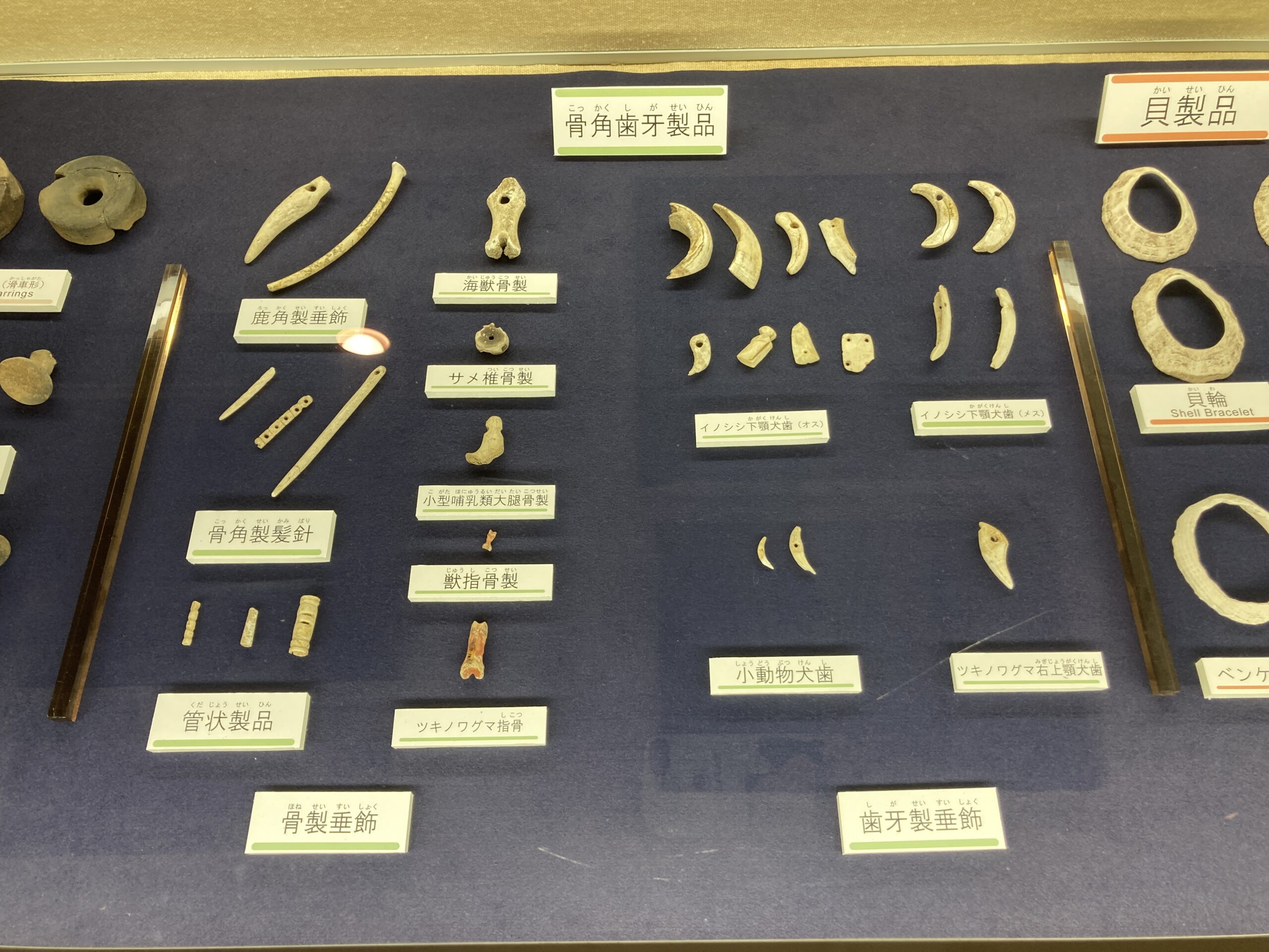 加曾利貝塚では、石製品・貝製品・骨格歯牙製品・土製品なども出土している。石製品でも翡翠はおそらく新潟県の糸魚川辺りとか、貝製品でもオオツカノハは伊豆七島の辺りとか、骨格歯牙製品でもツキノワグマの犬歯とか、加曾利貝塚の辺りでは素材が手に入らない物も多い。