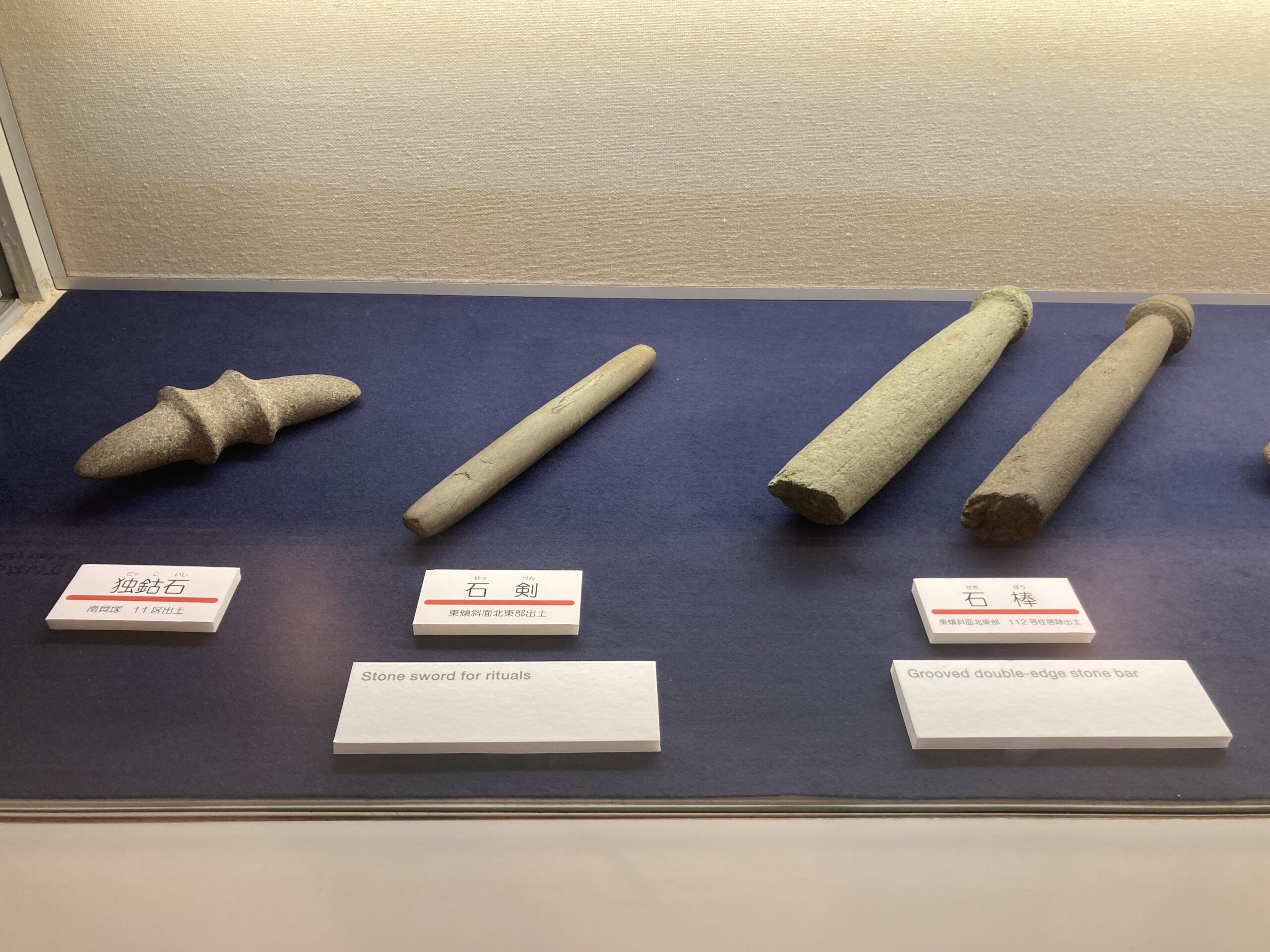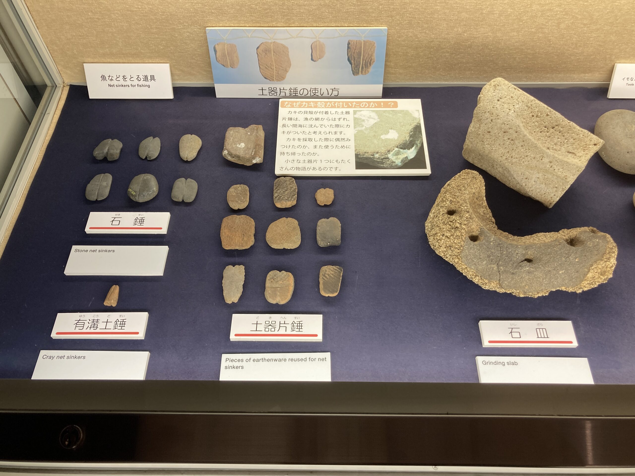 加曾利貝塚の石器で面白いのが、重し用の石があること。そのことから、網漁をしていたと考えられる。尚、千葉県は石が採れないので、長野県・新潟県・伊豆諸島などなど、いろいろな地域から石が運ばれてきていたらしい。