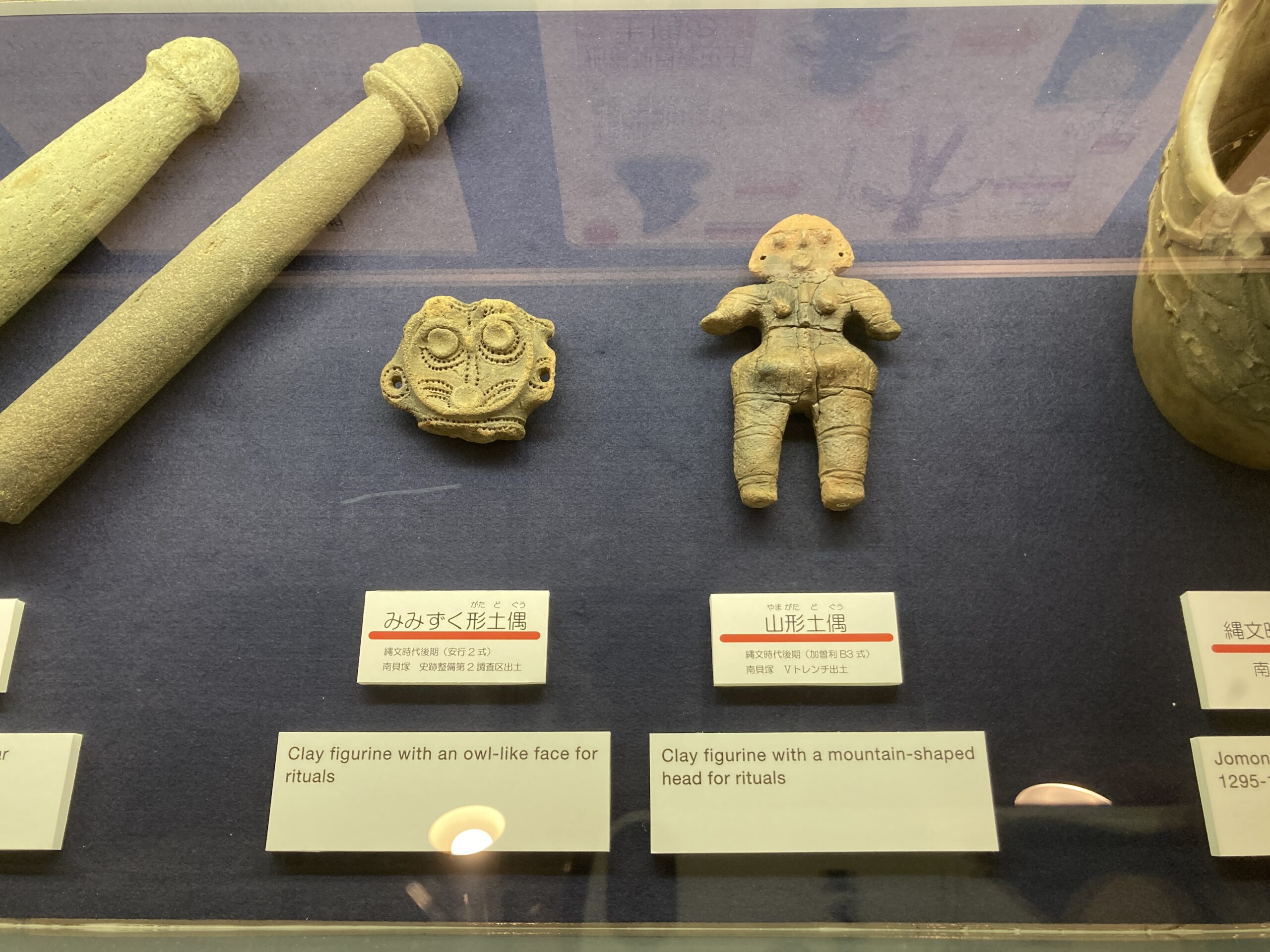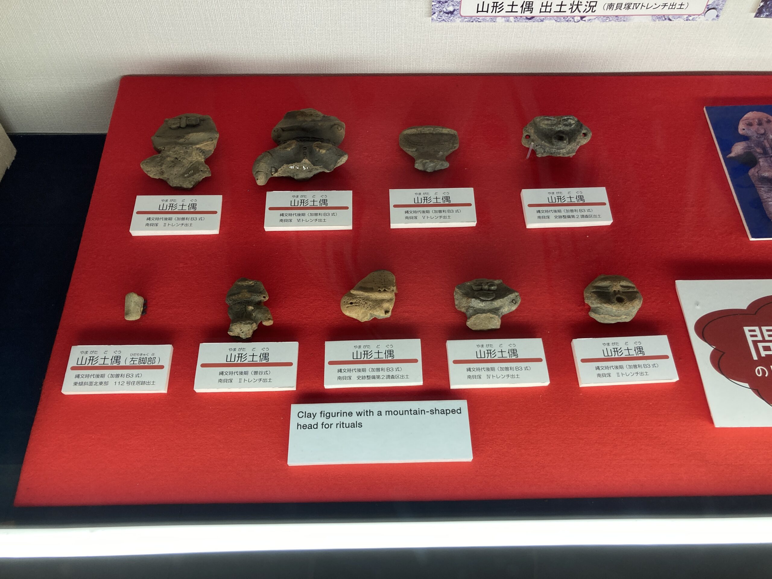 加曾利貝塚からは、石棒の他、約100体の土偶が出土していて、見つかっている土偶は主に「山形土偶」と「みみずく土偶」だが「遮光器土偶」も少しだが見つかっている。