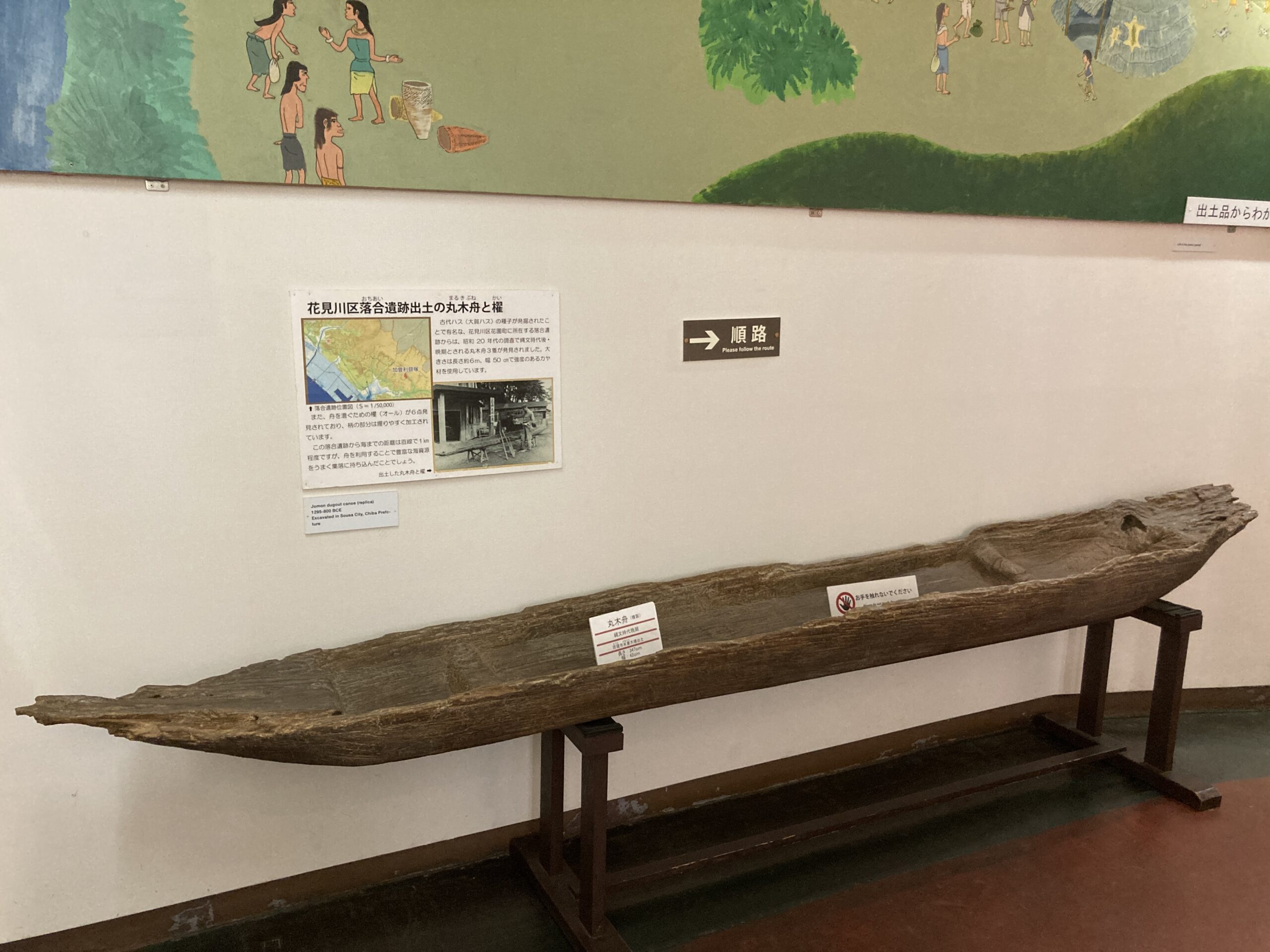 縄文時代の丸木舟。展示物は複製品だが、造りはほぼ同じ。ポイントは船の内部に横方向にわざと削り残しを作って船の耐久性を高めている。土器の内部をハマグリで撫でるのと同じ縄文人の知恵。