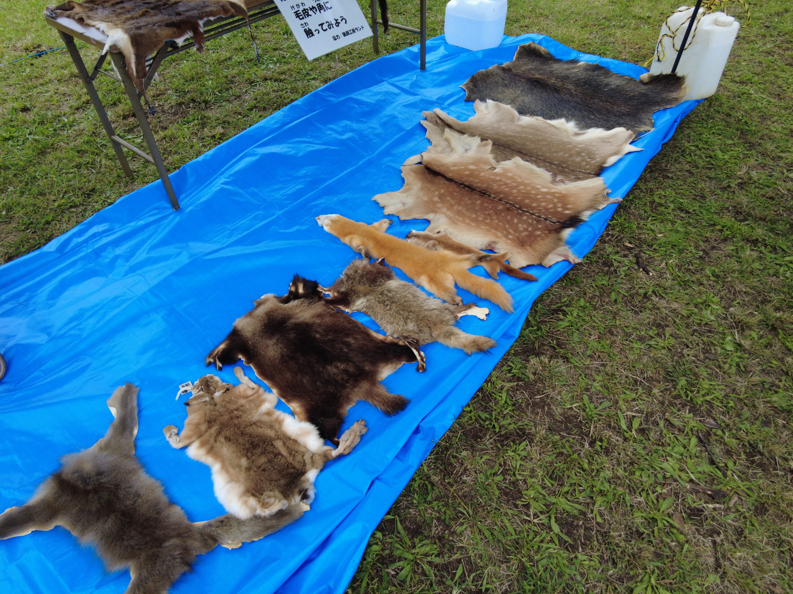縄文時代にもいた動物たちの毛皮。左から「サル⇒ウサギ⇒アナグマ⇒タヌキ⇒テン⇒イタチ⇒シカ秋⇒シカ冬⇒イノシシ」。手触りはテンが断トツに気持ちいい。