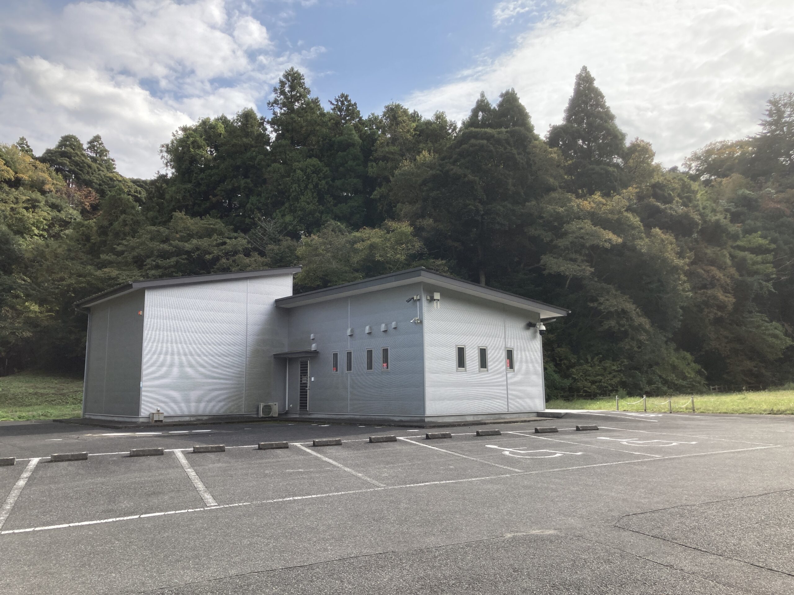 というわけで、現地に到着。立派な施設と駐車場があるけど誰もいない。でもトイレは24時間利用可能らしいので、夜のお墓でお化けと運動会をしたければ良さそう。あとどうだろう?監視カメラがあるから大丈夫だろうけど、一昔前なら不良のたまり場にもなっていそう。