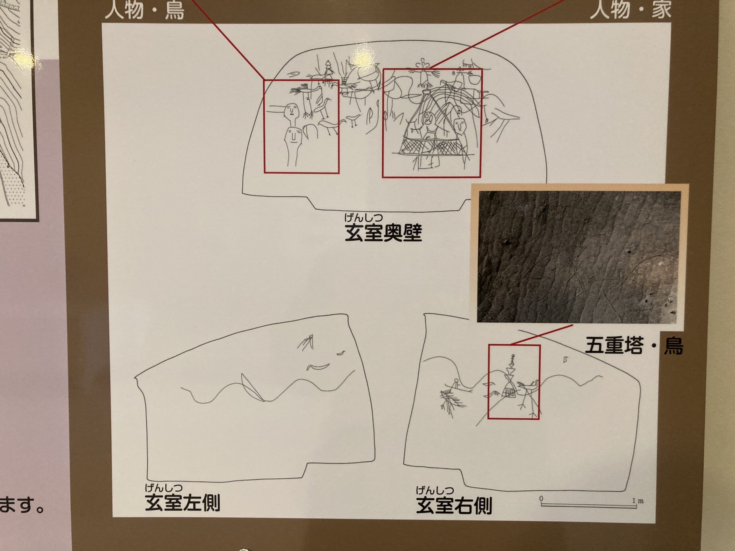 資料館の中は、横穴墓の解説や近所の遺跡の遺物などが展示されている。中でも一番メインになるのが、第13号墓の線刻画の原寸大レプリカ。モチーフは、主に人物・鳥・五重塔・舟に乗った人などが描かれている。