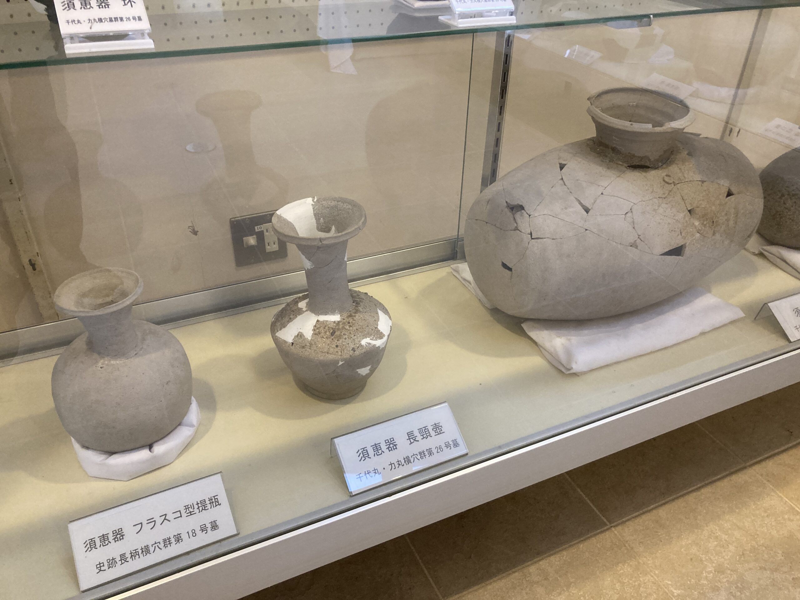 あと、史跡長柄横穴群の北側にも同じような横穴群「千代丸・力丸横穴墓群」がある。そちらでは、多くの遺物がぼ全域から見つかったらしい。長柄横穴群資料館に展示してある遺物がそれかな。因みに、長柄横穴群からは、須恵器のフラスコ型堤坪、土師器椀、刀の鞘などが出土したんだとか。