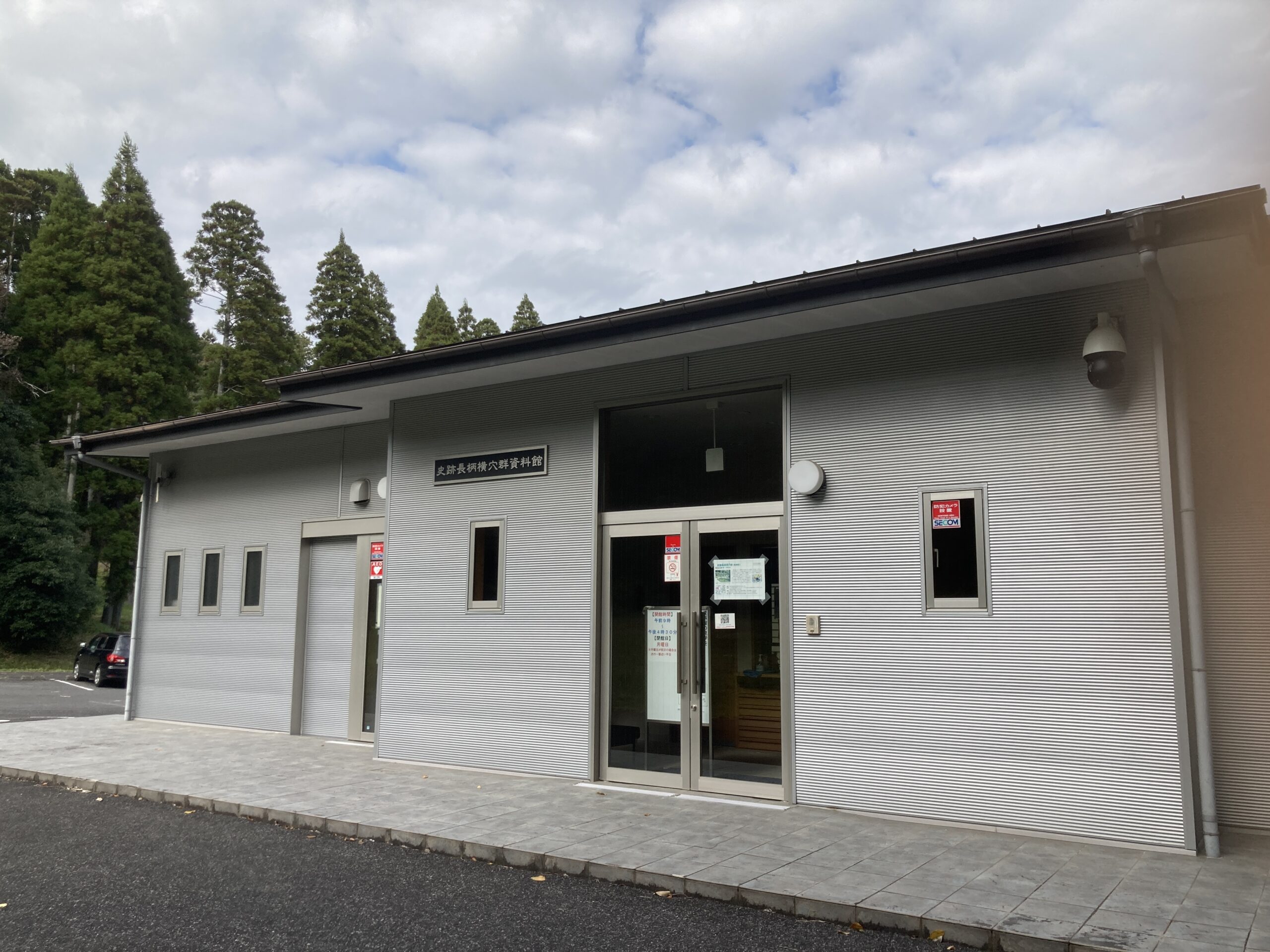 長柄横穴群には、15台くらいの駐車場と隣接の公園と資料館がある。資料館は無人で施錠されているので、中に入りたい時は、入り口横のインターホンを押すと、町の職員が応答して5分後くらいにドアを開けに来てくれるシステムになっている。尚、トイレは施錠されていないので、いつでも利用可能。