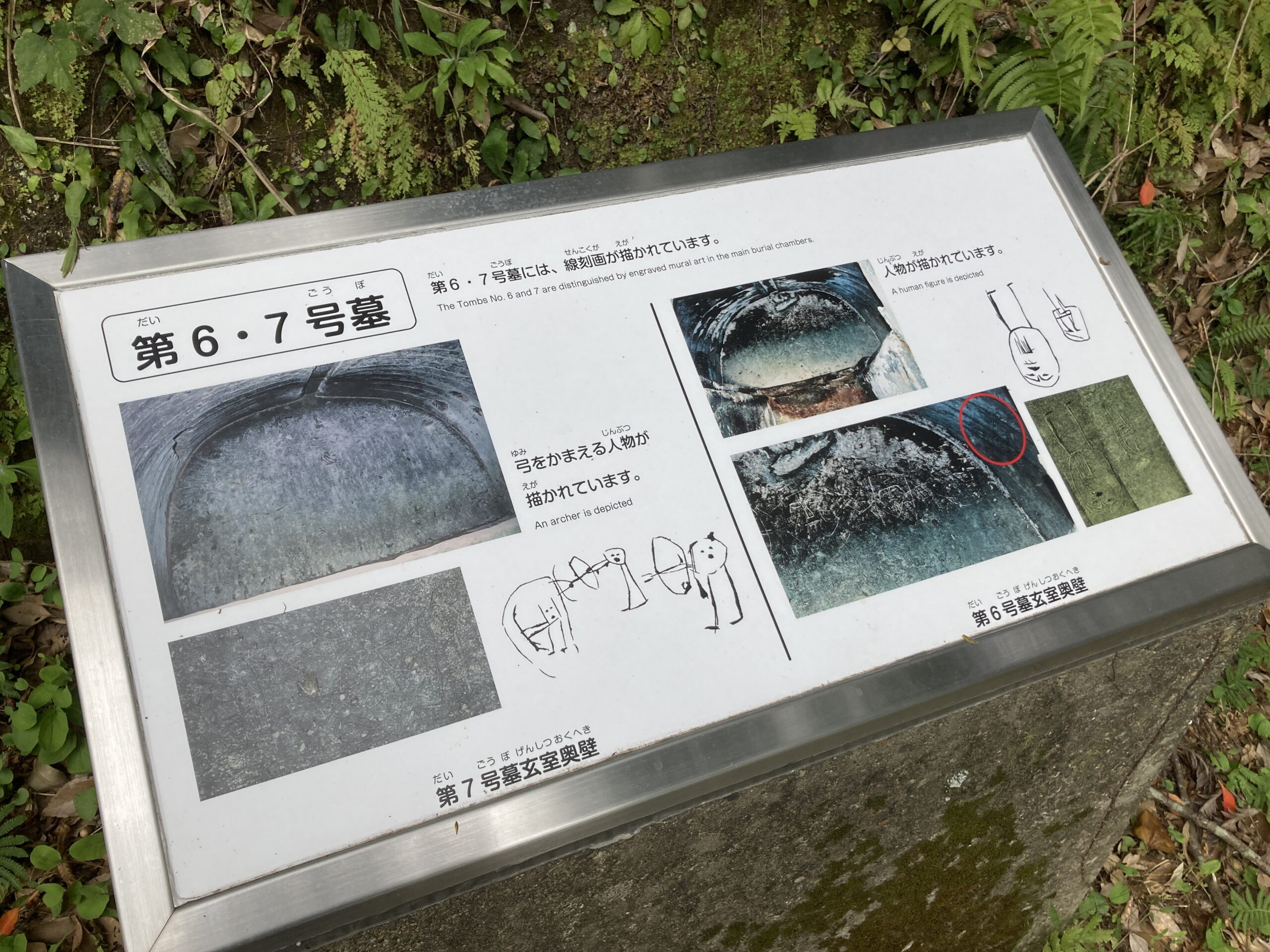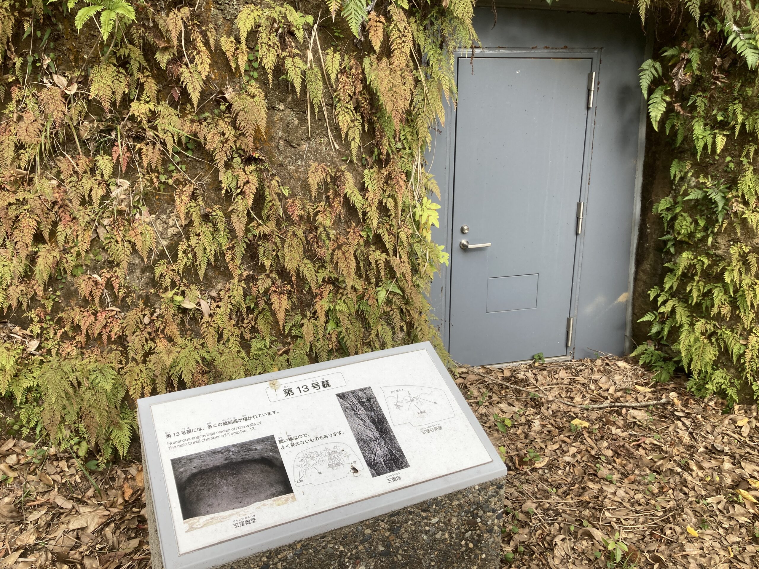 ただ、線刻画が描かれている横穴墓は保存のためなのか、完全にふさがれていて、実物を見ることはできなかった。もしかしたら、現地解説会とかある時は開いて見せてくれるかもね。