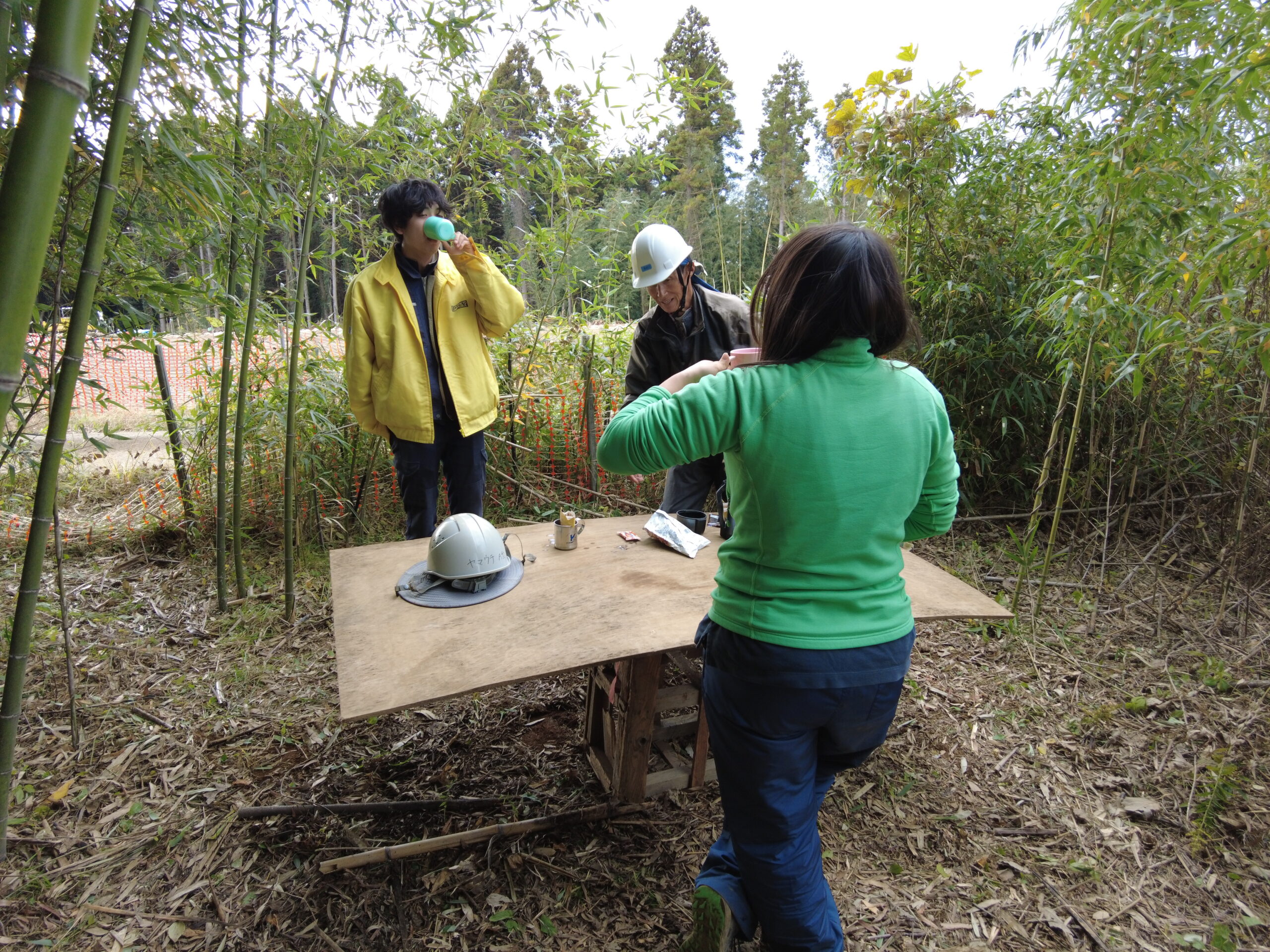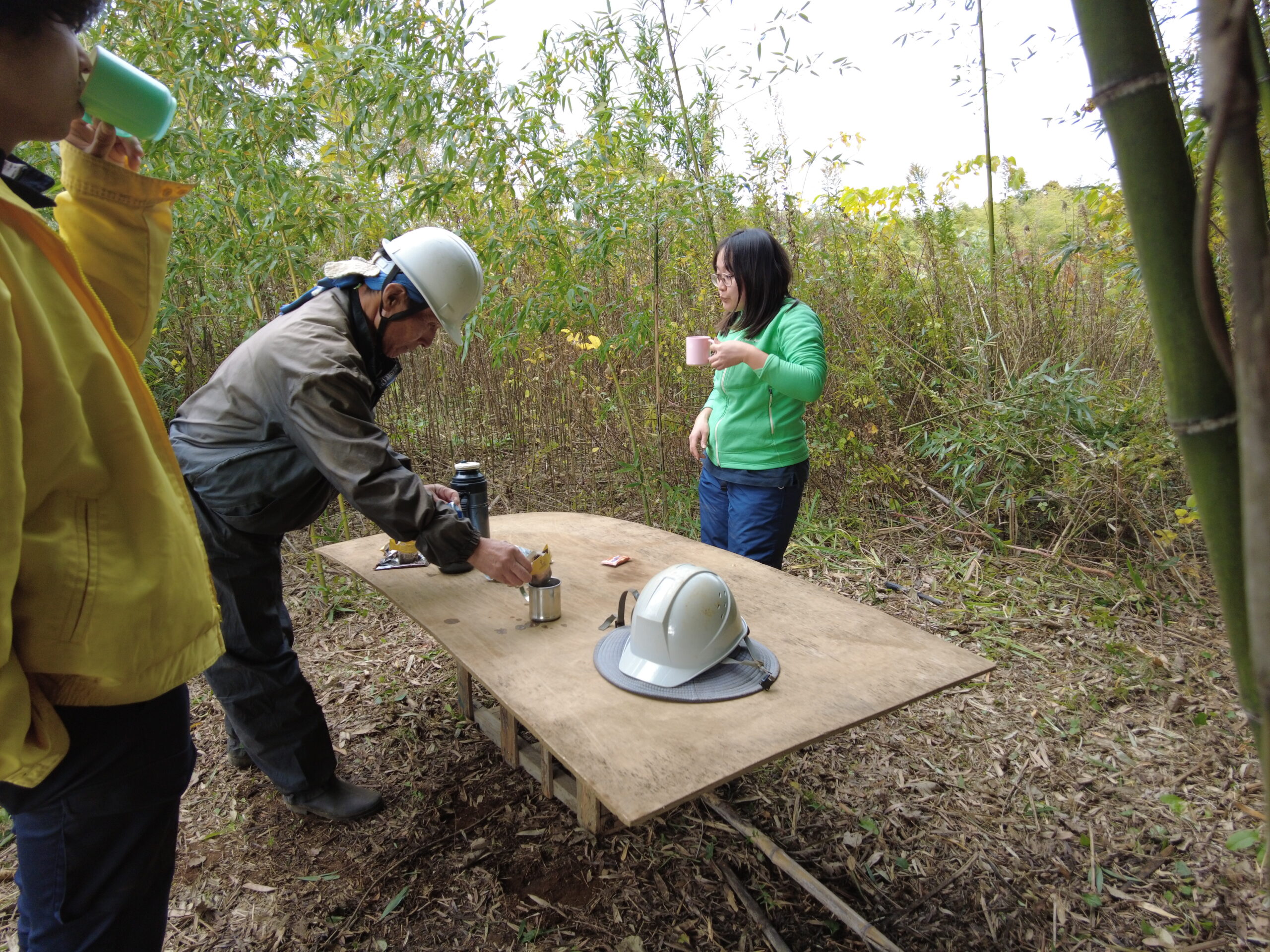 前は、現場でピクニックをしていたけど、吹きっさらしの現場とは違って、周りに竹が生えているから、若干の風よけになる。子供のころこういう秘密基地作ったよね。コーヒーもインスタントからドリップコーヒーにバージョンアップしてた。おっちゃん、グッジョブ!