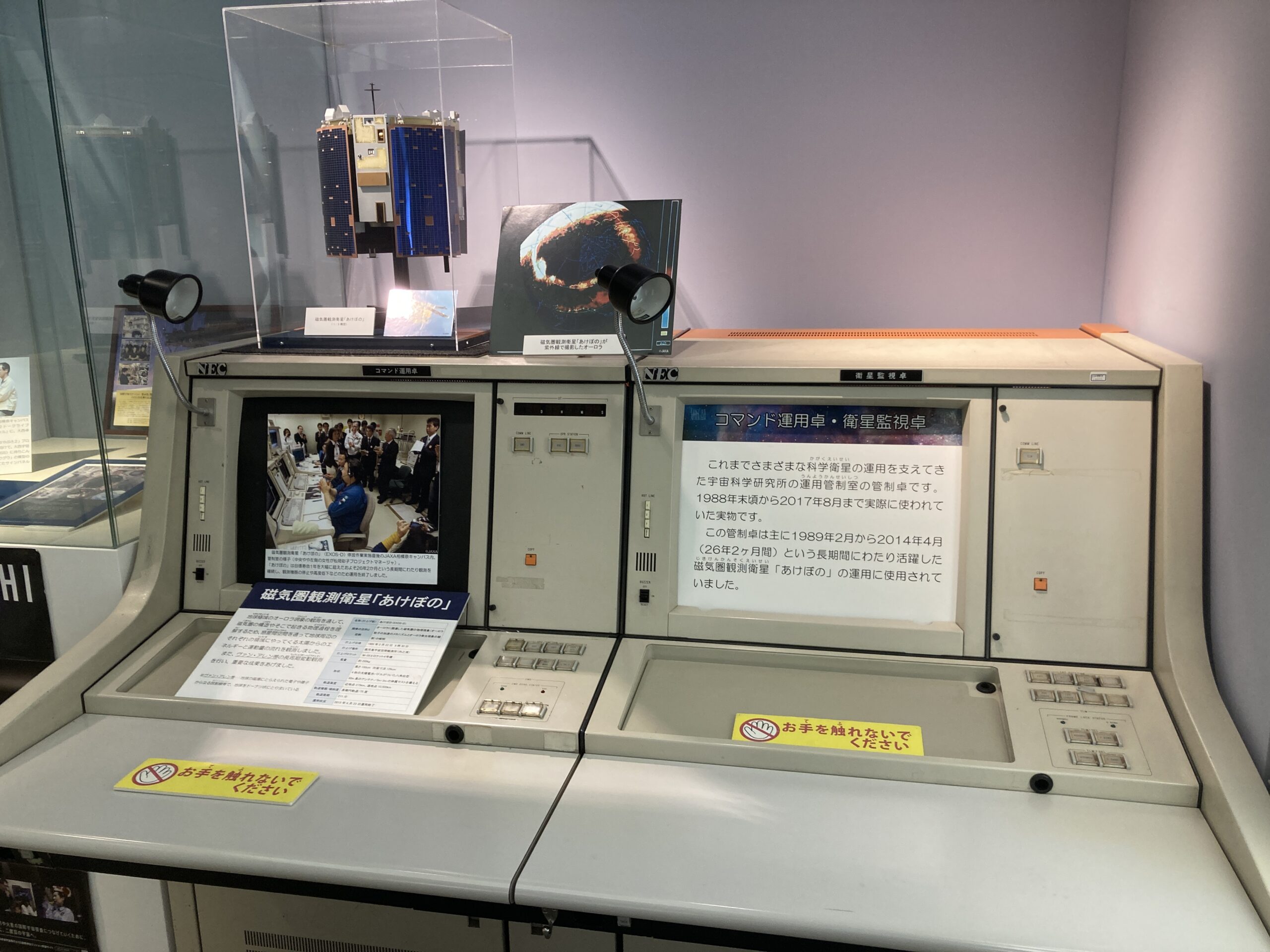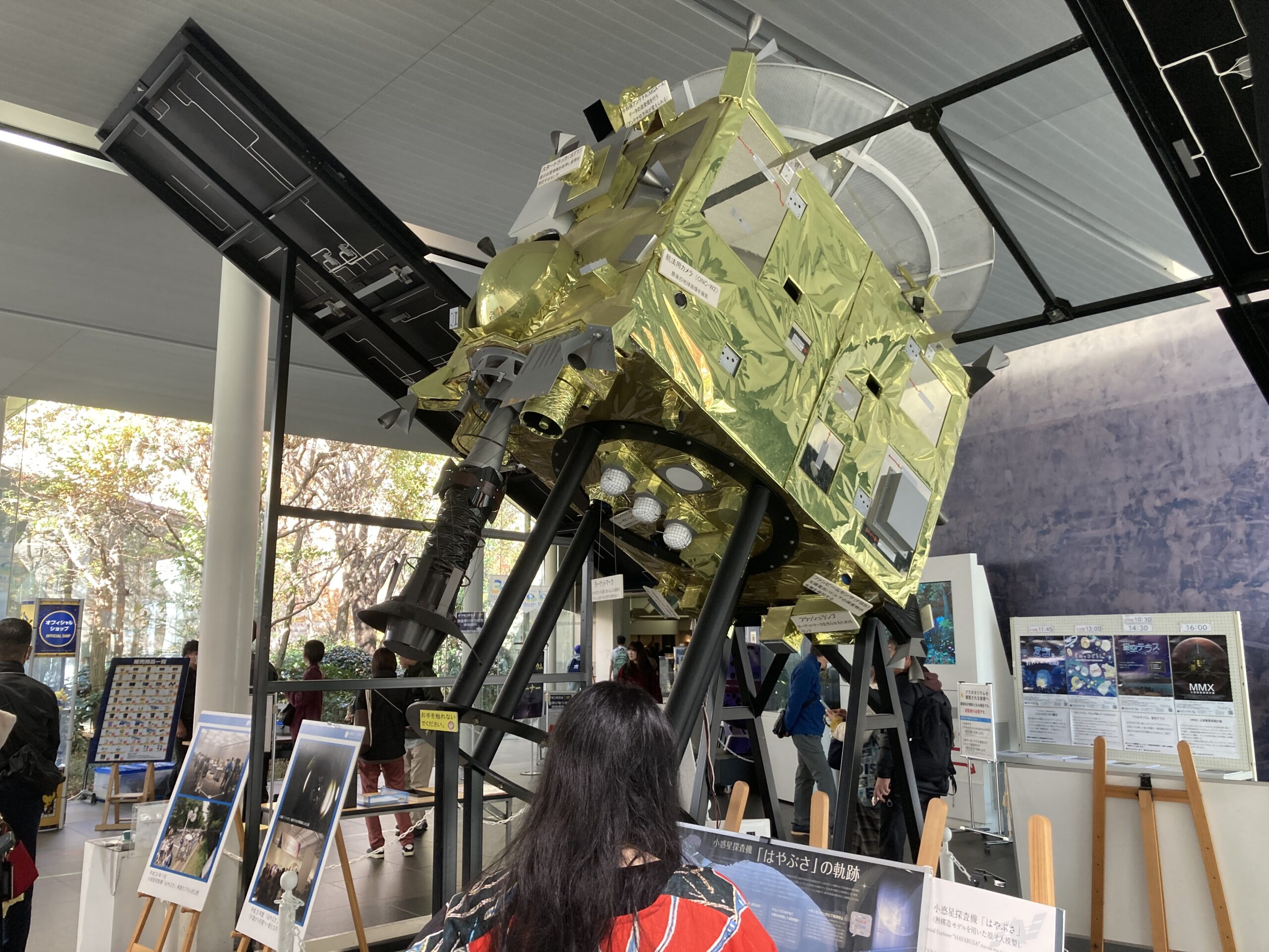 この写真は博物館に入ってすぐ左に飾られている、小惑星探査機「はやぶさ」の模型。はやぶさをはじめとした探査機は金色の耐熱シートで覆われているんだけど、このシートに使われているフィルムはポリイミドという素材でできていて、それが作られる過程で黄色になるらしい。