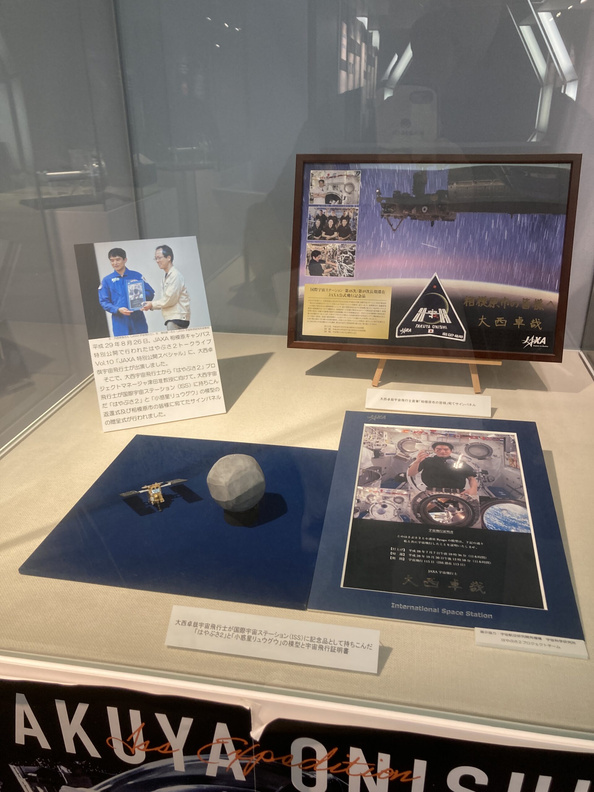 天文展示では、まず入り口を入ると、日本の人工衛星や小惑星探査機などに関する展示が並んでいる。実際の展示は隣のJAXAの研究施設の方が充実してるけど、こちらはこちらで、小惑星探査機に関する解説がなされていて、興味のある人は面白いと思う。