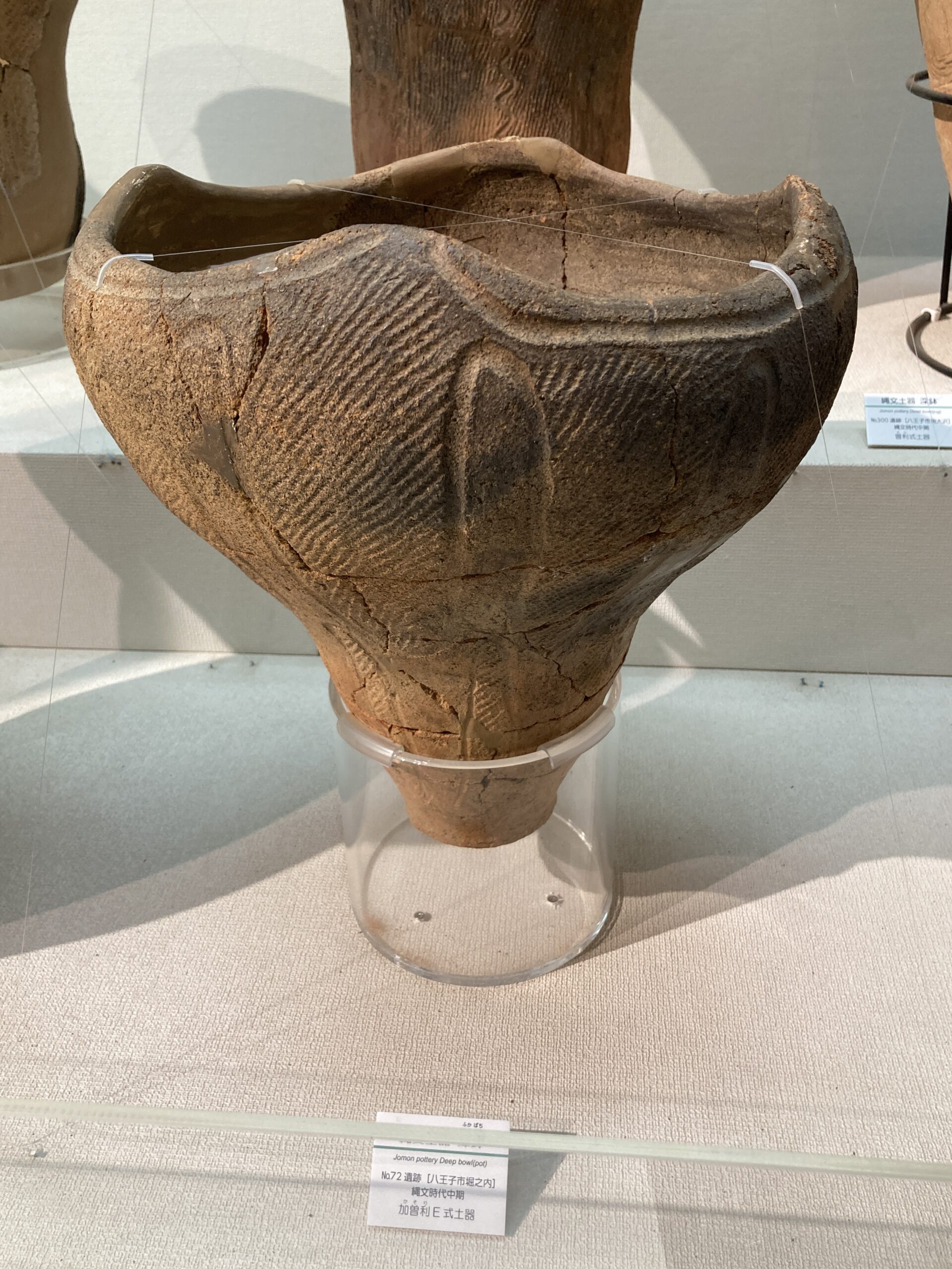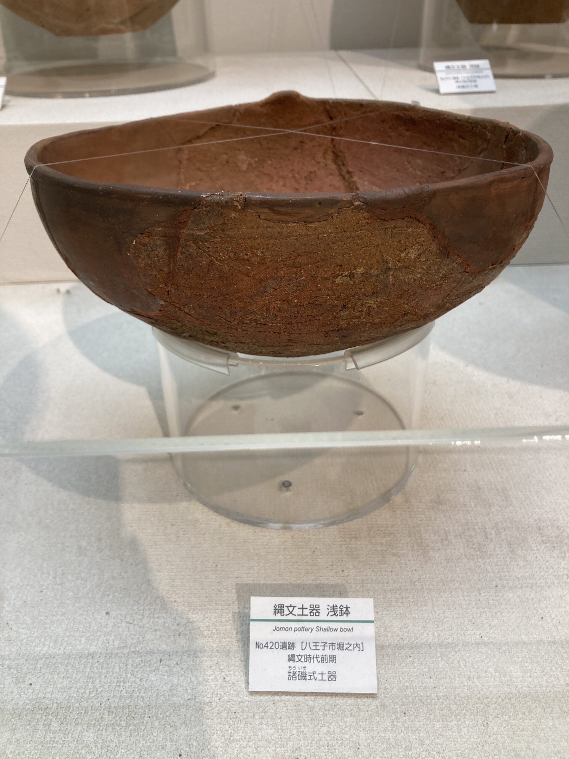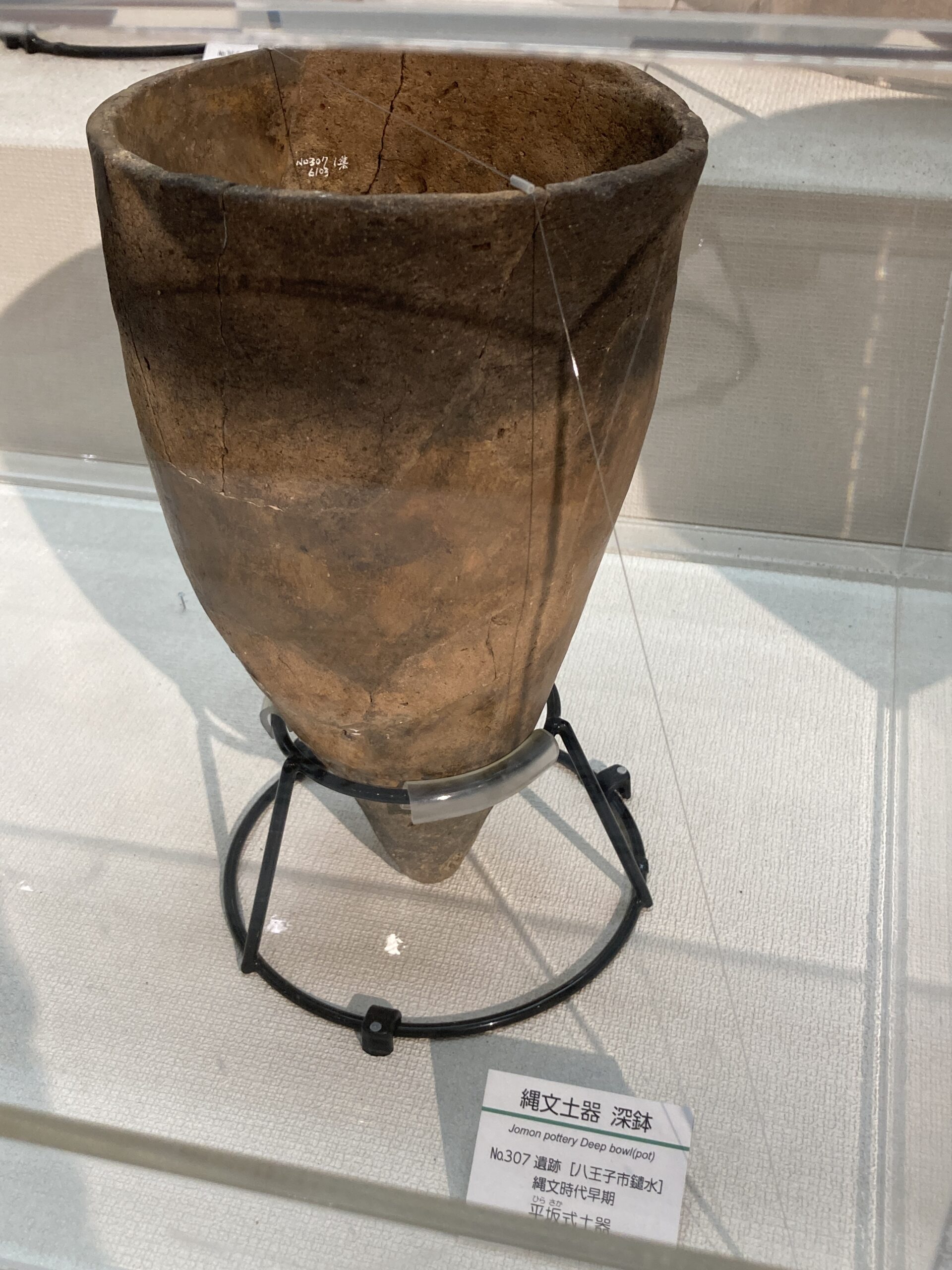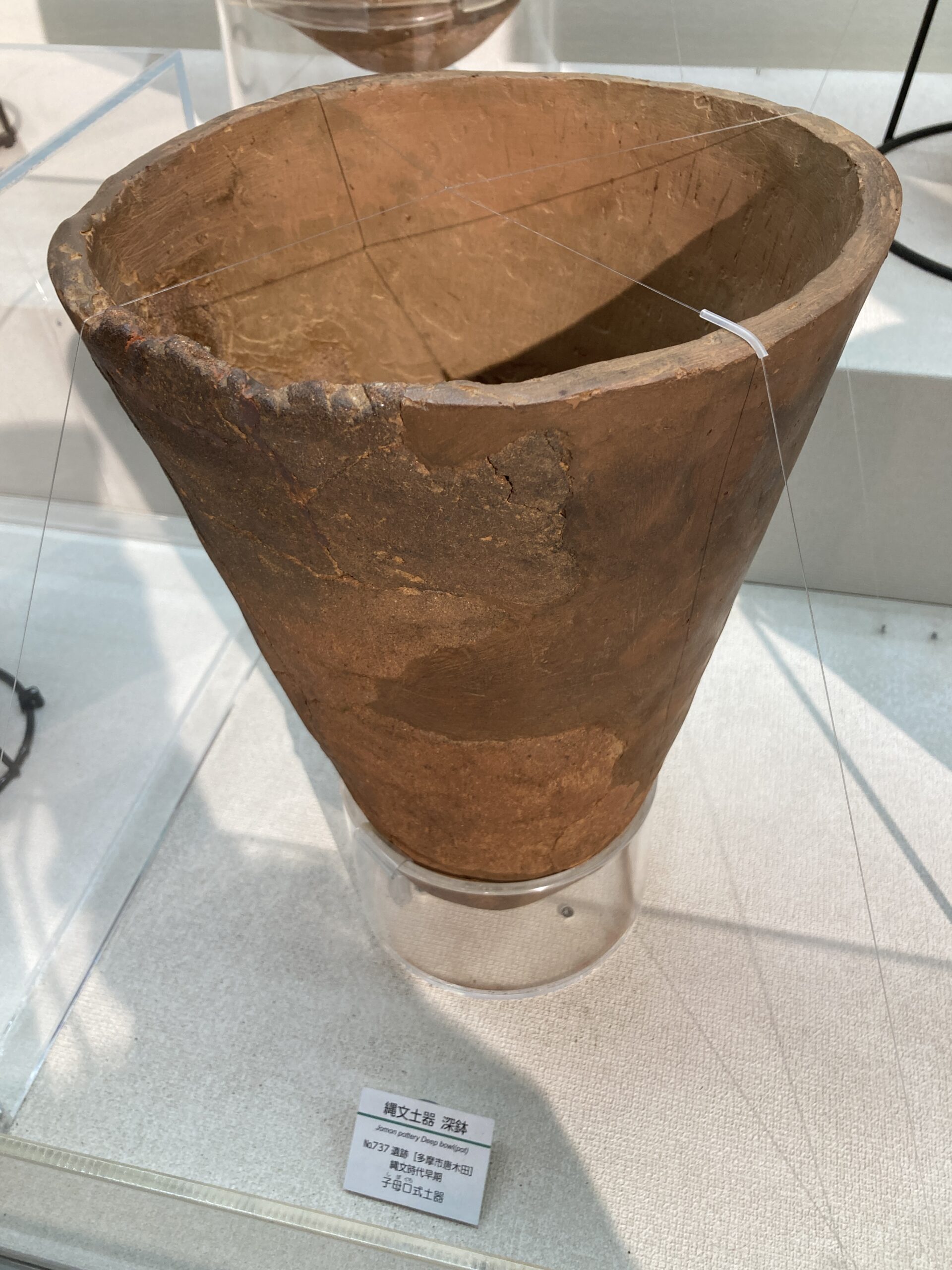 早期の土器は尖底のモノが多い。使いづらそうだけど、組んだ石の上で使うからそうでもないのかな?この写真だと、ネットで調べた子母口式土器の特徴は見受けられないがどうなんだろう?