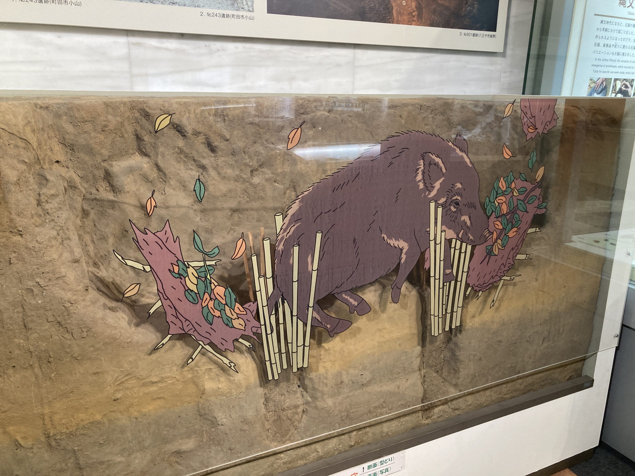 我々が普段掘っている落とし穴、実際にイノシシが穴に落ちた時の落とし穴のレプリカと想像図。展示スペースの都合上、深さは浅めになっているけど、現場では深さ2mあったらしい。ちゃんと逆茂木をして、イノシシが逃げられないようにしているところも再現度が高い。