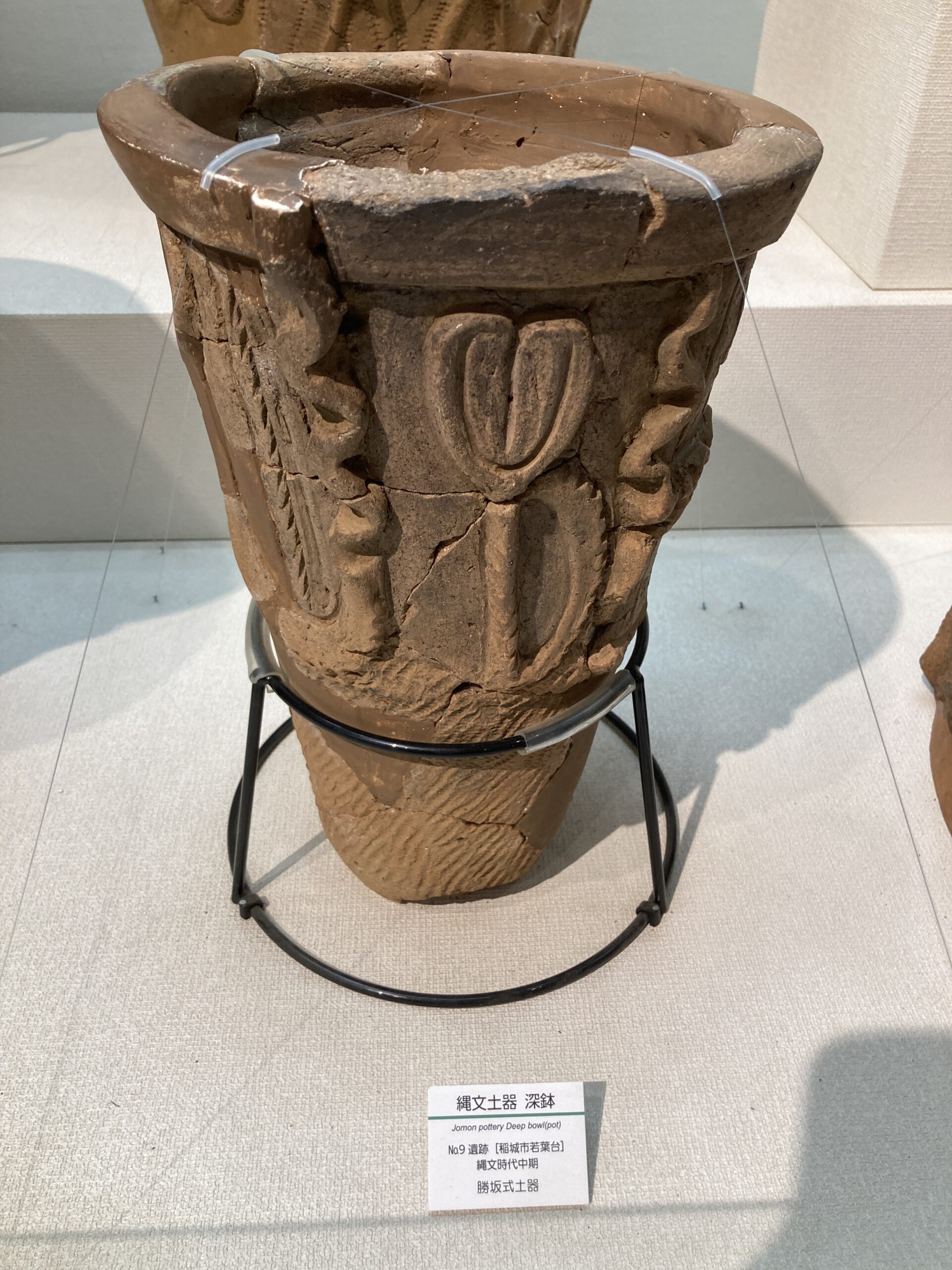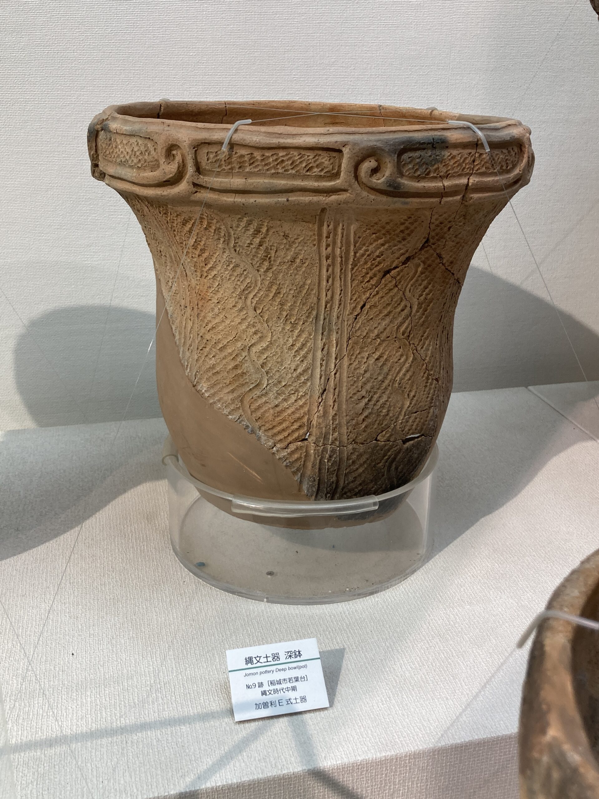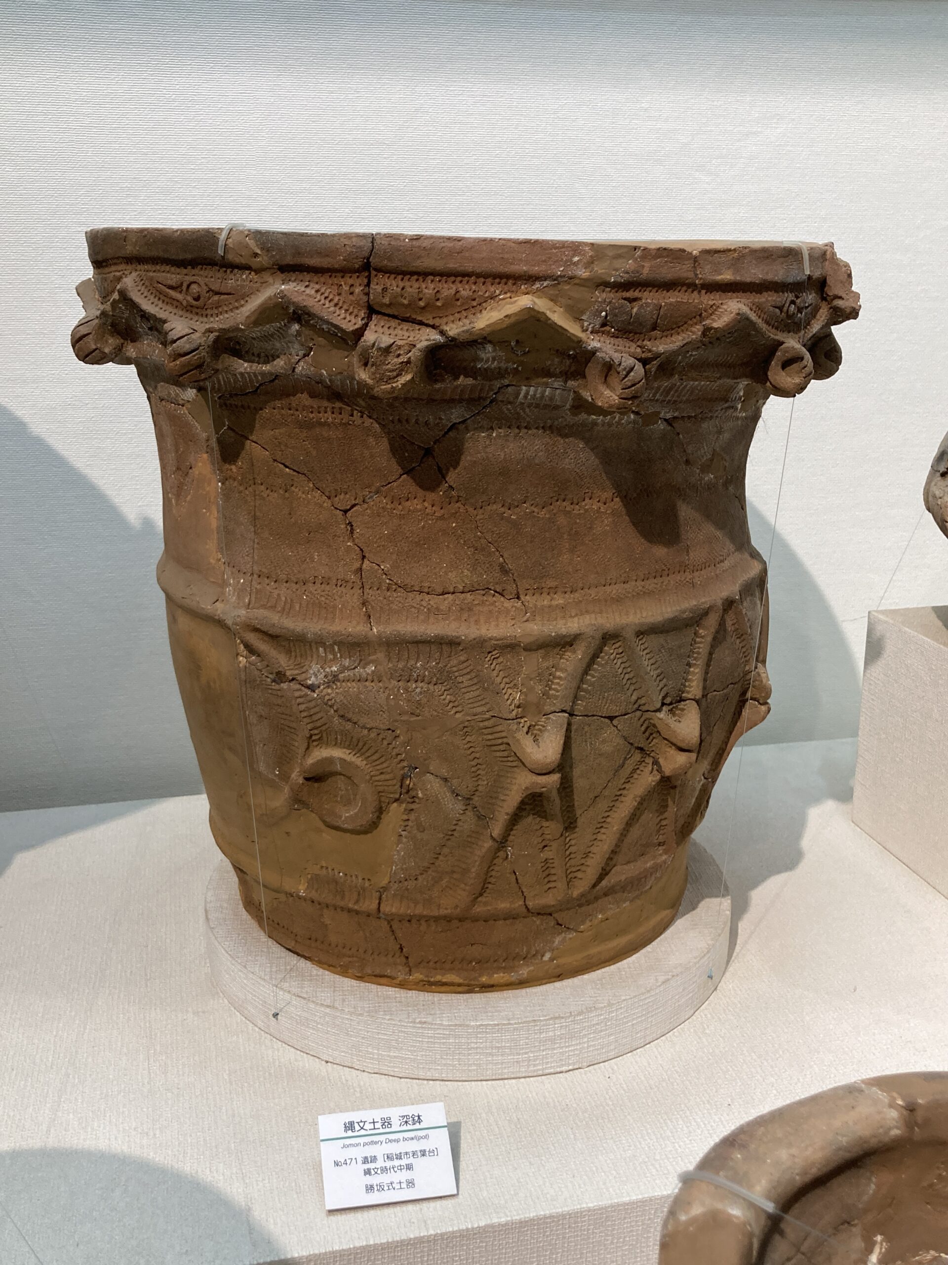 つづいて、縄文時代中期(~約4400年前)の土器。縄文土器が派手さが落ち着いてきた頃の土器。我らが加曾利貝塚の名前を冠した土器が流行った時期なので、千葉県民のワイにとっては、なんだか誇らしいw