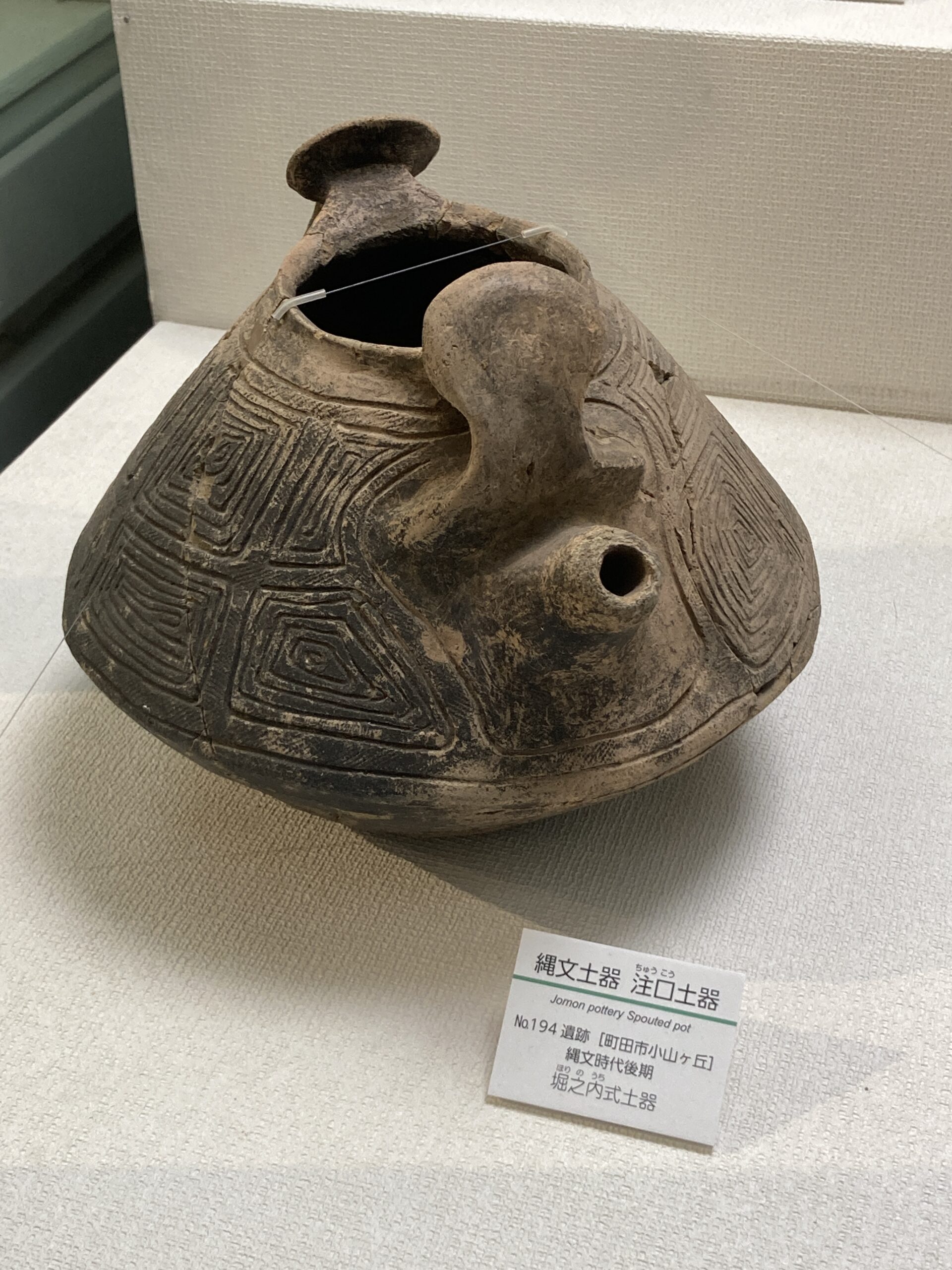 つづいて、縄文時代後期(約4400~3200年前)の土器。この頃の多摩地区では、丘から人が降り始めた時代らしい。原因は分からないが、気候変動が原因なのか、以前に比べて縄文時代のムラも少なくなっていたんだとか。