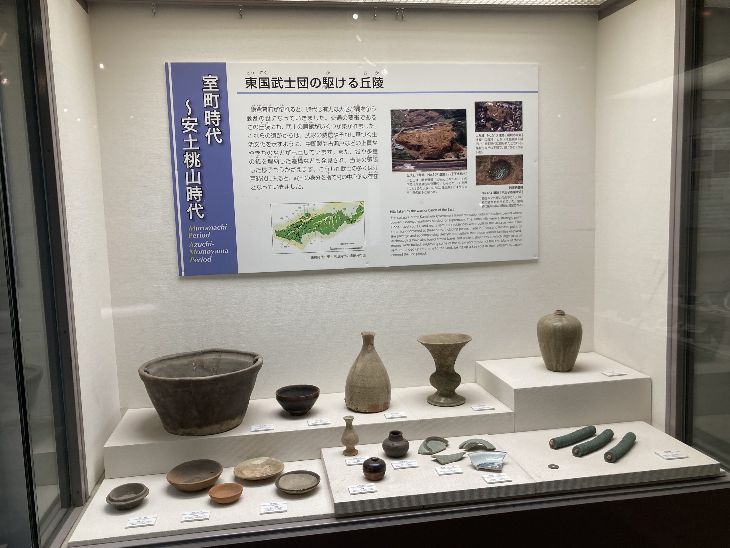 で、それらの遺跡からは、中国製の良質な古瀬戸のやきもの、城や多数の銭を埋葬した遺構などが発見され、そこから当時の緊張した権力争いの様相が見て取れるらしい。