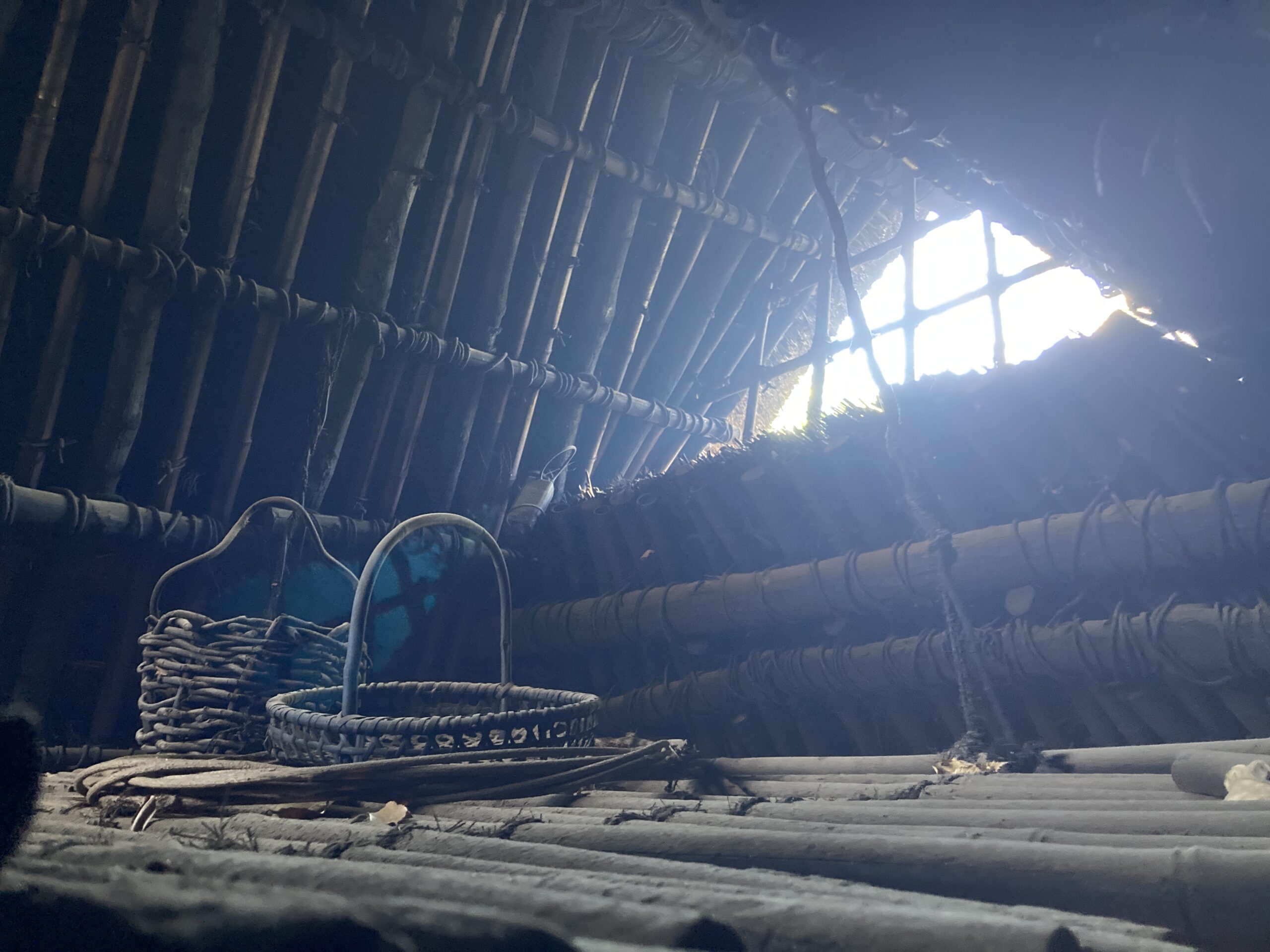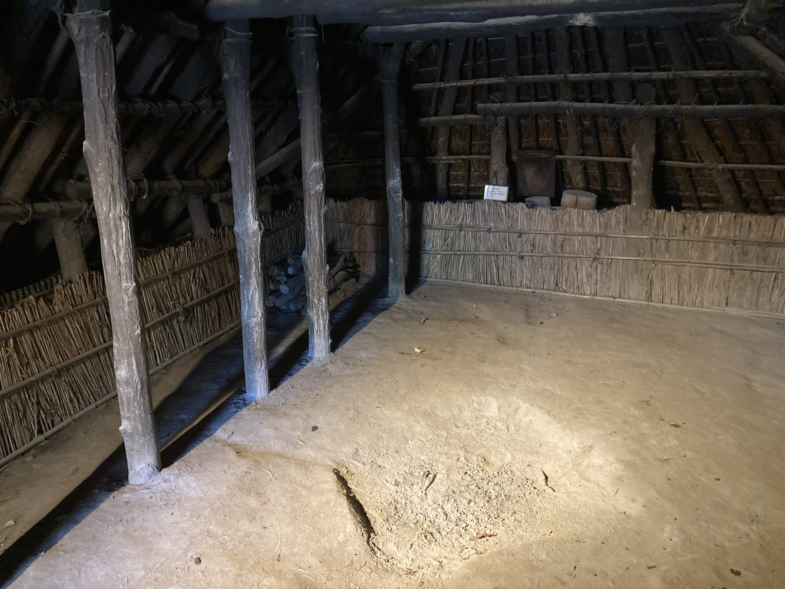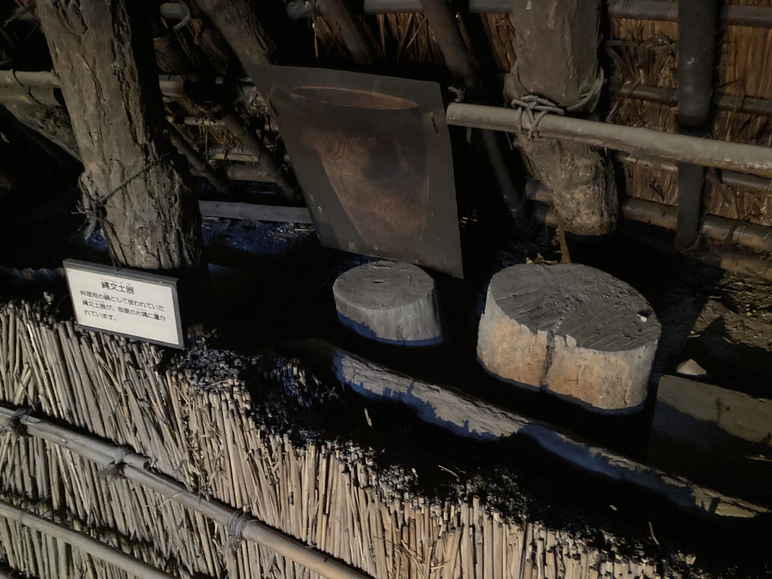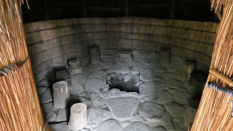 天井の下にロフトみたいな造りがあって、屋根にも穴が開いているから、空気の循環が上手くいっているんだと思う。上物は崩れてしまっているので、実際の縄文時代の建物はどうか分からないけど、多分そんなに変わらないんじゃないかな?