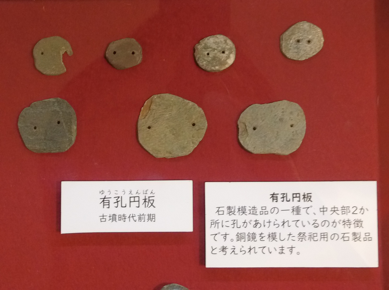 古墳時代でお馴染みの勾玉とか土師器とか有孔円版とか、というか「有孔円版って何もの?」って思っていたけど、銅鏡を模した祭祀用の石製品なんだ。やっぱり銅鏡は貴重品だから、なかなか手に入らなかったのかな?