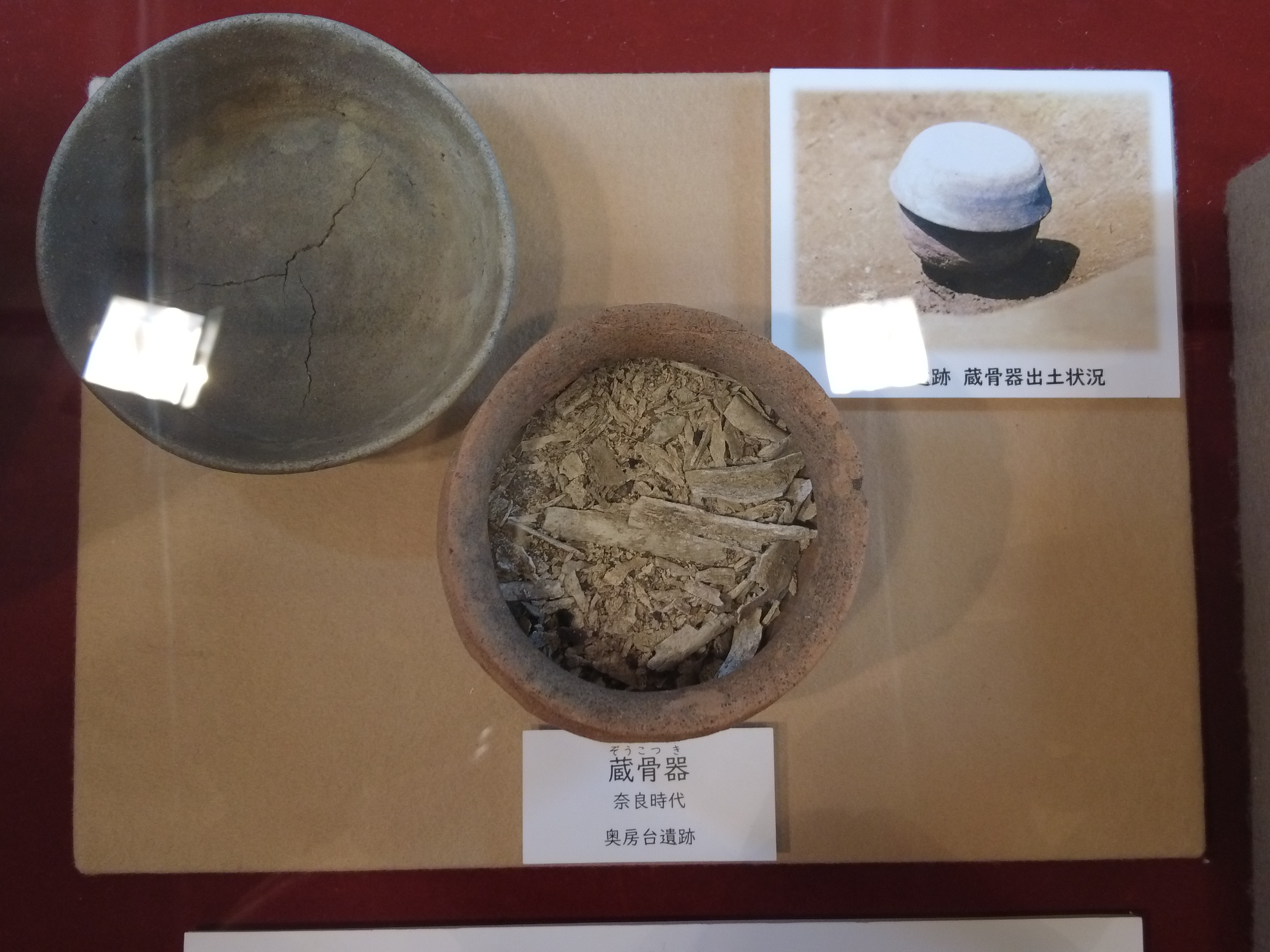 展示されている奈良時代の遺物。蔵骨器が出土状況込みで展示されているのは分かりやすくて良い。しかもほとんど割れていない状態だったのは凄いね。この中身は本物なんだろうか?