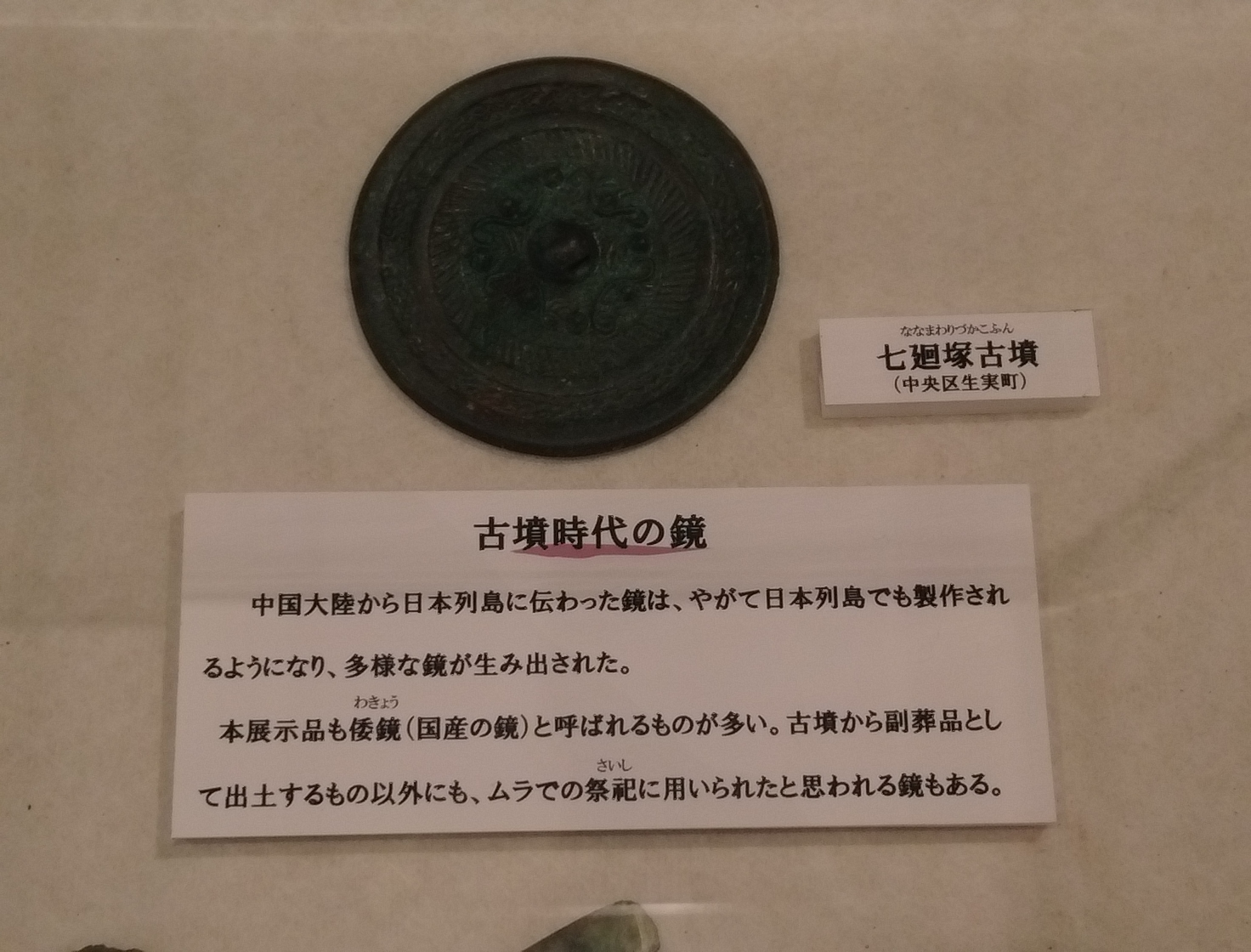 千葉市中央区生実町の七廻塚古墳で出土した鏡。国宝の三角縁神獣鏡に比べるとグレードが低そうに見えるけど鏡は鏡。当時はピカピカで見る者を魅了したのであろう。