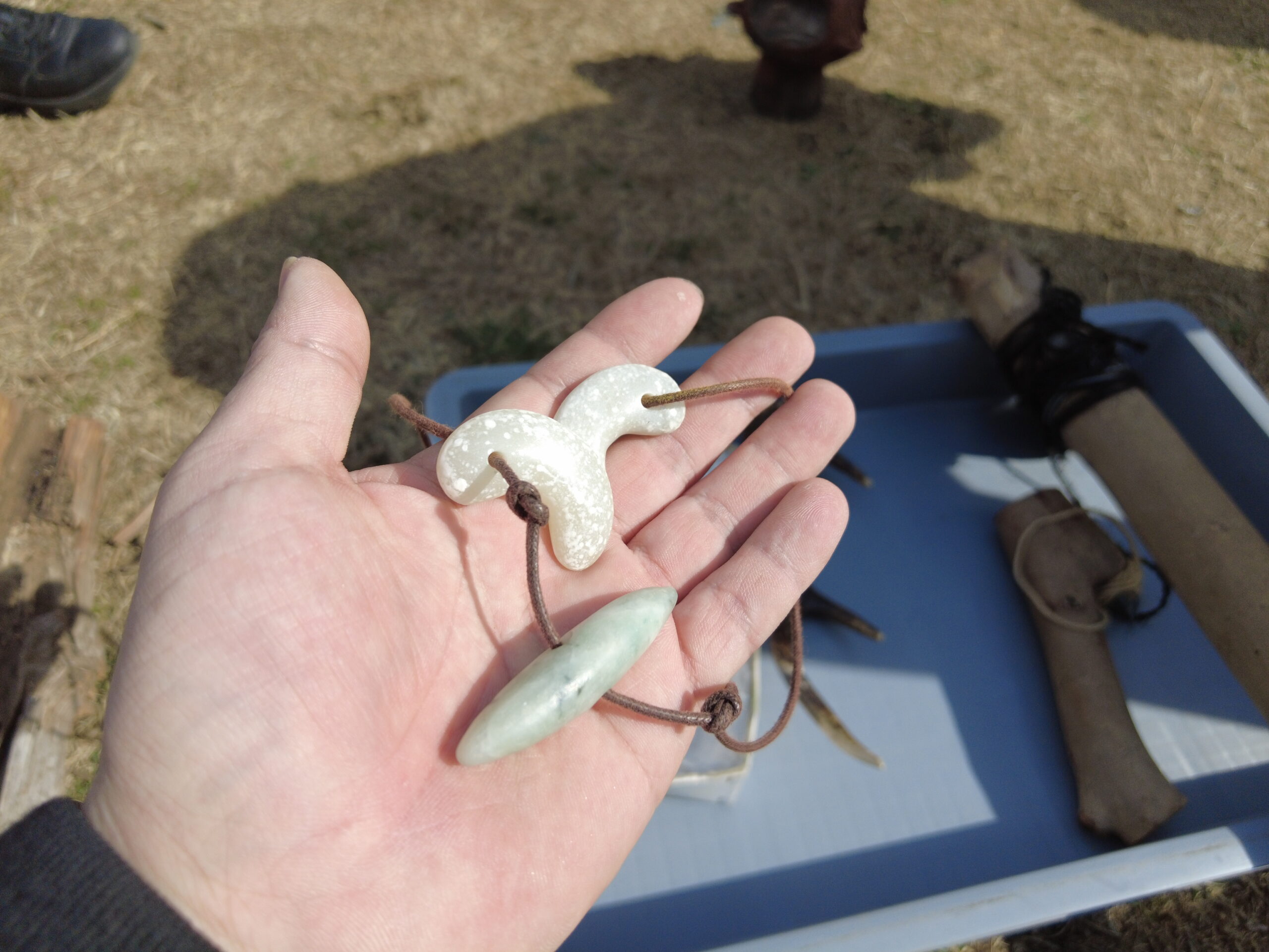 ヒスイの勾玉と石斧。地味にヒスイ触ったの初めてな気がする。新潟行ったら絶対にヒスイを拾いに行かないとね。