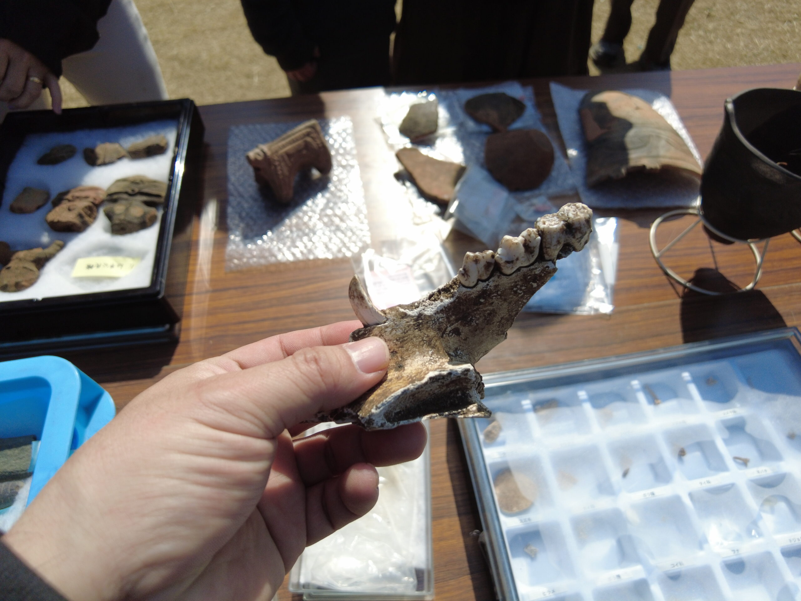 こういうイベントにしては珍しく、本物の獣骨とか土偶とかの遺物もお触りOKなのが良かった。さっきのヒスイもだけど土偶も初めて触った。動物形土製品(イノシシ)はレプリカっぽいけど、それでも実際に触れるのはいいね。土偶はなんかクッキーみたいだったわ。