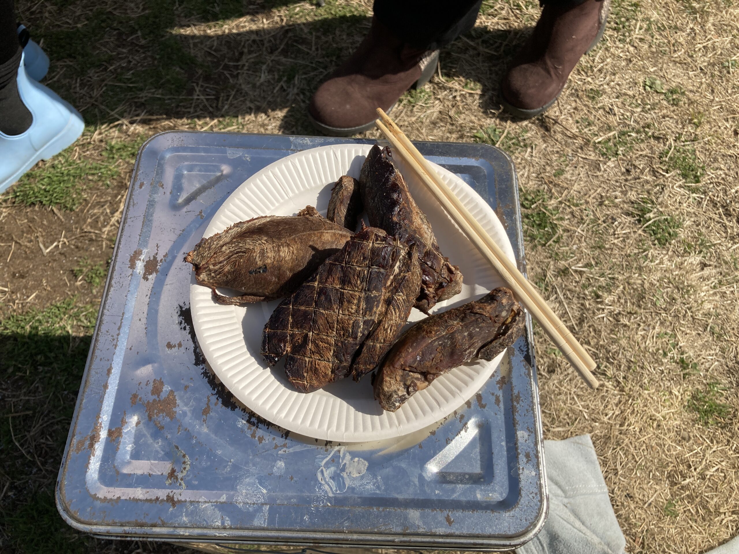 メインイベントはイノシシ鍋。お腹を壊す恐れがあるので実際にはふるまわれなかったけど、毒見と称して少しかじってみた。