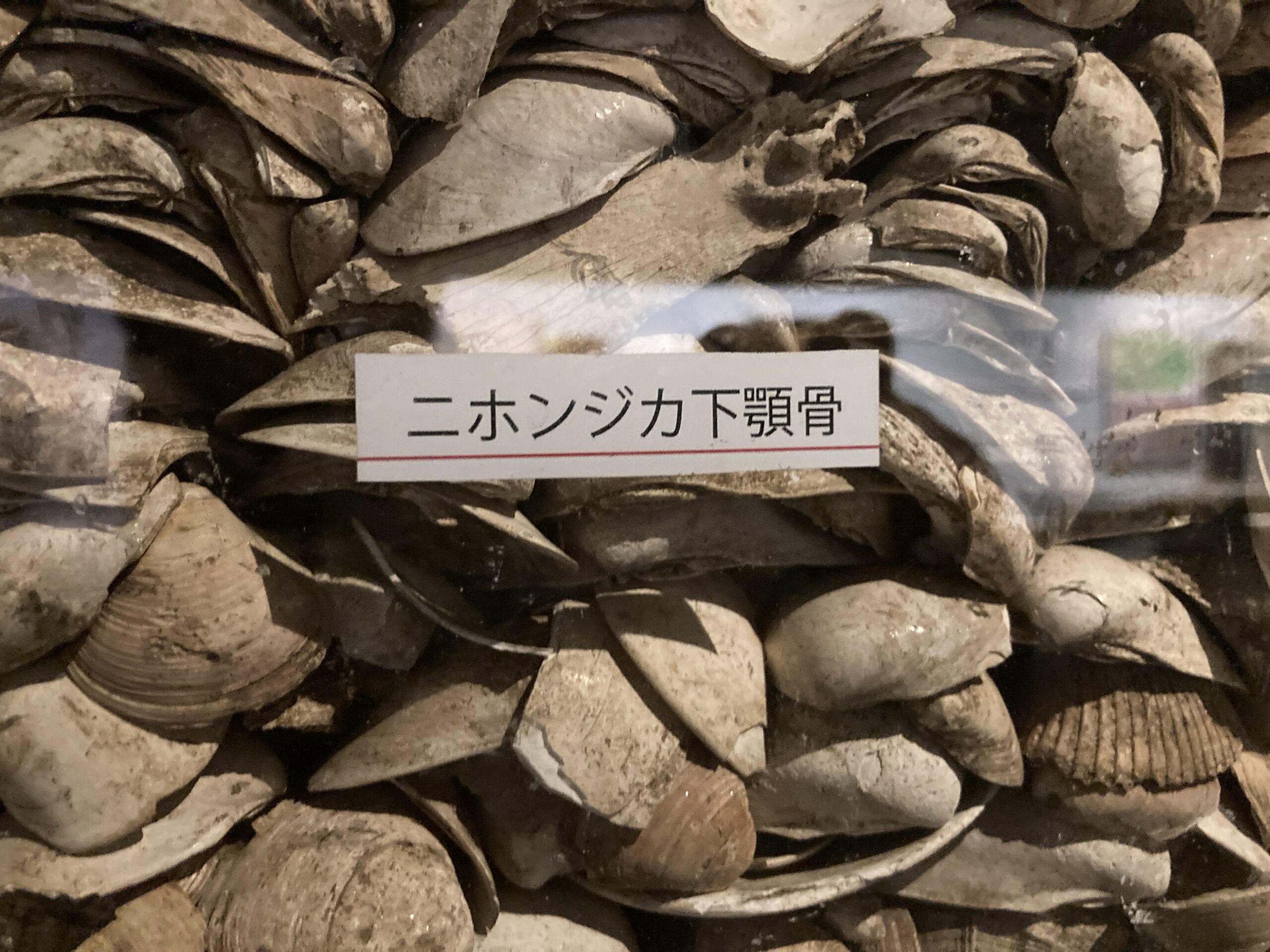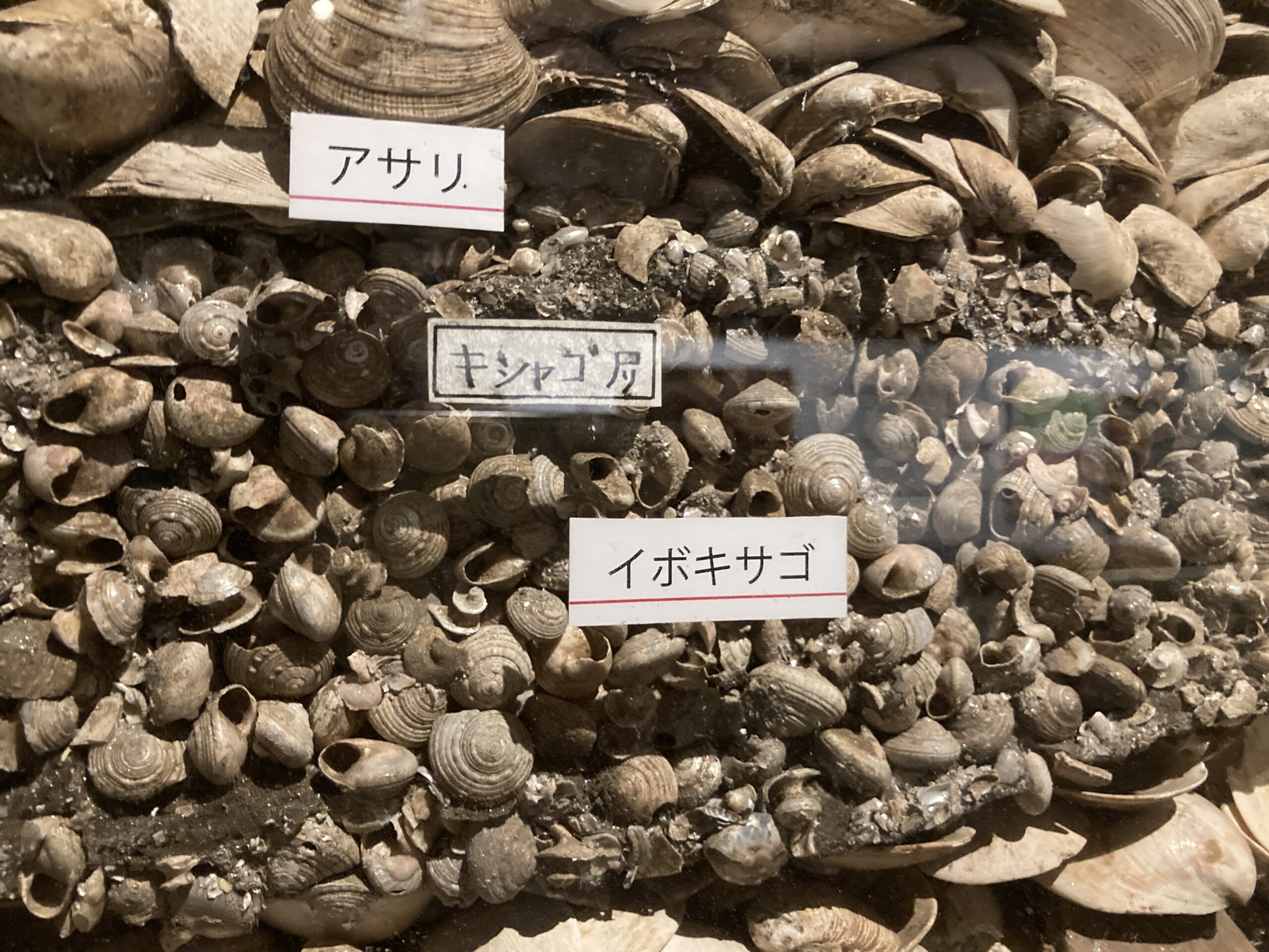 ヤマトシジミ、アサリ。イボキサゴ、ハマグリ、ツメタガイ、オオノガイ、サルボウ、オキシジミ、シカの骨などなど。