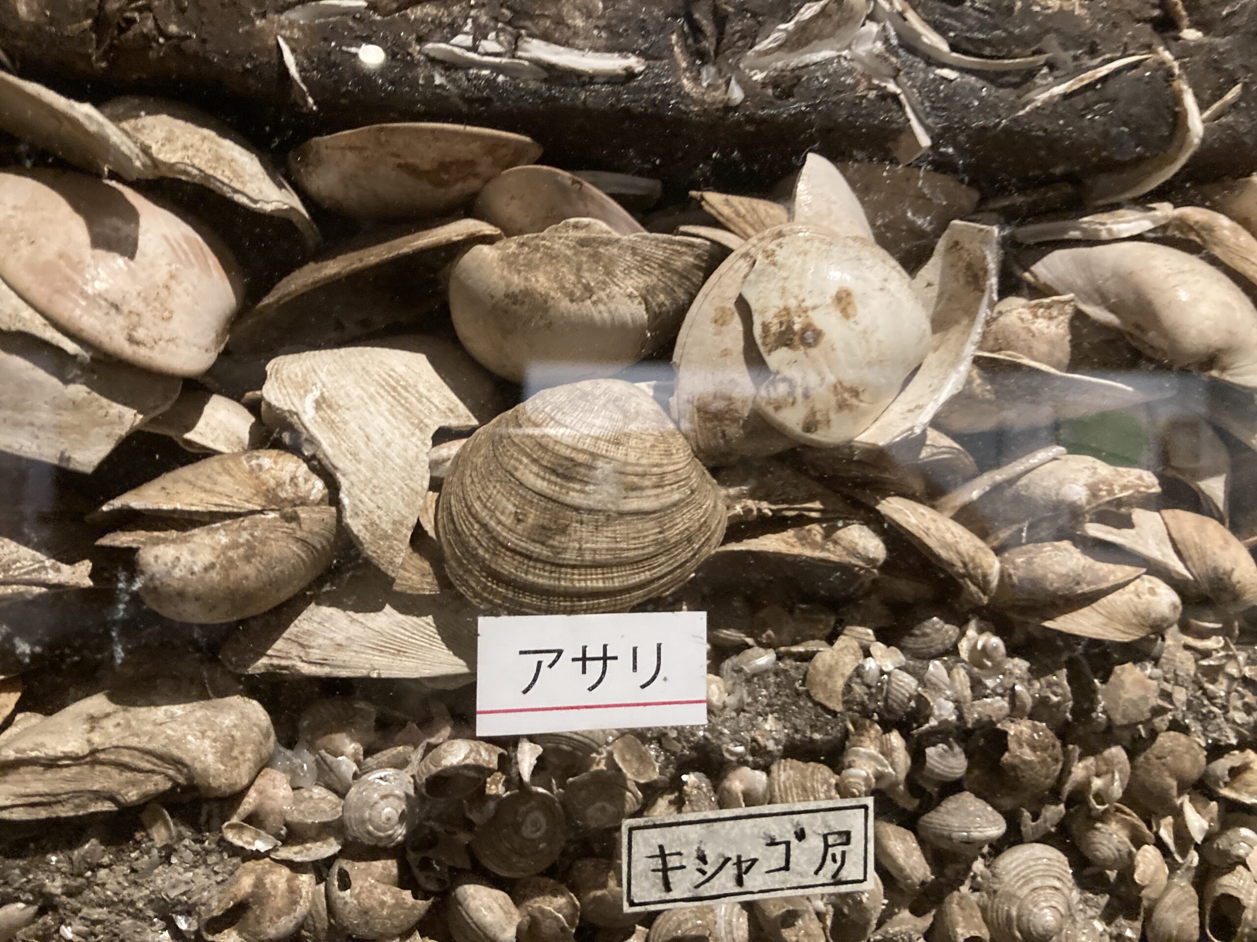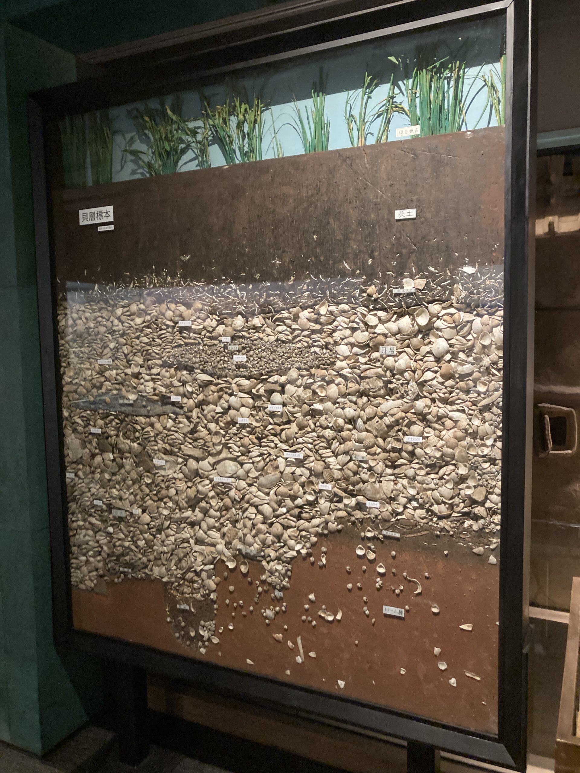 博物館の常連。貝塚の剥ぎ取り断面。じっくり見ると、いろいろな貝や魚や獣の骨が混ざっているのが面白い。