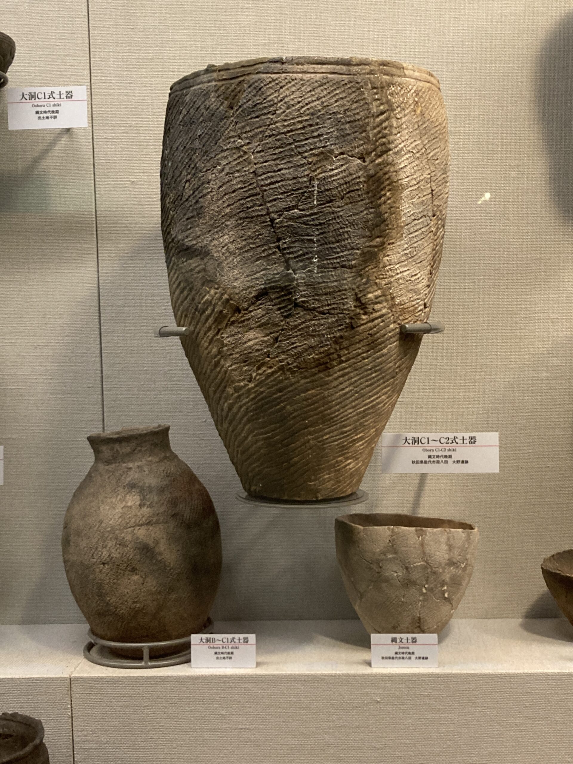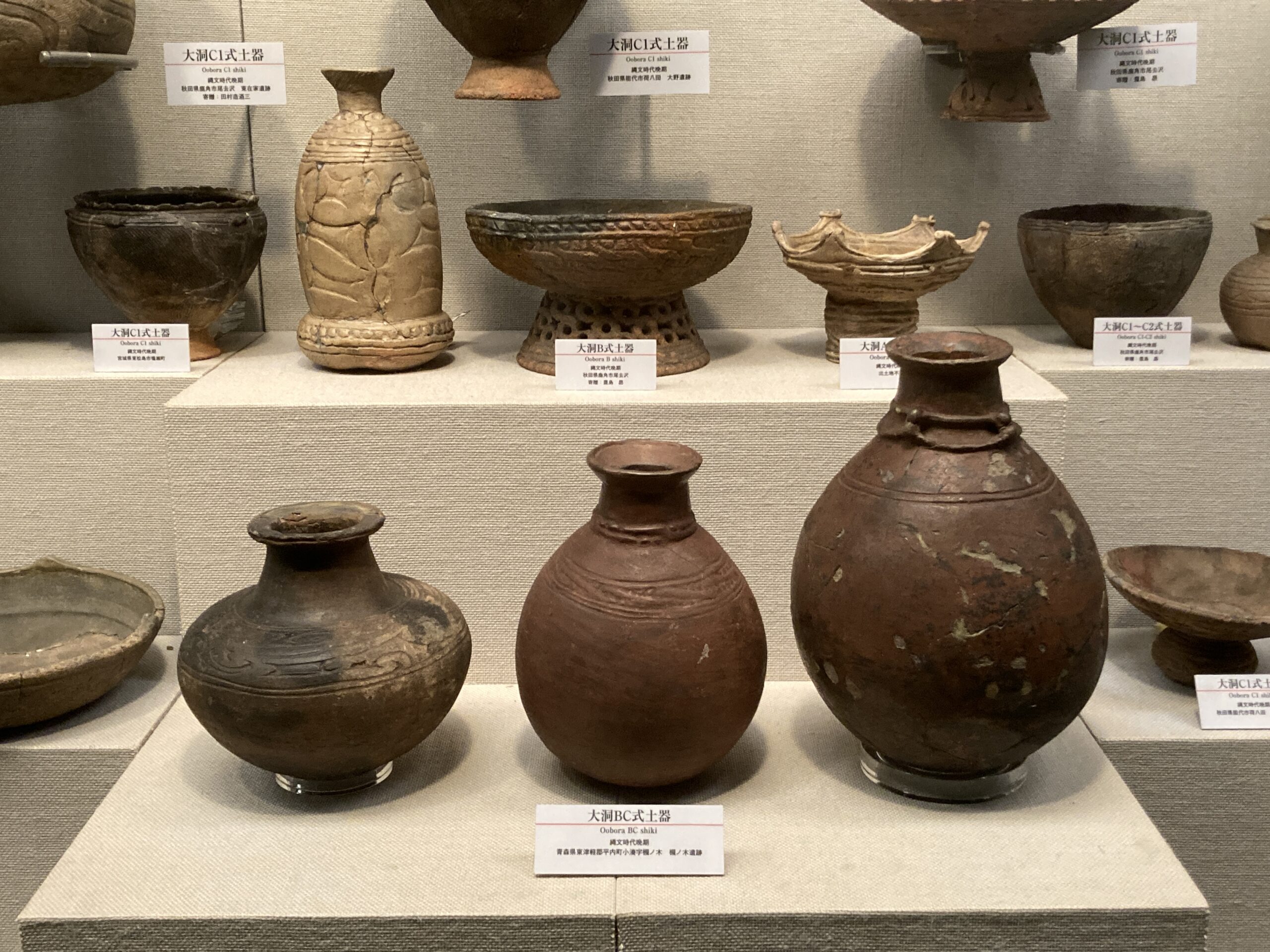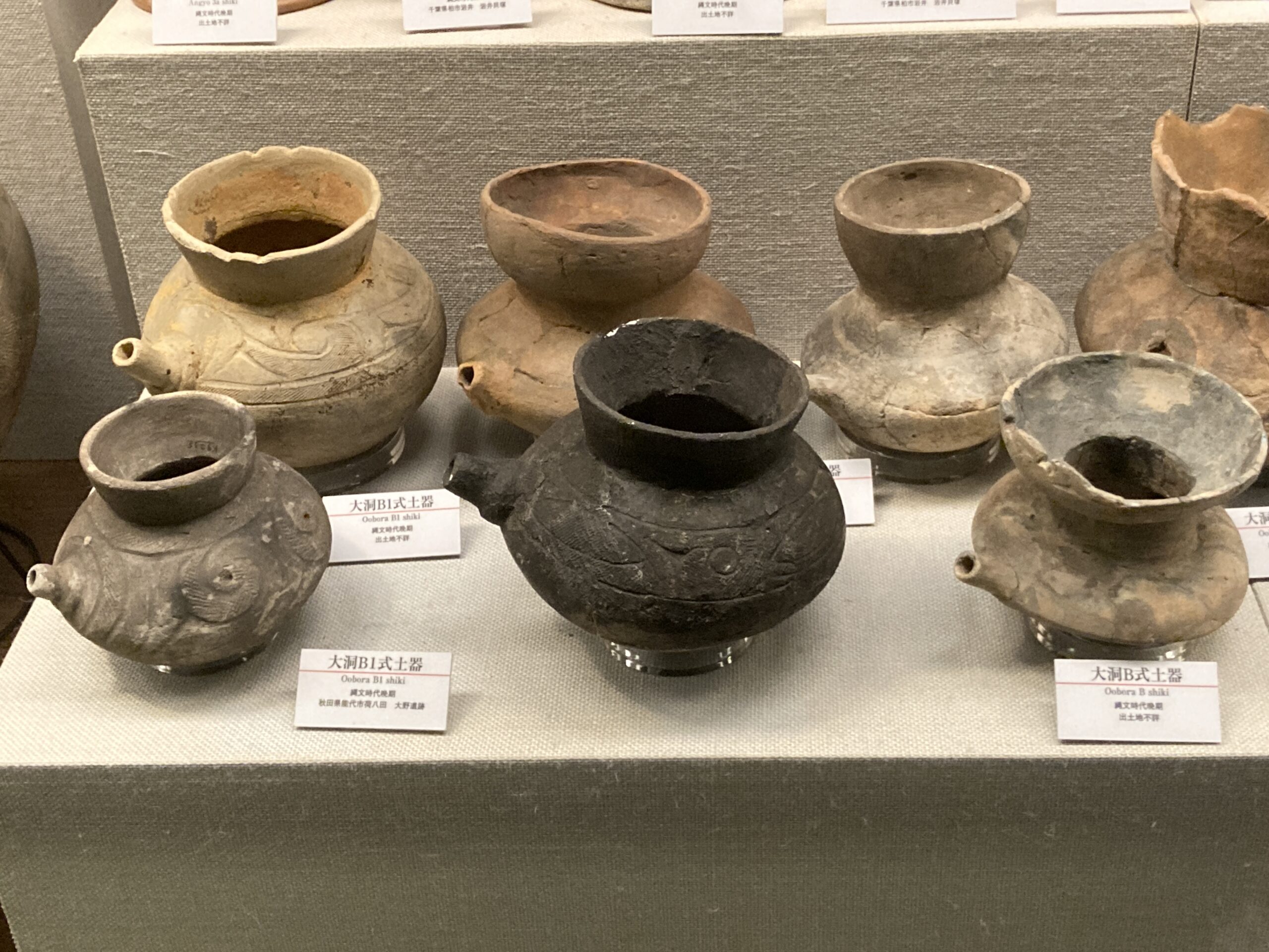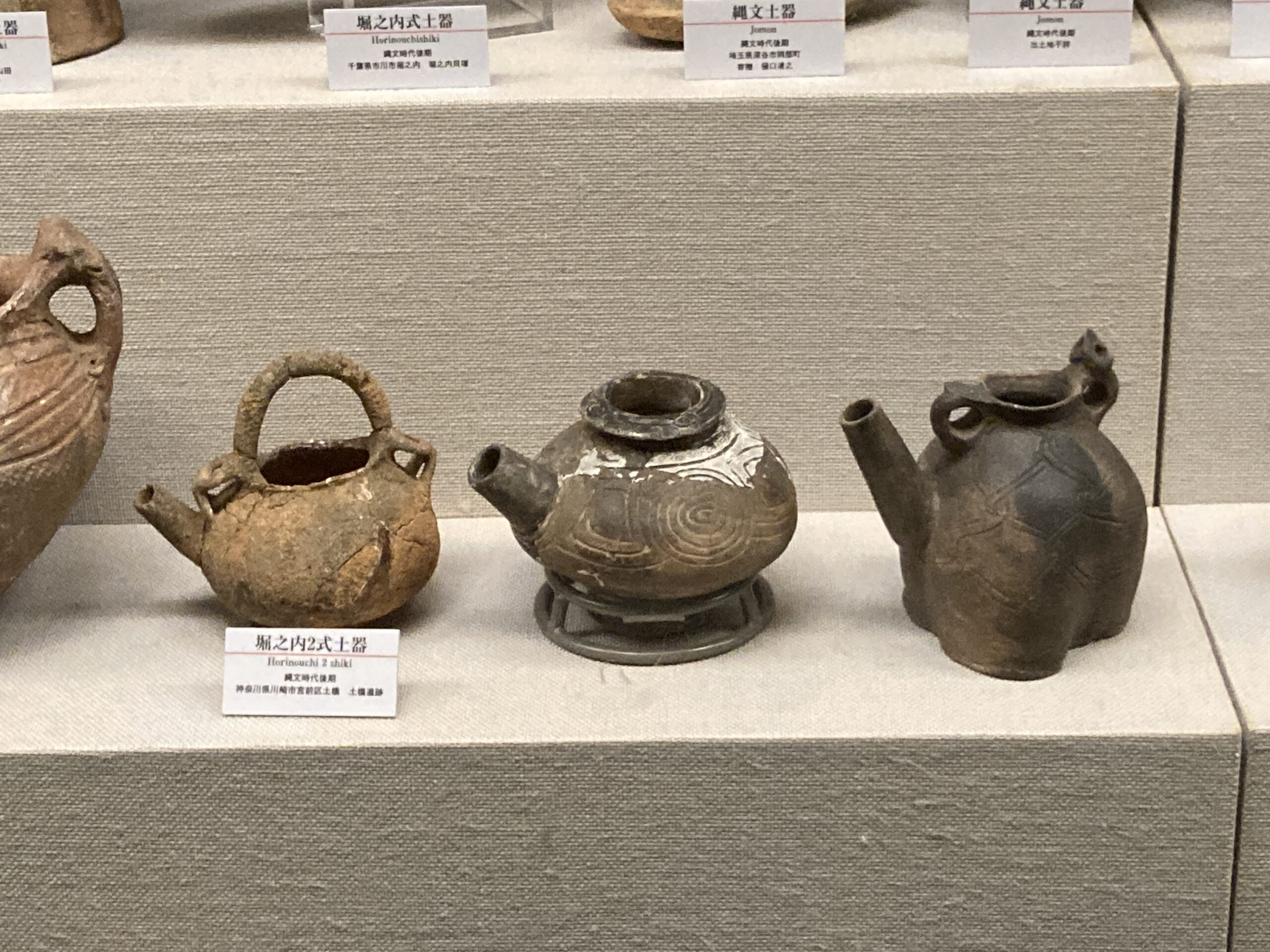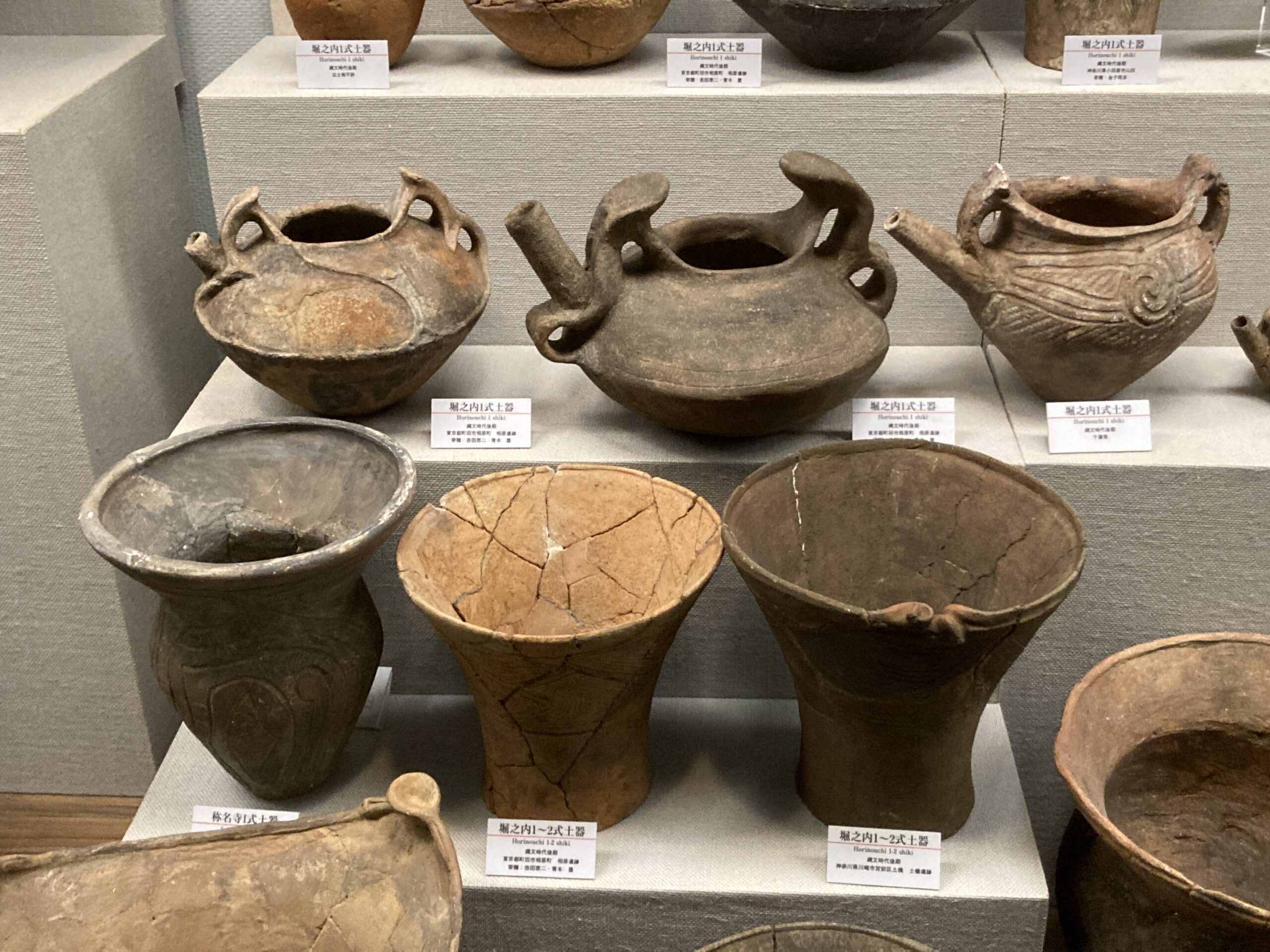國學院大學博物館の一番の目玉は「大量の縄文土器の展示」だと思う。縄文時代草創期から始まって、前期・中期・後期・晩期と1万年以上に渡って営まれていた縄文時代。地域や時代ごとに様々な形式の土器が生まれて、それらが交わっていく感じが面白い。