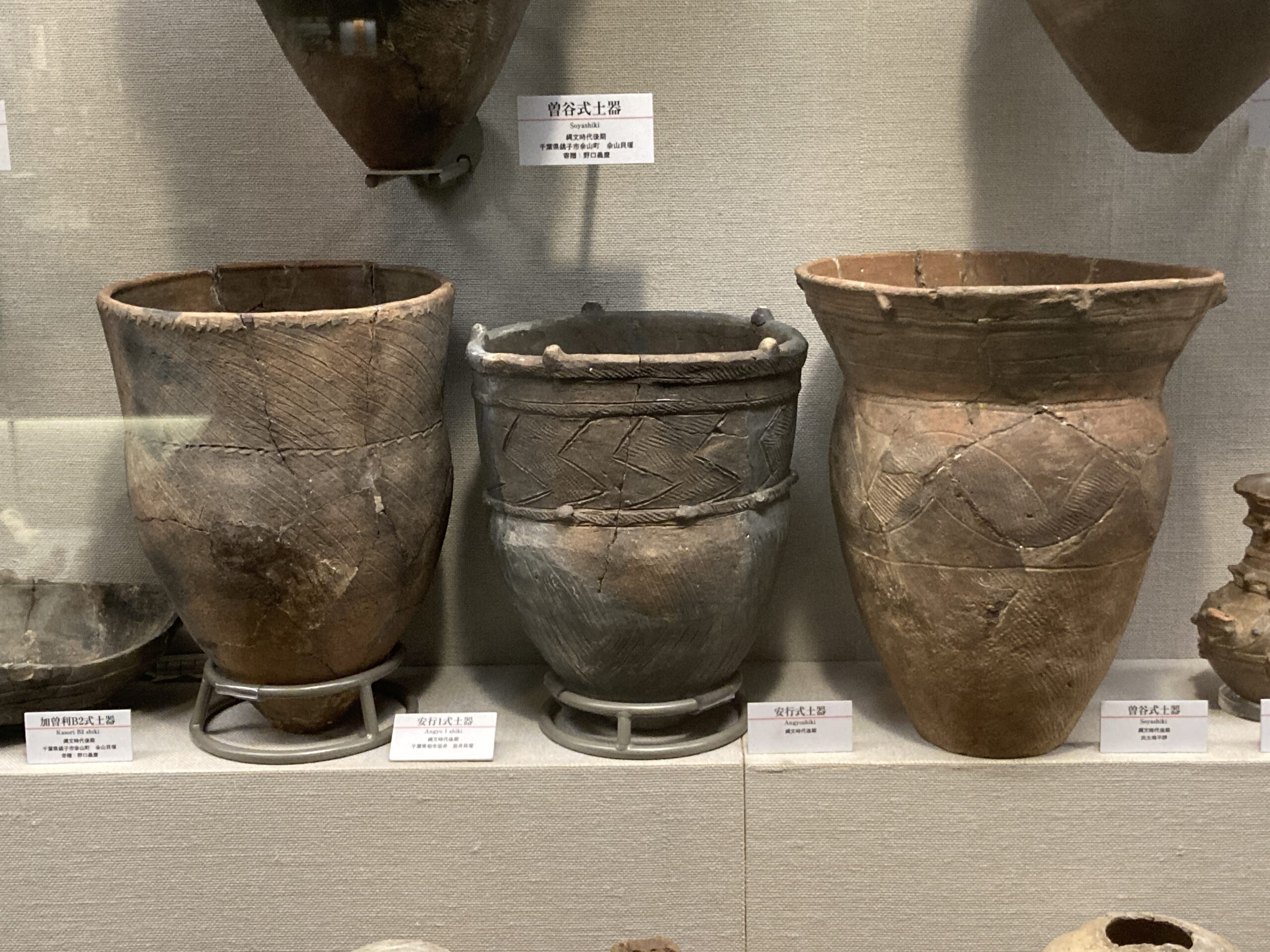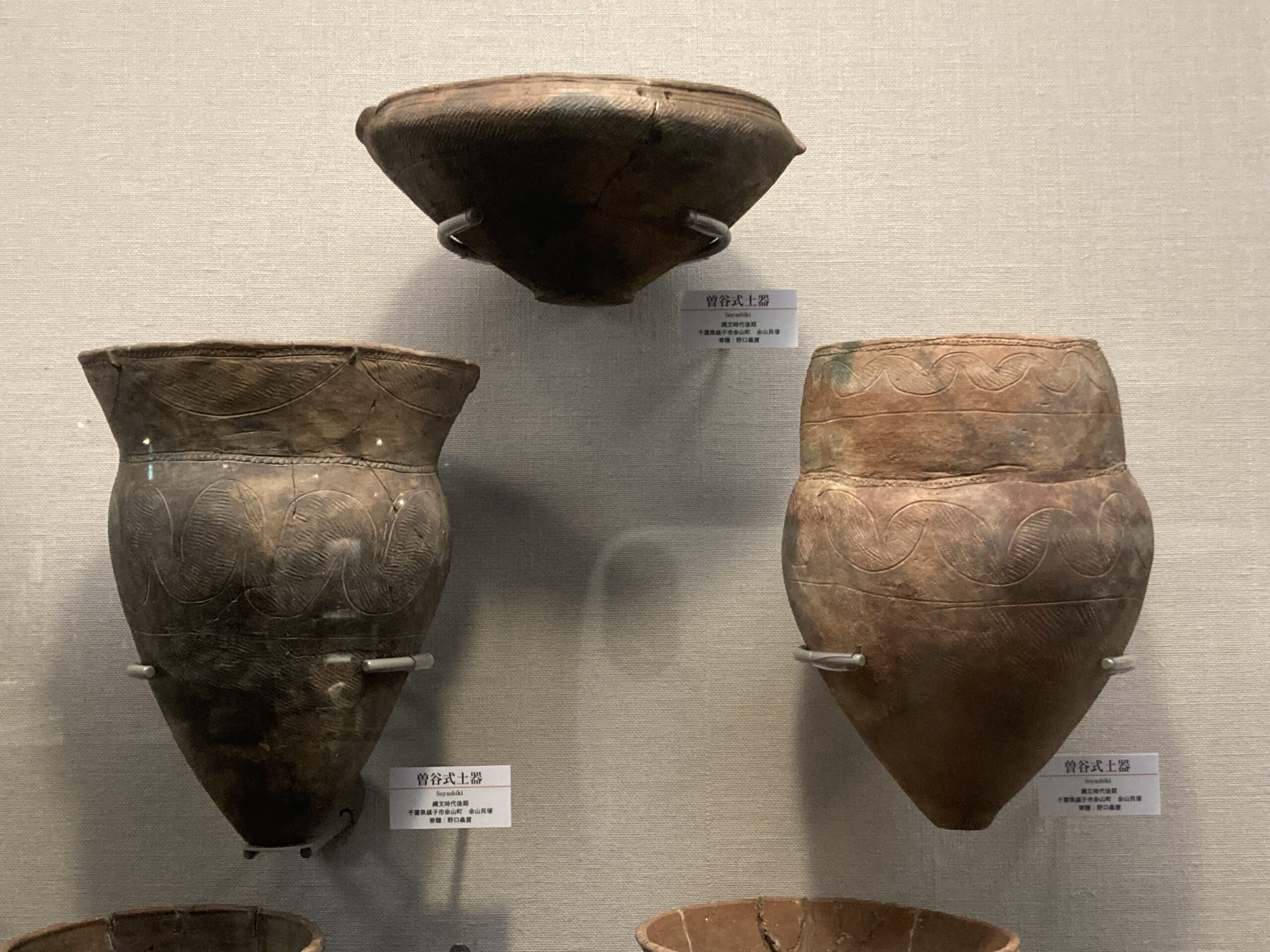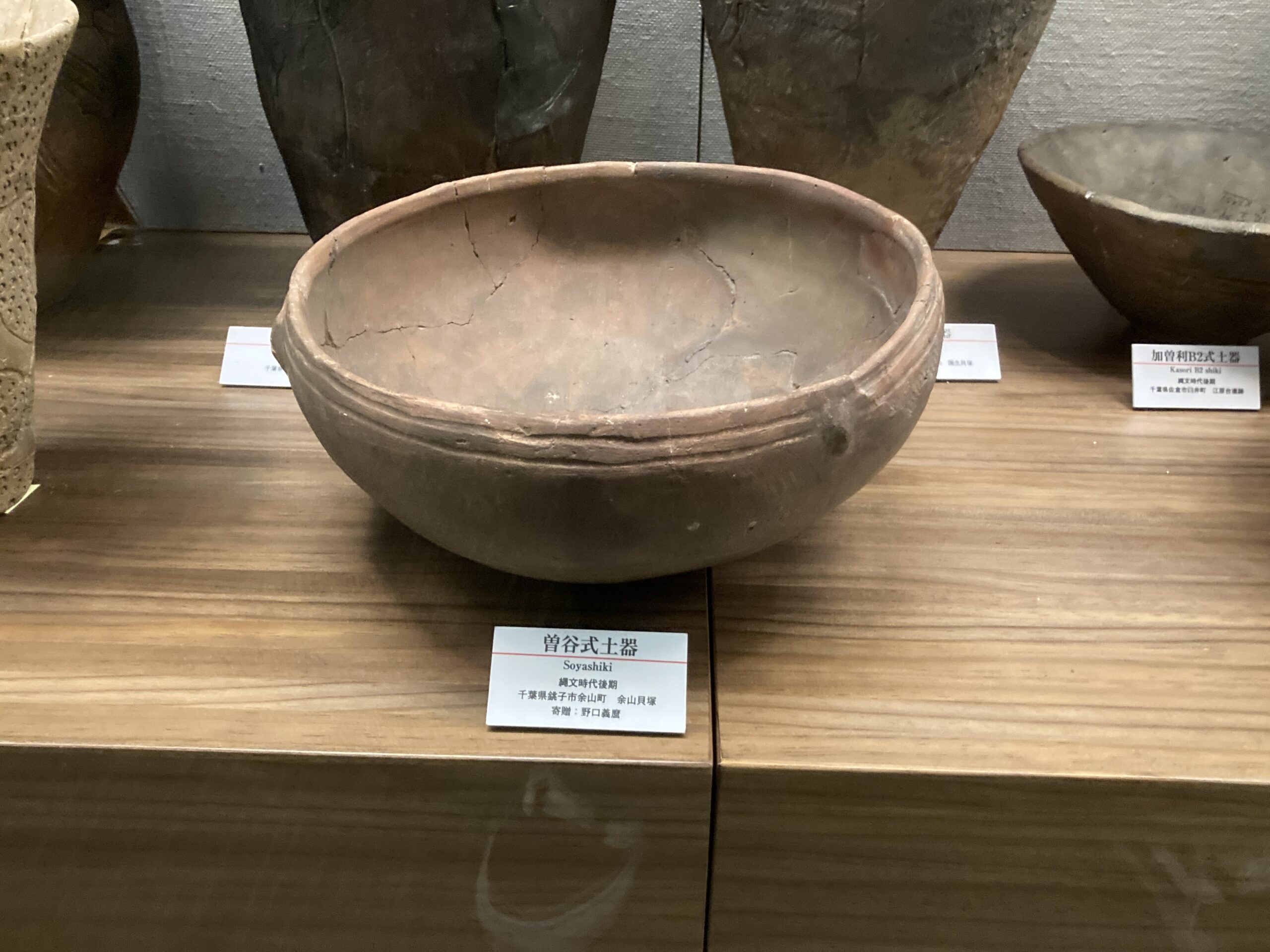 曽谷貝塚から出土した土器。昭和11年(1936年)には、縄文時代研究の大家、山内清男の分層的発掘により、縄文時代後期後葉の「曽谷式土器」が設定されたが、その実体がしばらく不明であったことから、曽谷式土器は長い間「幻の土器」と言われていた。