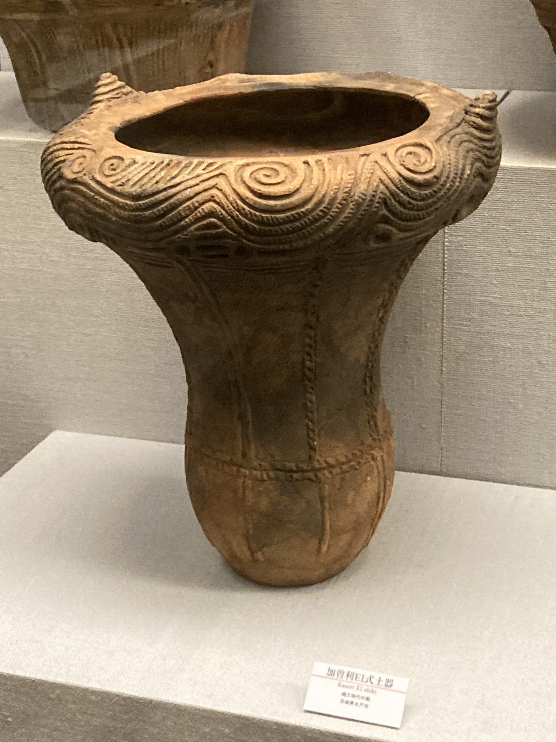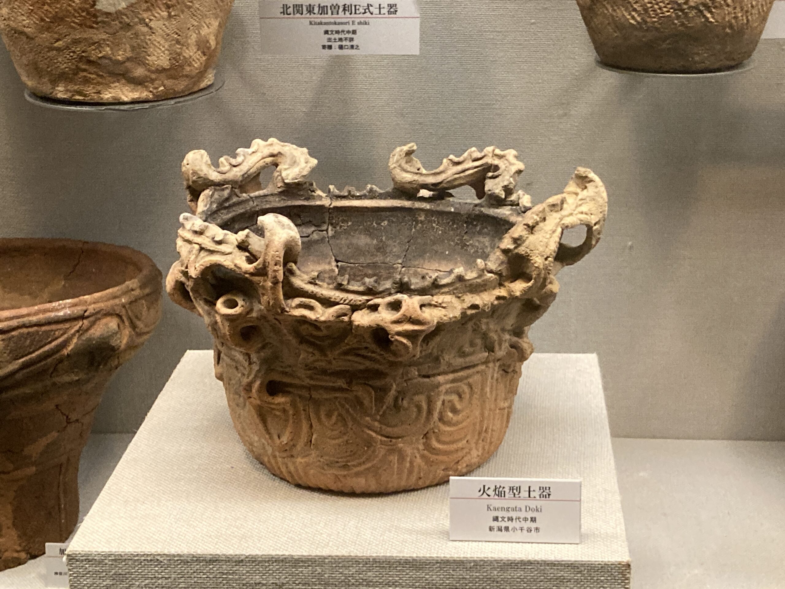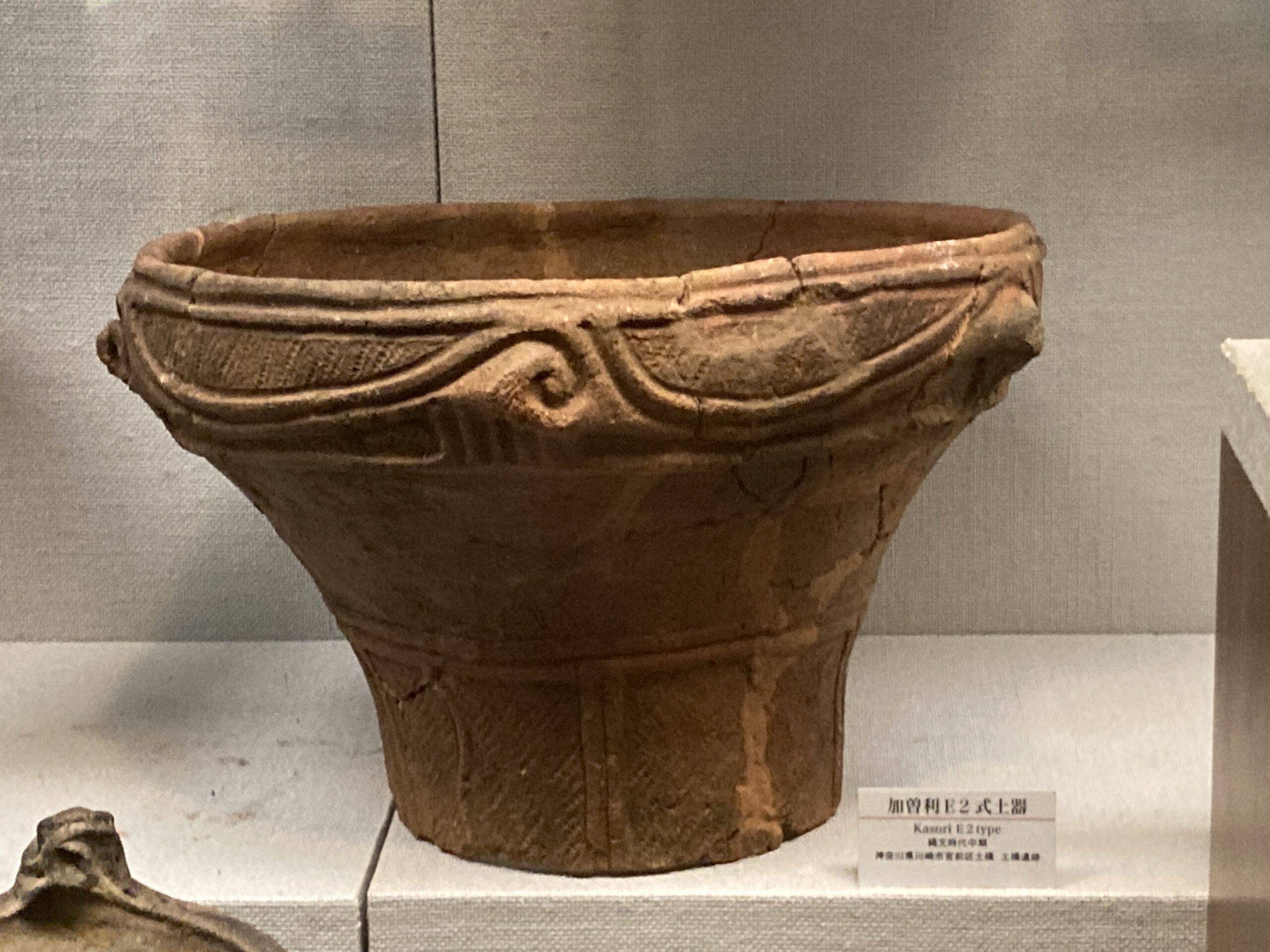 加曽利E式土器(かそりEしきどき)。標式は千葉県千葉市若葉区の国特別史跡・加曽利貝塚のE地点。加曽利貝塚のB地点は、後期の加曽利B式土器(かそりBしきどき)の標式遺跡となっている。