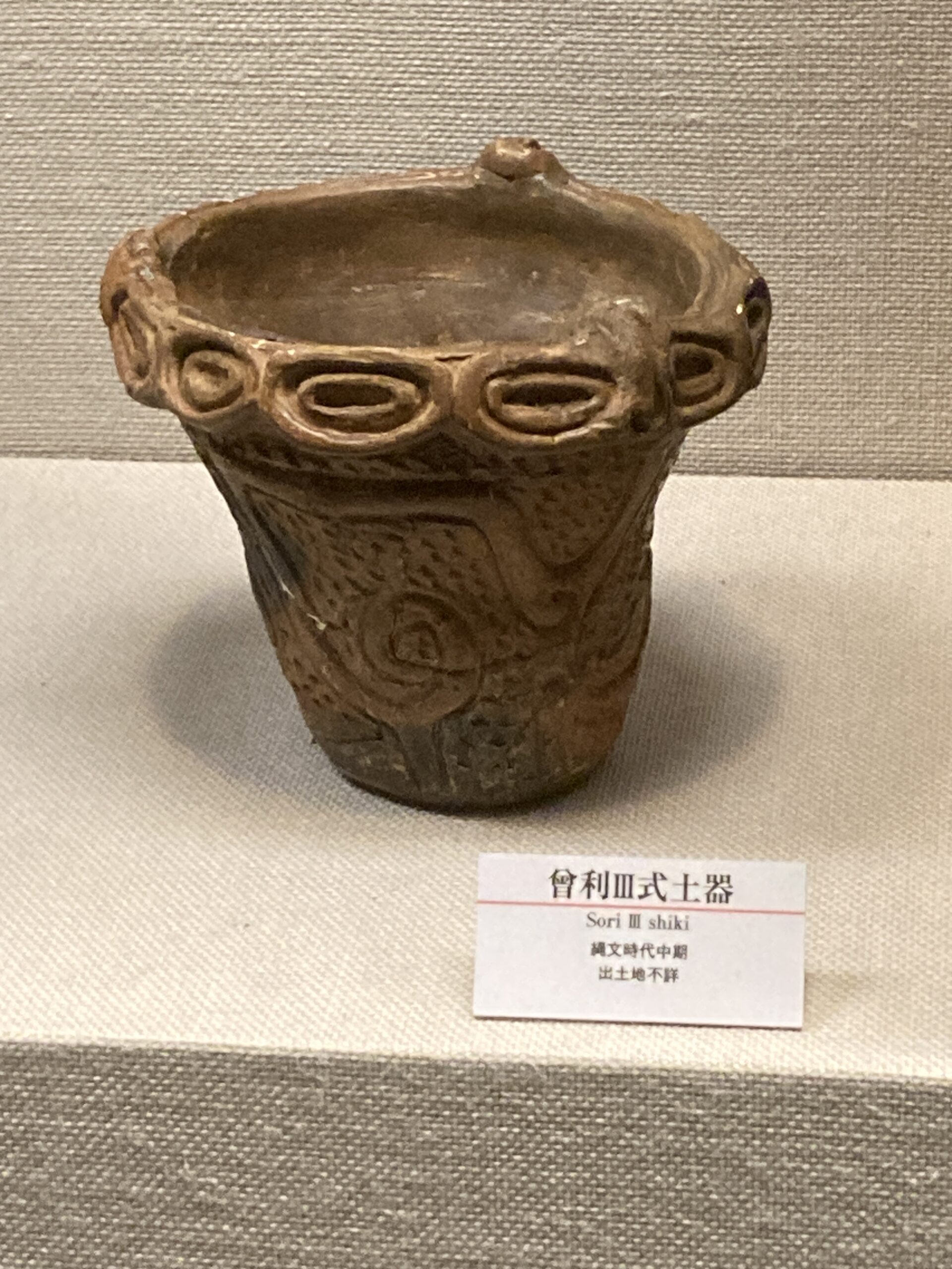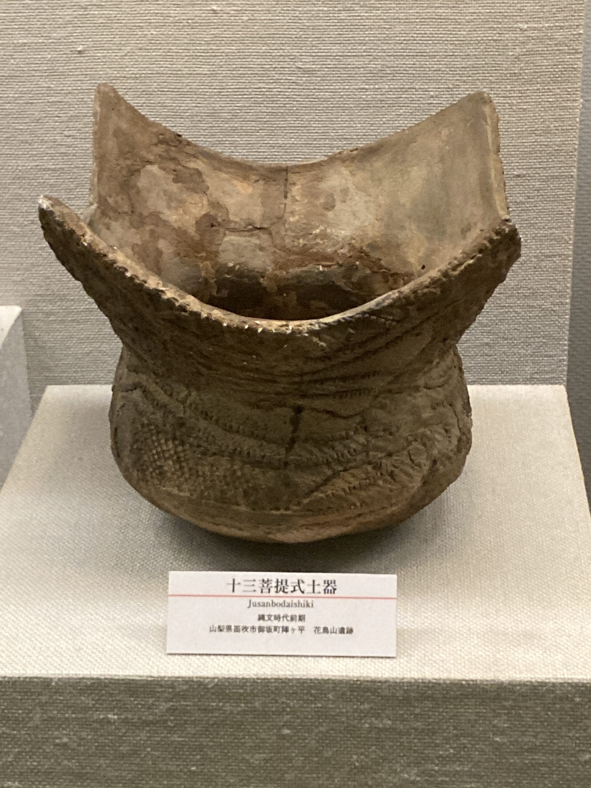 十三菩提式土器(じゅうさんぼだいしきどき)。標式は神奈川県川崎市宮前区の十三菩提遺跡。縄文時代前期の終わり頃(約5500年〜5000年前)の土器で、口唇部に立体的な文様が付いているのが特徴、諸磯式土器にも、突起などの立体的な造形はあったが、十三菩提式土器では、粘土紐によってW字や渦巻文を安定的に施すようになった。器面全体のデザインに派手さが増してきているのがポイント。