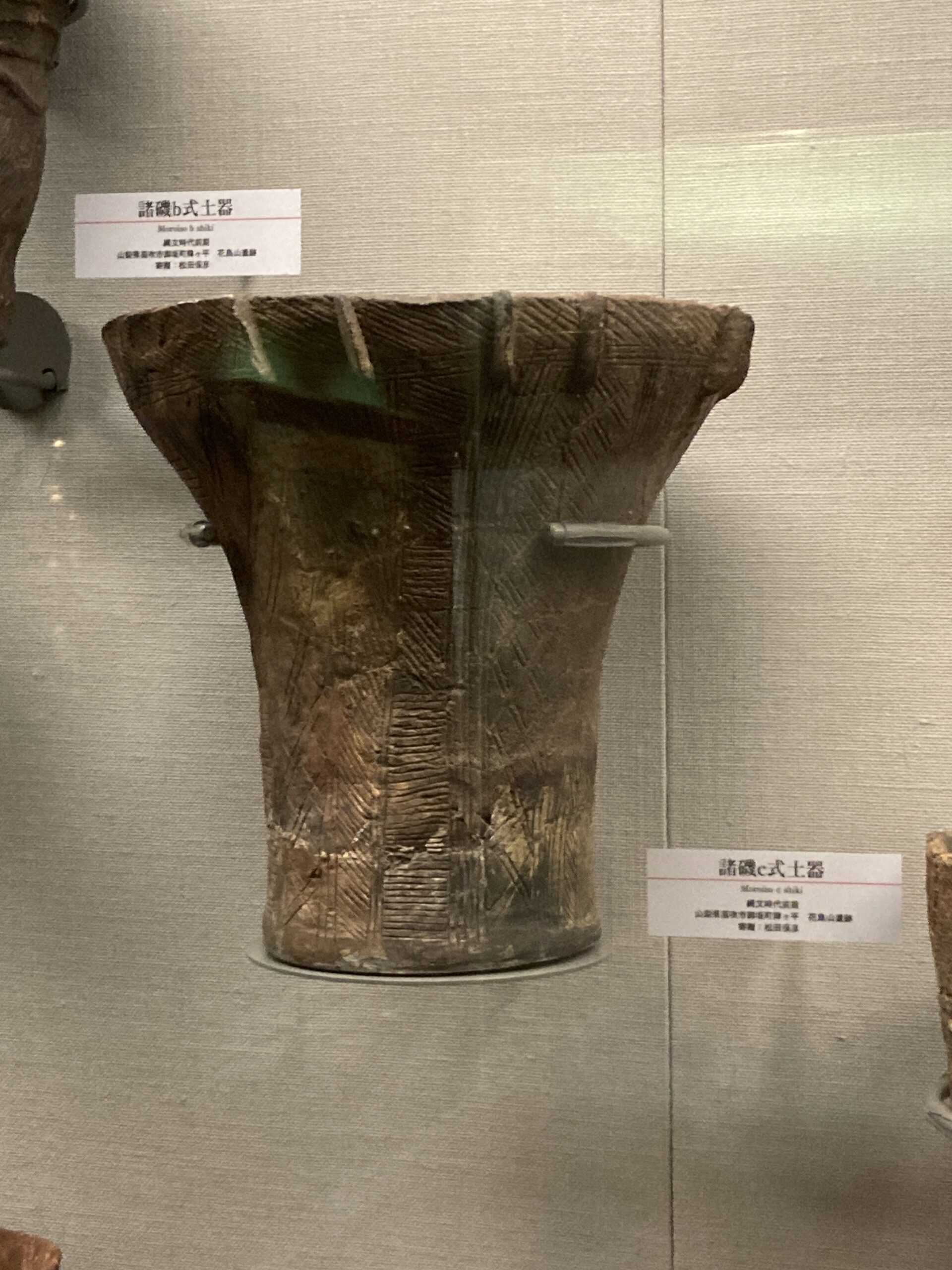 諸磯式土器(もろいそしきどき)。標式は神奈川県三浦市三崎町諸磯遺跡。縄文前期中葉から後葉(約6000〜5000年前)にかけて西関東に広く分布していた土器。