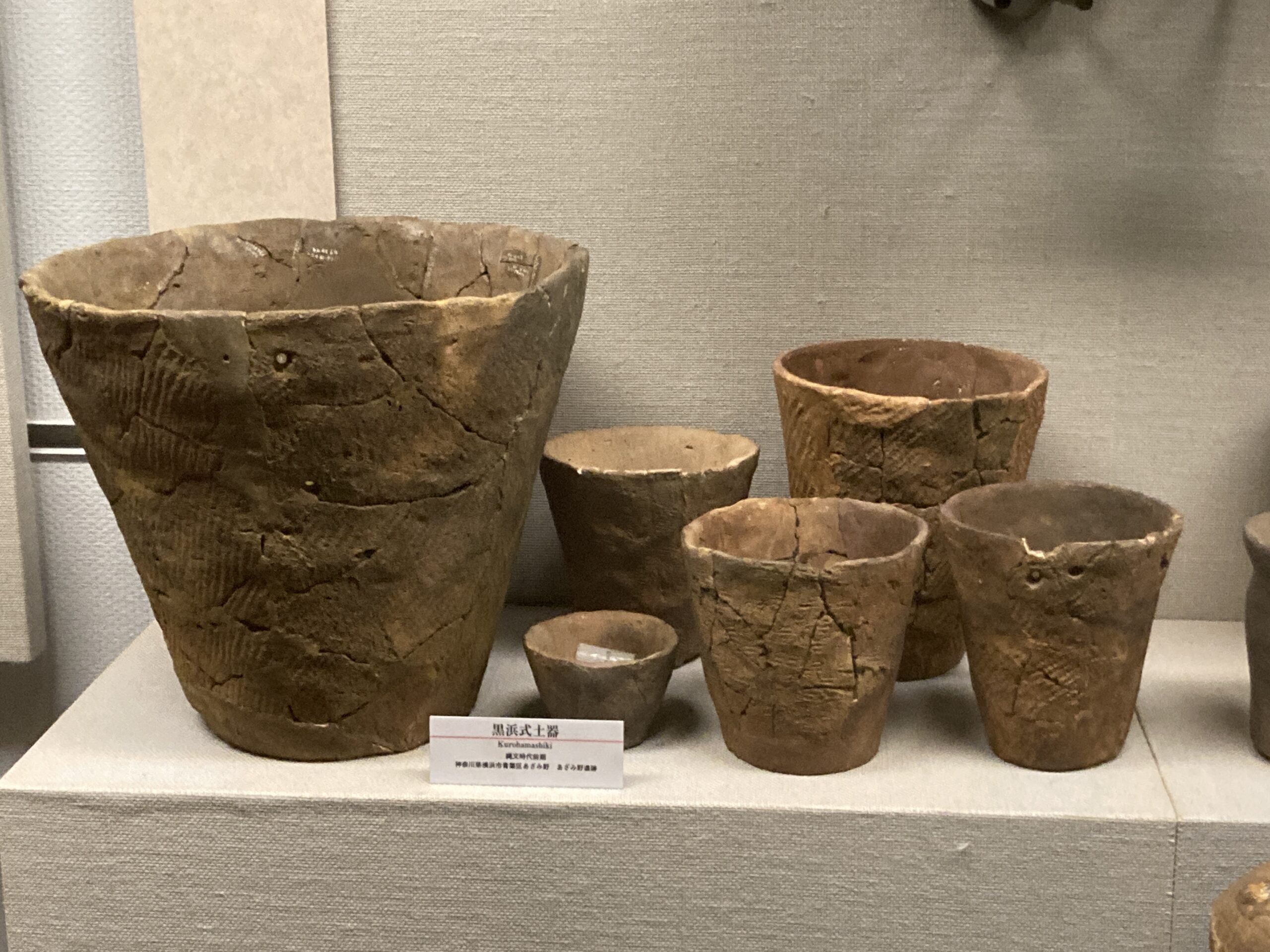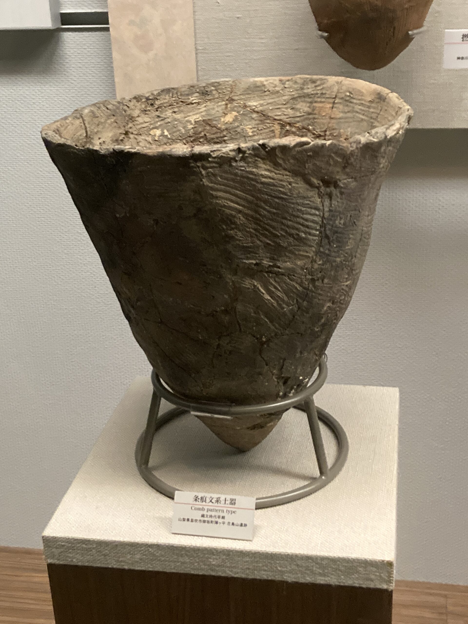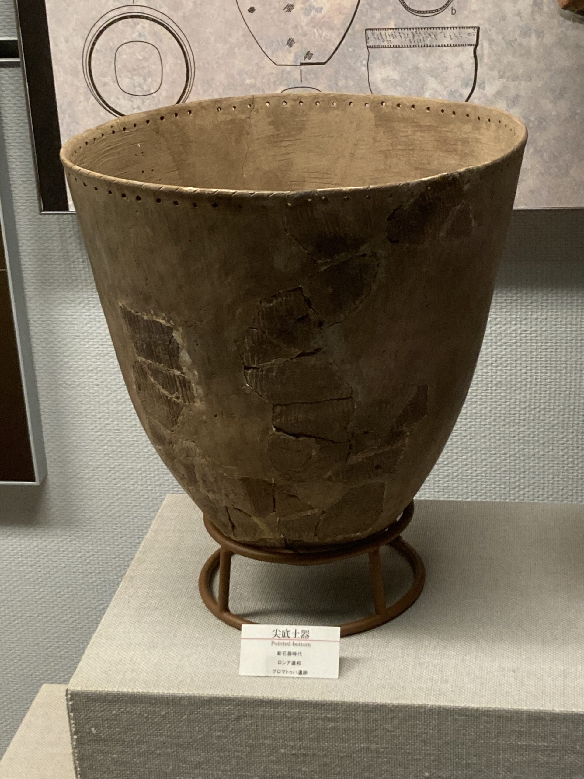 土器が登場した草創期は、シンプルな文様で、底が尖ったタイプの土器が多い。自立できない形から、囲った石の上とかに置いて使ったんじゃないかな?