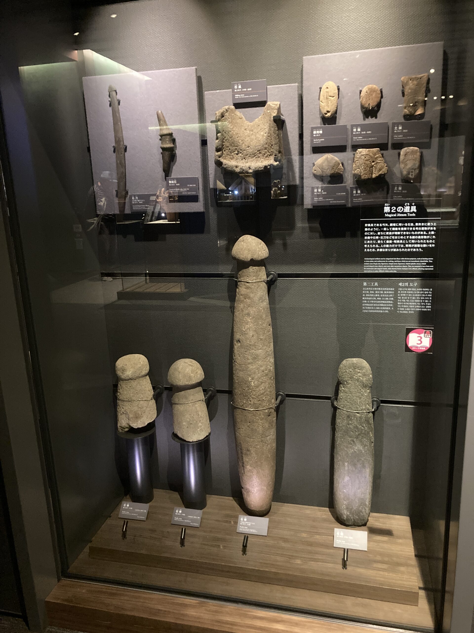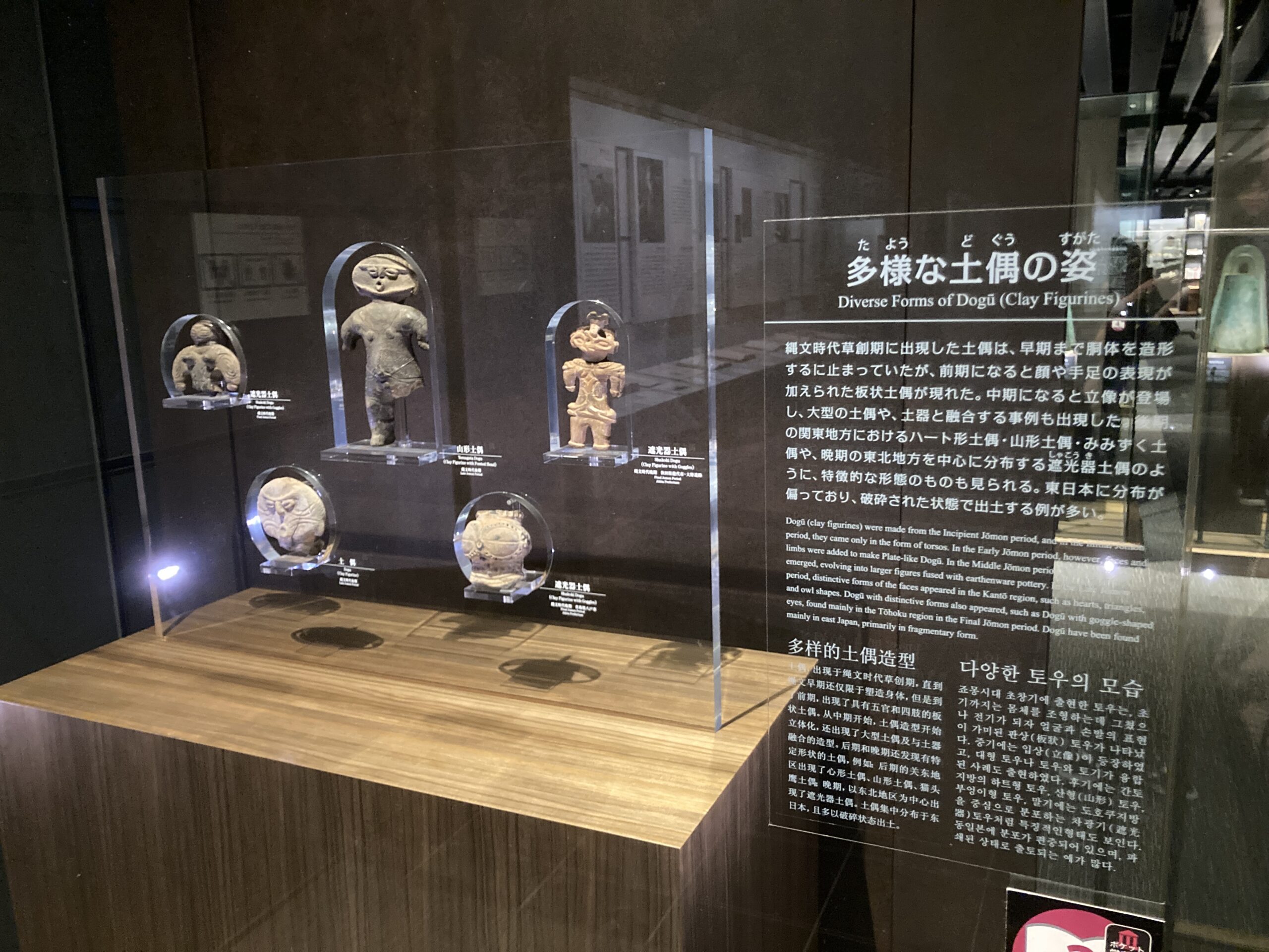 そして縄文土器に並ぶ、縄文時代の花形遺物、土偶のコーナー。日本語だけじゃなくて、英語と中国語と韓国語の解説もしっかり書かれている。多分、土偶は日本独特の風習だっただろうから、珍しいだろうね。