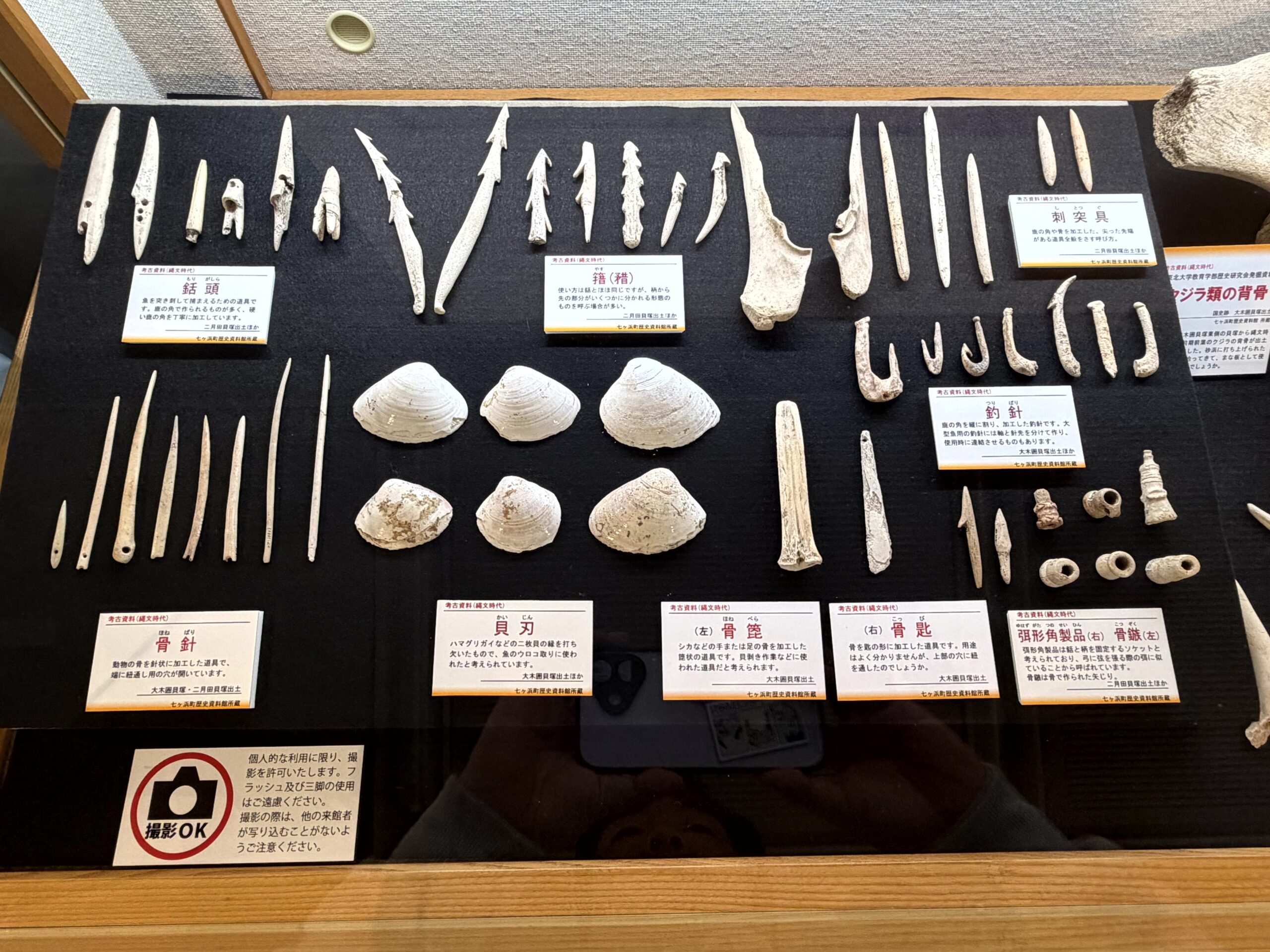 骨や角、牙、貝殻から作られた加工品。釣り針や銛など漁で使う道具、髪・首飾りなどの装飾品。三陸沿岸や仙台湾、福島県いわき地方は漁で使う道具が非常に進化した地域らしく、獲物に合わせて大きさや形を工夫していたらしい。
