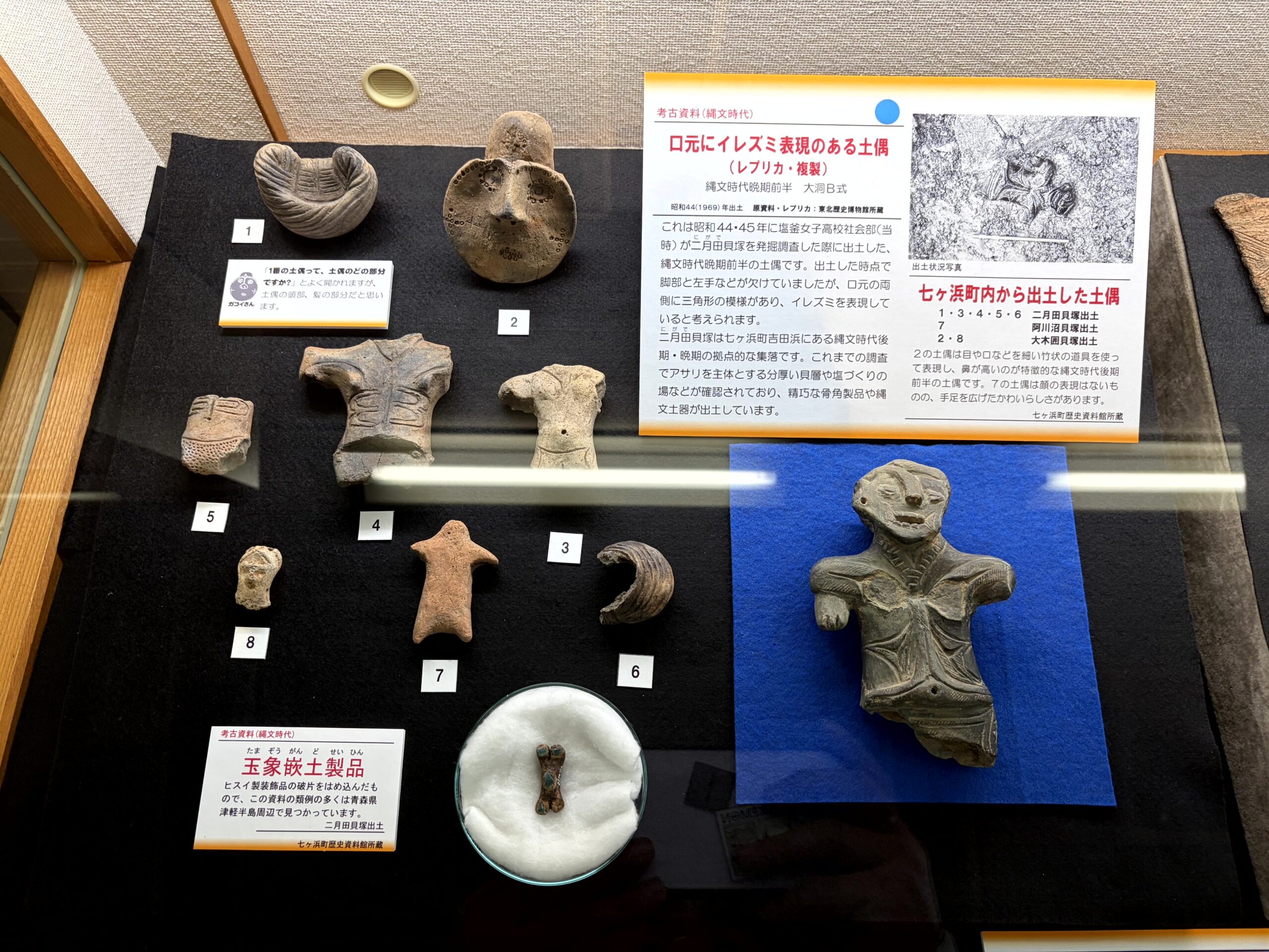 七ヶ浜町で出土した土偶。口元に入れ墨の表現がある土偶とか珍しいものも。あと、青森県の津軽半島で周辺で見つかっている、玉象嵌土製品という「ヒスイ製装飾品の破片をはめ込んだ土製品」も展示されていて、貴重な資料を観れて良かった。