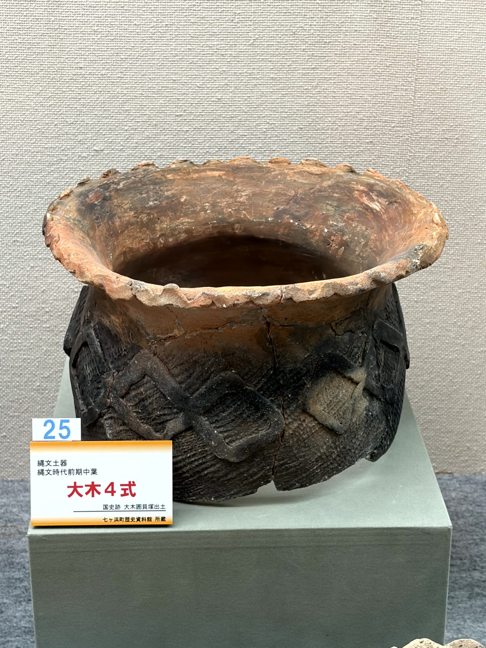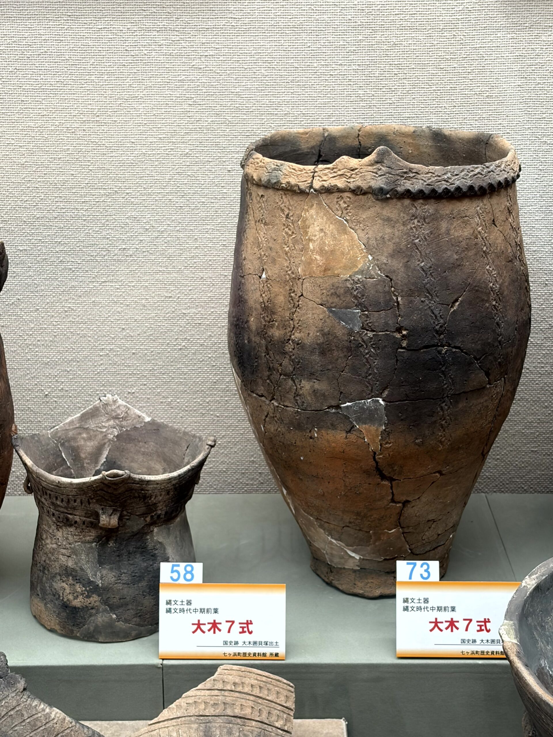 大木7式は縄文時代中期の土器で、7a・7b式に分けられます。関東地方の土器の影響を受けた土器が多く、撚り紐を使った渦巻き文様などが見られるのがポイントです。