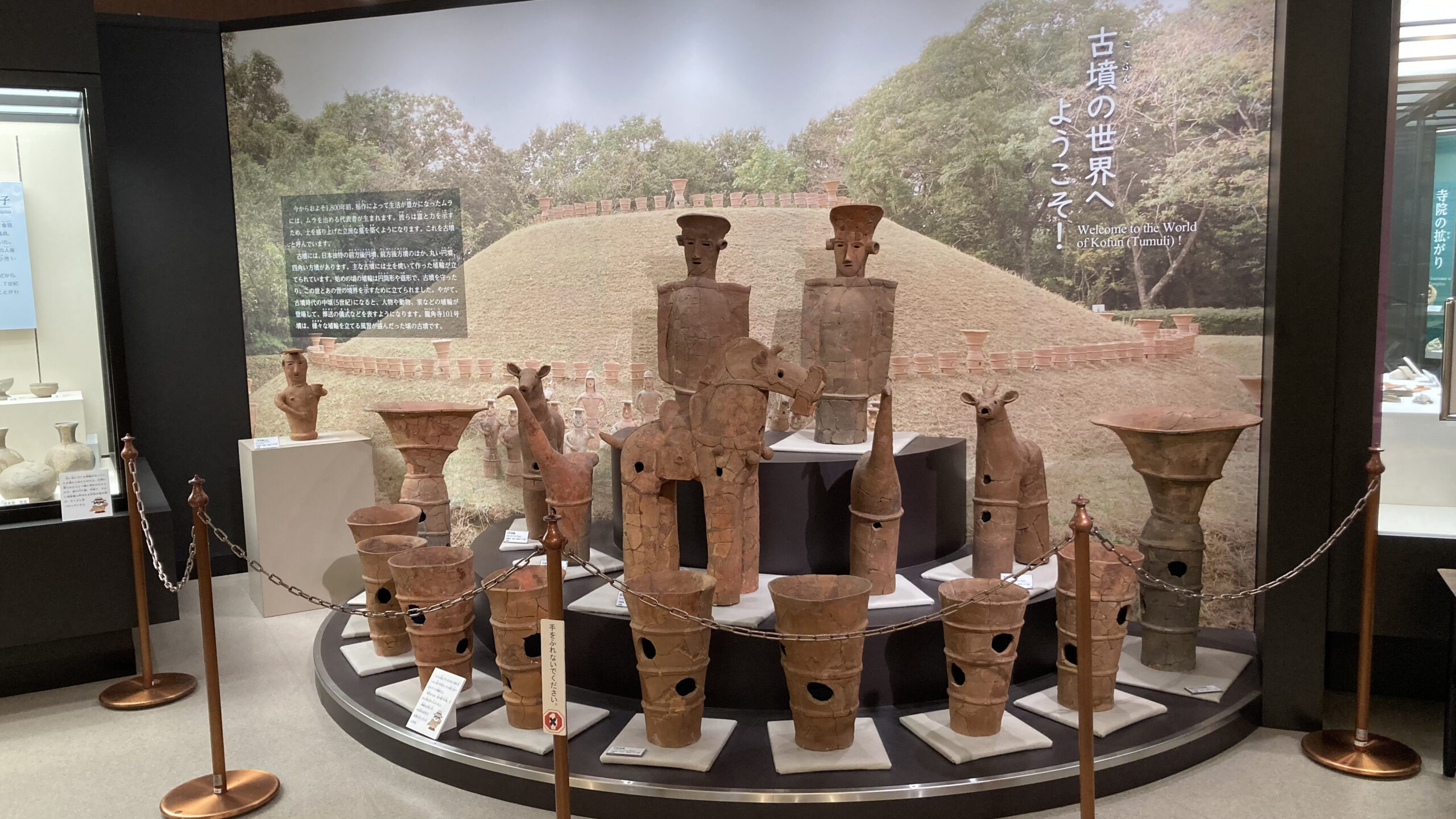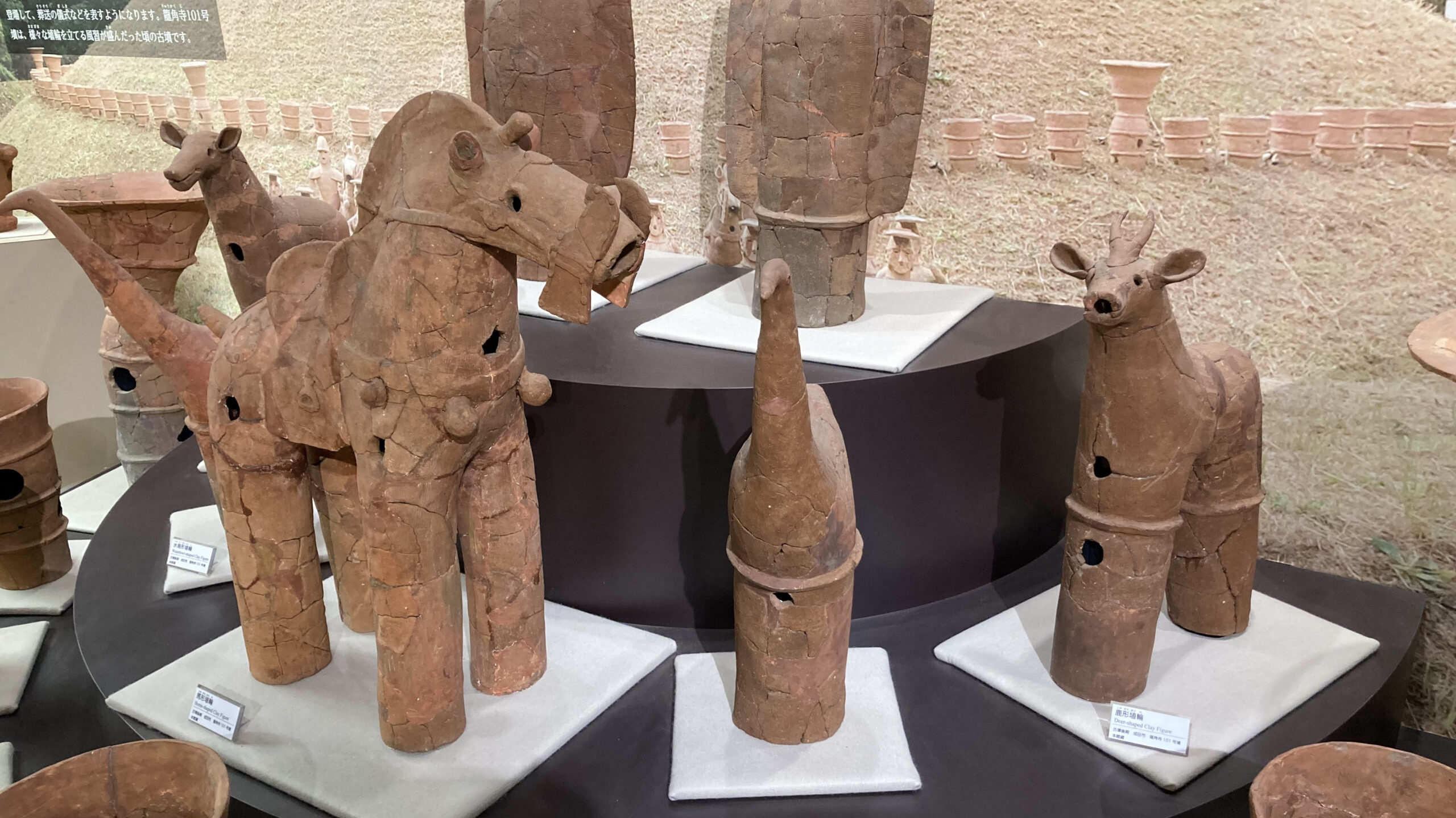 まず、目に入るのが訪問者を出迎えるように並べられた埴輪たち、円筒埴輪や人型埴輪をはじめ、動物埴輪など、かわいい埴輪がずらりと展示されています。埴輪好きにはたまらない演出ですね。
